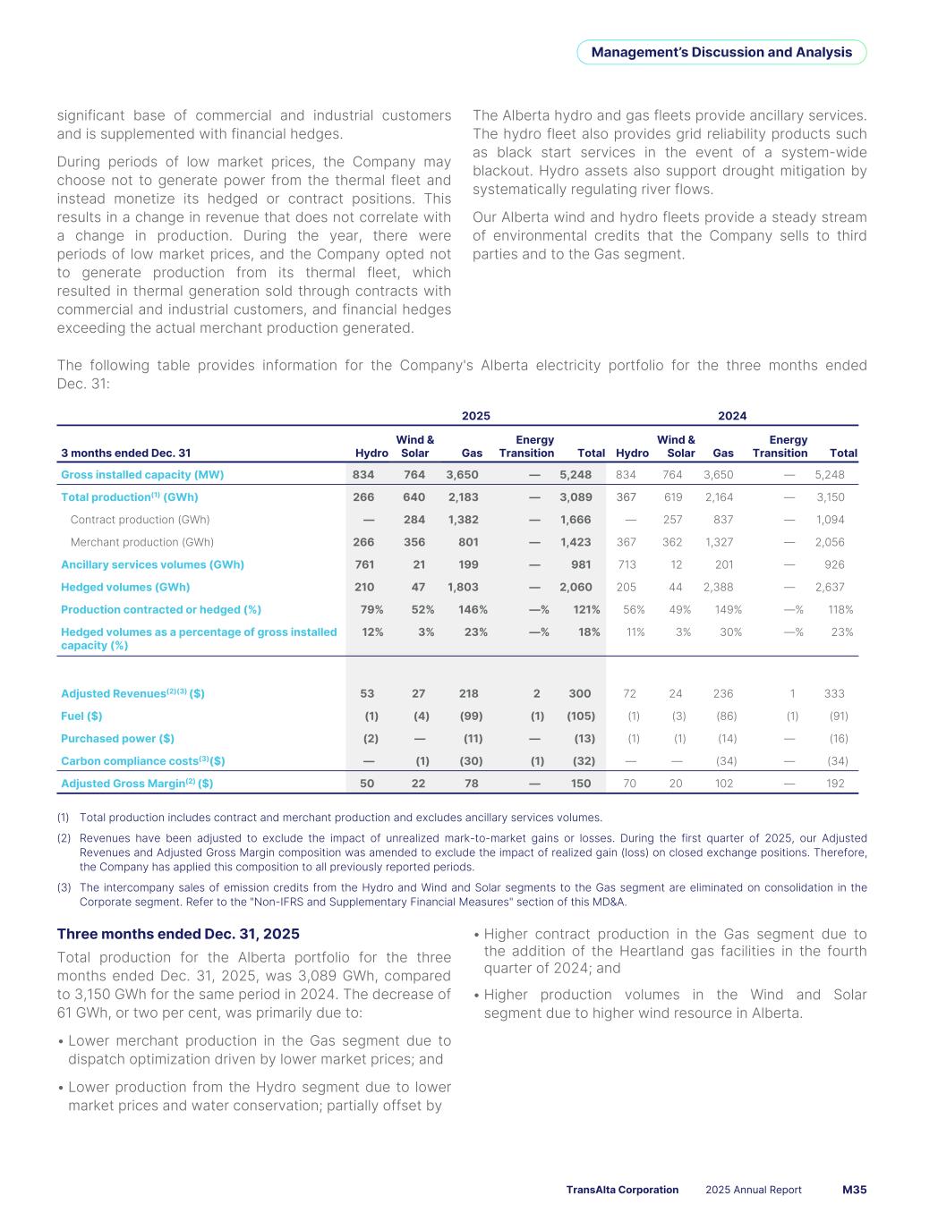 significant base of commercial and industrial customers and is supplemented with financial hedges. During periods of low market prices, the Company may choose not to generate power from the thermal fleet and instead monetize its hedged or contract positions. This results in a change in revenue that does not correlate with a change in production. During the year, there were periods of low market prices, and the Company opted not to generate production from its thermal fleet, which resulted in thermal generation sold through contracts with commercial and industrial customers, and financial hedges exceeding the actual merchant production generated. The Alberta hydro and gas fleets provide ancillary services. The hydro fleet also provides grid reliability products such as black start services in the event of a system-wide blackout. Hydro assets also support drought mitigation by systematically regulating river flows. Our Alberta wind and hydro fleets provide a steady stream of environmental credits that the Company sells to third parties and to the Gas segment. The following table provides information for the Company's Alberta electricity portfolio for the three months ended Dec. 31: 2025 2024 3 months ended Dec. 31 Hydro Wind & Solar Gas Energy Transition Total Hydro Wind & Solar Gas Energy Transition Total Gross installed capacity (MW) 834 764 3,650 — 5,248 834 764 3,650 — 5,248 Total production(1) (GWh) 266 640 2,183 — 3,089 367 619 2,164 — 3,150 Contract production (GWh) — 284 1,382 — 1,666 — 257 837 — 1,094 Merchant production (GWh) 266 356 801 — 1,423 367 362 1,327 — 2,056 Ancillary services volumes (GWh) 761 21 199 — 981 713 12 201 — 926 Hedged volumes (GWh) 210 47 1,803 — 2,060 205 44 2,388 — 2,637 Production contracted or hedged (%) 79% 52% 146% —% 121% 56% 49% 149% —% 118% Hedged volumes as a percentage of gross installed capacity (%) 12% 3% 23% —% 18% 11% 3% 30% —% 23% Adjusted Revenues(2)(3) ($) 53 27 218 2 300 72 24 236 1 333 Fuel ($) (1) (4) (99) (1) (105) (1) (3) (86) (1) (91) Purchased power ($) (2) — (11) — (13) (1) (1) (14) — (16) Carbon compliance costs(3)($) — (1) (30) (1) (32) — — (34) — (34) Adjusted Gross Margin(2) ($) 50 22 78 — 150 70 20 102 — 192 (1) Total production includes contract and merchant production and excludes ancillary services volumes. (2) Revenues have been adjusted to exclude the impact of unrealized mark-to-market gains or losses. During the first quarter of 2025, our Adjusted Revenues and Adjusted Gross Margin composition was amended to exclude the impact of realized gain (loss) on closed exchange positions. Therefore, the Company has applied this composition to all previously reported periods. (3) The intercompany sales of emission credits from the Hydro and Wind and Solar segments to the Gas segment are eliminated on consolidation in the Corporate segment. Refer to the "Non-IFRS and Supplementary Financial Measures" section of this MD&A. Three months ended Dec. 31, 2025 Total production for the Alberta portfolio for the three months ended Dec. 31, 2025, was 3,089 GWh, compared to 3,150 GWh for the same period in 2024. The decrease of 61 GWh, or two per cent, was primarily due to: • Lower merchant production in the Gas segment due to dispatch optimization driven by lower market prices; and • Lower production from the Hydro segment due to lower market prices and water conservation; partially offset by • Higher contract production in the Gas segment due to the addition of the Heartland gas facilities in the fourth quarter of 2024; and • Higher production volumes in the Wind and Solar segment due to higher wind resource in Alberta. TransAlta Corporation 2025 Annual Report M35