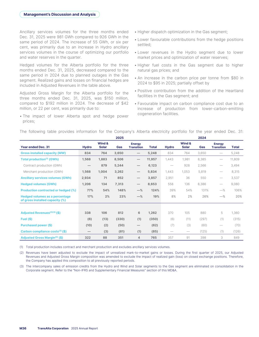 Ancillary services volumes for the three months ended Dec. 31, 2025 were 981 GWh compared to 926 GWh in the same period of 2024. The increase of 55 GWh, or six per cent, was primarily due to an increase in Hydro ancillary services volumes in the course of optimizing our portfolio and water reserves in the quarter. Hedged volumes for the Alberta portfolio for the three months ended Dec. 31, 2025, decreased compared to the same period in 2024 due to planned outages in the Gas segment. Realized gains and losses on financial hedges are included in Adjusted Revenues in the table above. Adjusted Gross Margin for the Alberta portfolio for the three months ended Dec. 31, 2025, was $150 million, compared to $192 million in 2024. The decrease of $42 million, or 22 per cent, was primarily due to: • The impact of lower Alberta spot and hedge power prices; • Higher dispatch optimization in the Gas segment; • Lower favourable contributions from the hedge positions settled; • Lower revenues in the Hydro segment due to lower market prices and optimization of water reserves; • Higher fuel costs in the Gas segment due to higher natural gas prices; and • An increase in the carbon price per tonne from $80 in 2024 to $95 in 2025; partially offset by • Positive contribution from the addition of the Heartland facilities in the Gas segment; and • Favourable impact on carbon compliance cost due to an increase of production from lower-carbon-emitting cogeneration facilities. The following table provides information for the Company's Alberta electricity portfolio for the year ended Dec.  31: 2025 2024 Year ended Dec. 31 Hydro Wind & Solar Gas Energy Transition Total Hydro Wind & Solar Gas Energy Transition Total Gross installed capacity (MW) 834 764 3,650 — 5,248 834 764 3,650 — 5,248 Total production(1) (GWh) 1,568 1,883 8,506 — 11,957 1,443 1,981 8,385 — 11,809 Contract production (GWh) — 879 5,244 — 6,123 — 928 2,566 — 3,494 Merchant production (GWh) 1,568 1,004 3,262 — 5,834 1,443 1,053 5,819 — 8,315 Ancillary services volumes (GWh) 2,934 71 852 — 3,857 2,951 36 550 — 3,537 Hedged volumes (GWh) 1,206 134 7,313 — 8,653 558 136 8,386 — 9,080 Production contracted or hedged (%) 77% 54% 148% —% 124% 39% 54% 131% —% 106% Hedged volumes as a percentage of gross installed capacity (%) 17% 2% 23% —% 19% 8% 2% 26% —% 20% Adjusted Revenues(2)(3) ($) 338 106 812 6 1,262 370 105 880 5 1,360 Fuel ($) (6) (13) (330) (1) (350) (6) (11) (297) (1) (315) Purchased power ($) (10) (2) (50) — (62) (7) (3) (60) — (70) Carbon compliance costs(3) ($) — (3) (81) (1) (85) — — (125) (1) (126) Adjusted Gross Margin(2) ($) 322 88 351 4 765 357 91 398 3 849 (1) Total production includes contract and merchant production and excludes ancillary services volumes. (2) Revenues have been adjusted to exclude the impact of unrealized mark-to-market gains or losses. During the first quarter of 2025, our Adjusted Revenues and Adjusted Gross Margin composition was amended to exclude the impact of realized gain (loss) on closed exchange positions. Therefore, the Company has applied this composition to all previously reported periods. (3) The intercompany sales of emission credits from the Hydro and Wind and Solar segments to the Gas segment are eliminated on consolidation in the Corporate segment. Refer to the "Non-IFRS and Supplementary Financial Measures" section of this MD&A. M36 TransAlta Corporation 2025 Annual Report