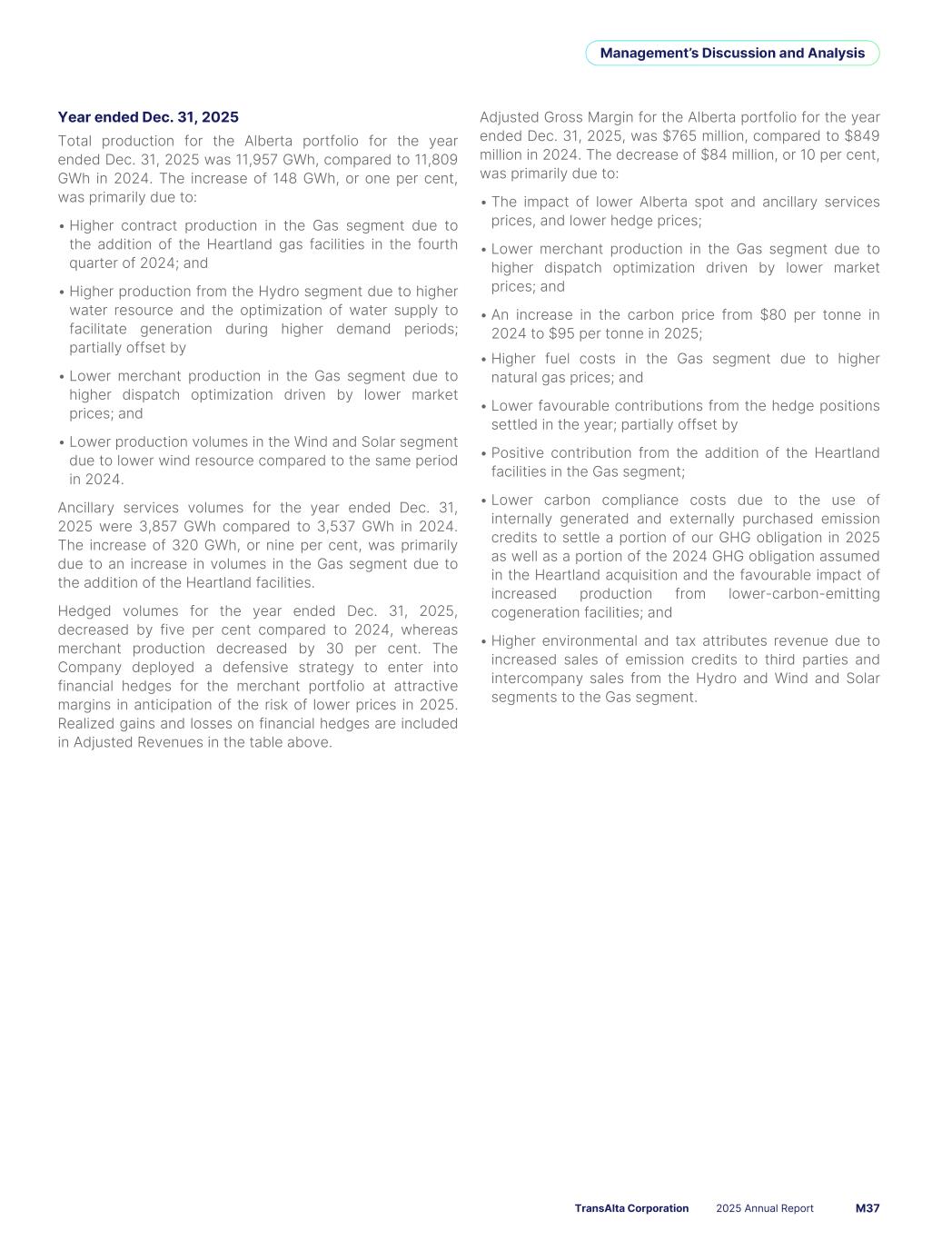 Year ended Dec. 31, 2025 Total production for the Alberta portfolio for the year ended Dec. 31, 2025 was 11,957 GWh, compared to 11,809 GWh in 2024. The increase of 148 GWh, or one per cent, was primarily due to: • Higher contract production in the Gas segment due to the addition of the Heartland gas facilities in the fourth quarter of 2024; and • Higher production from the Hydro segment due to higher water resource and the optimization of water supply to facilitate generation during higher demand periods; partially offset by • Lower merchant production in the Gas segment due to higher dispatch optimization driven by lower market prices; and • Lower production volumes in the Wind and Solar segment due to lower wind resource compared to the same period in 2024. Ancillary services volumes for the year ended Dec. 31, 2025 were 3,857 GWh compared to 3,537 GWh in 2024. The increase of 320 GWh, or nine per cent, was primarily due to an increase in volumes in the Gas segment due to the addition of the Heartland facilities. Hedged volumes for the year ended Dec. 31, 2025, decreased by five per cent compared to 2024, whereas merchant production decreased by 30 per cent. The Company deployed a defensive strategy to enter into financial hedges for the merchant portfolio at attractive margins in anticipation of the risk of lower prices in 2025. Realized gains and losses on financial hedges are included in Adjusted Revenues in the table above. Adjusted Gross Margin for the Alberta portfolio for the year ended Dec. 31, 2025, was $765 million, compared to $849 million in 2024. The decrease of $84 million, or 10 per cent, was primarily due to: • The impact of lower Alberta spot and ancillary services prices, and lower hedge prices; • Lower merchant production in the Gas segment due to higher dispatch optimization driven by lower market prices; and • An increase in the carbon price from $80 per tonne in 2024 to $95 per tonne in 2025; • Higher fuel costs in the Gas segment due to higher natural gas prices; and • Lower favourable contributions from the hedge positions settled in the year; partially offset by • Positive contribution from the addition of the Heartland facilities in the Gas segment; • Lower carbon compliance costs due to the use of internally generated and externally purchased emission credits to settle a portion of our GHG obligation in 2025 as well as a portion of the 2024 GHG obligation assumed in the Heartland acquisition and the favourable impact of increased production from lower-carbon-emitting cogeneration facilities; and • Higher environmental and tax attributes revenue due to increased sales of emission credits to third parties and intercompany sales from the Hydro and Wind and Solar segments to the Gas segment. TransAlta Corporation 2025 Annual Report M37