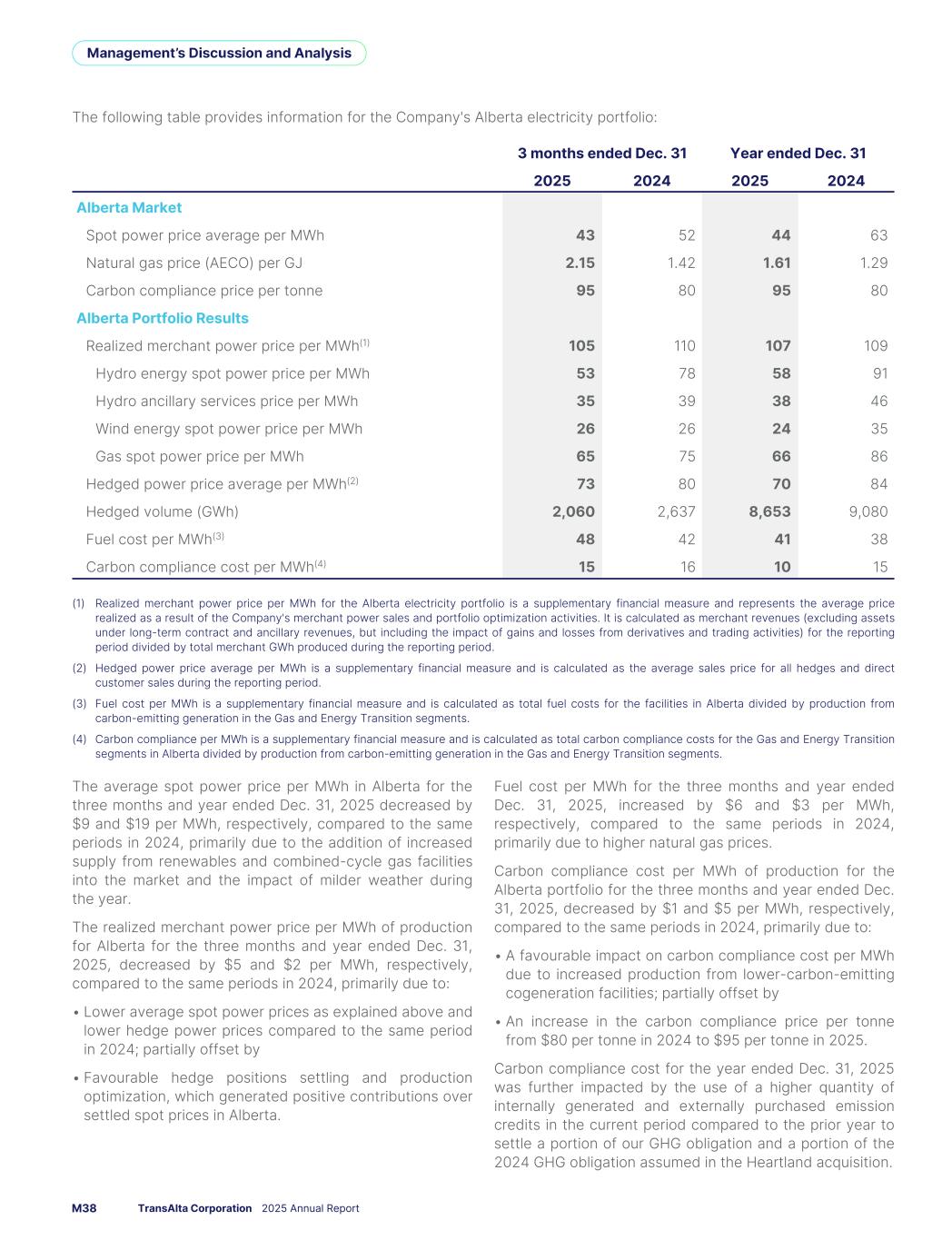 The following table provides information for the Company's Alberta electricity portfolio: 3 months ended Dec. 31 Year ended Dec. 31 2025 2024 2025 2024 Alberta Market Spot power price average per MWh 43 52 44 63 Natural gas price (AECO) per GJ 2.15 1.42 1.61 1.29 Carbon compliance price per tonne 95 80 95 80 Alberta Portfolio Results Realized merchant power price per MWh(1) 105 110 107 109 Hydro energy spot power price per MWh 53 78 58 91 Hydro ancillary services price per MWh 35 39 38 46 Wind energy spot power price per MWh 26 26 24 35 Gas spot power price per MWh 65 75 66 86 Hedged power price average per MWh(2) 73 80 70 84 Hedged volume (GWh) 2,060 2,637 8,653 9,080 Fuel cost per MWh(3) 48 42 41 38 Carbon compliance cost per MWh(4) 15 16 10 15 (1) Realized merchant power price per MWh for the Alberta electricity portfolio is a supplementary financial measure and represents the average price realized as a result of the Company's merchant power sales and portfolio optimization activities. It is calculated as merchant revenues (excluding assets under long-term contract and ancillary revenues, but including the impact of gains and losses from derivatives and trading activities) for the reporting period divided by total merchant GWh produced during the reporting period. (2) Hedged power price average per MWh is a supplementary financial measure and is calculated as the average sales price for all hedges and direct customer sales during the reporting period. (3) Fuel cost per MWh is a supplementary financial measure and is calculated as total fuel costs for the facilities in Alberta divided by production from carbon-emitting generation in the Gas and Energy Transition segments. (4) Carbon compliance per MWh is a supplementary financial measure and is calculated as total carbon compliance costs for the Gas and Energy Transition segments in Alberta divided by production from carbon-emitting generation in the Gas and Energy Transition segments. The average spot power price per MWh in Alberta for the three months and year ended Dec. 31, 2025 decreased by $9 and $19 per MWh, respectively, compared to the same periods in 2024, primarily due to the addition of increased supply from renewables and combined-cycle gas facilities into the market and the impact of milder weather during the year. The realized merchant power price per MWh of production for Alberta for the three months and year ended Dec. 31, 2025, decreased by $5 and $2 per MWh, respectively, compared to the same periods in 2024, primarily due to: • Lower average spot power prices as explained above and lower hedge power prices compared to the same period in 2024; partially offset by • Favourable hedge positions settling and production optimization, which generated positive contributions over settled spot prices in Alberta. Fuel cost per MWh for the three months and year ended Dec. 31, 2025, increased by $6 and $3 per MWh, respectively, compared to the same periods in 2024, primarily due to higher natural gas prices. Carbon compliance cost per MWh of production for the Alberta portfolio for the three months and year ended Dec. 31, 2025, decreased by $1 and $5 per MWh, respectively, compared to the same periods in 2024, primarily due to: • A favourable impact on carbon compliance cost per MWh due to increased production from lower-carbon-emitting cogeneration facilities; partially offset by • An increase in the carbon compliance price per tonne from $80 per tonne in 2024 to $95 per tonne in 2025. Carbon compliance cost for the year ended Dec. 31, 2025 was further impacted by the use of a higher quantity of internally generated and externally purchased emission credits in the current period compared to the prior year to settle a portion of our GHG obligation and a portion of the 2024 GHG obligation assumed in the Heartland acquisition. M38 TransAlta Corporation 2025 Annual Report