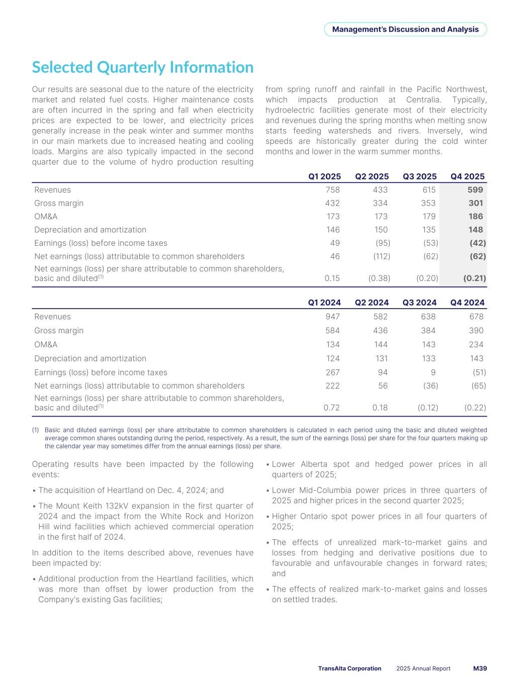 Selected Quarterly Information Our results are seasonal due to the nature of the electricity market and related fuel costs. Higher maintenance costs are often incurred in the spring and fall when electricity prices are expected to be lower, and electricity prices generally increase in the peak winter and summer months in our main markets due to increased heating and cooling loads. Margins are also typically impacted in the second quarter due to the volume of hydro production resulting from spring runoff and rainfall in the Pacific Northwest, which impacts production at Centralia. Typically, hydroelectric facilities generate most of their electricity and revenues during the spring months when melting snow starts feeding watersheds and rivers. Inversely, wind speeds are historically greater during the cold winter months and lower in the warm summer months.   Q1 2025 Q2 2025 Q3 2025 Q4 2025 Revenues 758 433 615 599 Gross margin 432 334 353 301 OM&A 173 173 179 186 Depreciation and amortization 146 150 135 148 Earnings (loss) before income taxes 49 (95) (53) (42) Net earnings (loss) attributable to common shareholders 46 (112) (62) (62) Net earnings (loss) per share attributable to common shareholders, basic and diluted(1) 0.15 (0.38) (0.20) (0.21) Q1 2024 Q2 2024 Q3 2024 Q4 2024 Revenues 947 582 638 678 Gross margin 584 436 384 390 OM&A 134 144 143 234 Depreciation and amortization 124 131 133 143 Earnings (loss) before income taxes 267 94 9 (51) Net earnings (loss) attributable to common shareholders 222 56 (36) (65) Net earnings (loss) per share attributable to common shareholders, basic and diluted(1) 0.72 0.18 (0.12) (0.22) (1) Basic and diluted earnings (loss) per share attributable to common shareholders is calculated in each period using the basic and diluted weighted average common shares outstanding during the period, respectively. As a result, the sum of the earnings (loss) per share for the four quarters making up the calendar year may sometimes differ from the annual earnings (loss) per share. Operating results have been impacted by the following events: • The acquisition of Heartland on Dec. 4, 2024; and • The Mount Keith 132kV expansion in the first quarter of 2024 and the impact from the White Rock and Horizon Hill wind facilities which achieved commercial operation in the first half of 2024. In addition to the items described above, revenues have been impacted by: • Additional production from the Heartland facilities, which was more than offset by lower production from the Company's existing Gas facilities; • Lower Alberta spot and hedged power prices in all quarters of 2025; • Lower Mid-Columbia power prices in three quarters of 2025 and higher prices in the second quarter 2025; • Higher Ontario spot power prices in all four quarters of 2025; • The effects of unrealized mark-to-market gains and losses from hedging and derivative positions due to favourable and unfavourable changes in forward rates; and • The effects of realized mark-to-market gains and losses on settled trades. TransAlta Corporation 2025 Annual Report M39