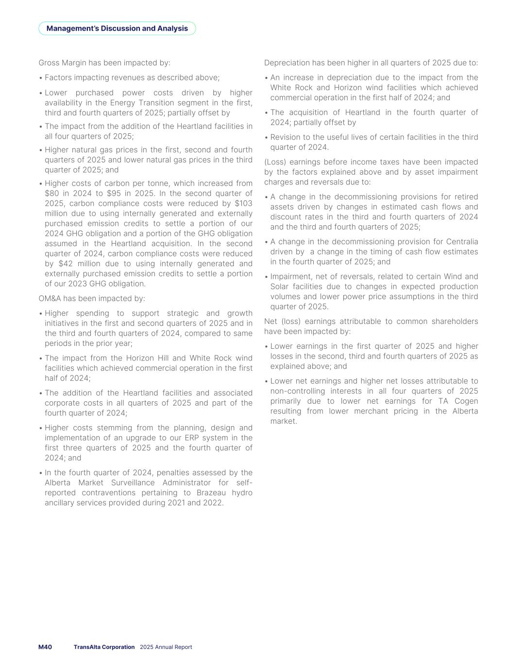 Gross Margin has been impacted by: • Factors impacting revenues as described above; • Lower purchased power costs driven by higher availability in the Energy Transition segment in the first, third and fourth quarters of 2025; partially offset by • The impact from the addition of the Heartland facilities in all four quarters of 2025; • Higher natural gas prices in the first, second and fourth quarters of 2025 and lower natural gas prices in the third quarter of 2025; and • Higher costs of carbon per tonne, which increased from $80 in 2024 to $95 in 2025. In the second quarter of 2025, carbon compliance costs were reduced by $103 million due to using internally generated and externally purchased emission credits to settle a portion of our 2024 GHG obligation and a portion of the GHG obligation assumed in the Heartland acquisition. In the second quarter of 2024, carbon compliance costs were reduced by $42 million due to using internally generated and externally purchased emission credits to settle a portion of our 2023 GHG obligation. OM&A has been impacted by: • Higher spending to support strategic and growth initiatives in the first and second quarters of 2025 and in the third and fourth quarters of 2024, compared to same periods in the prior year; • The impact from the Horizon Hill and White Rock wind facilities which achieved commercial operation in the first half of 2024; • The addition of the Heartland facilities and associated corporate costs in all quarters of 2025 and part of the fourth quarter of 2024; • Higher costs stemming from the planning, design and implementation of an upgrade to our ERP system in the first three quarters of 2025 and the fourth quarter of 2024; and • In the fourth quarter of 2024, penalties assessed by the Alberta Market Surveillance Administrator for self- reported contraventions pertaining to Brazeau hydro ancillary services provided during 2021 and 2022. Depreciation has been higher in all quarters of 2025 due to: • An increase in depreciation due to the impact from the White Rock and Horizon wind facilities which achieved commercial operation in the first half of 2024; and • The acquisition of Heartland in the fourth quarter of 2024; partially offset by • Revision to the useful lives of certain facilities in the third quarter of 2024. (Loss) earnings before income taxes have been impacted by the factors explained above and by asset impairment charges and reversals due to: • A change in the decommissioning provisions for retired assets driven by changes in estimated cash flows and discount rates in the third and fourth quarters of 2024 and the third and fourth quarters of 2025; • A change in the decommissioning provision for Centralia driven by a change in the timing of cash flow estimates in the fourth quarter of 2025; and • Impairment, net of reversals, related to certain Wind and Solar facilities due to changes in expected production volumes and lower power price assumptions in the third quarter of 2025. Net (loss) earnings attributable to common shareholders have been impacted by: • Lower earnings in the first quarter of 2025 and higher losses in the second, third and fourth quarters of 2025 as explained above; and • Lower net earnings and higher net losses attributable to non-controlling interests in all four quarters of 2025 primarily due to lower net earnings for TA Cogen resulting from lower merchant pricing in the Alberta market. M40 TransAlta Corporation 2025 Annual Report
