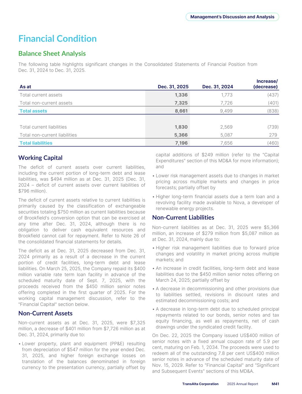 Financial Condition Balance Sheet Analysis The following table highlights significant changes in the Consolidated Statements of Financial Position from Dec. 31, 2024 to Dec. 31, 2025. As at Dec. 31, 2025 Dec. 31, 2024 Increase/ (decrease) Total current assets 1,336 1,773 (437) Total non-current assets 7,325 7,726 (401) Total assets 8,661 9,499 (838) Total current liabilities 1,830 2,569 (739) Total non-current liabilities 5,366 5,087 279 Total liabilities 7,196 7,656 (460) Working Capital The deficit of current assets over current liabilities, including the current portion of long-term debt and lease liabilities, was $494 million as at Dec. 31, 2025 (Dec. 31, 2024 – deficit of current assets over current liabilities of $796 million). The deficit of current assets relative to current liabilities is primarily caused by the classification of exchangeable securities totaling $750 million as current liabilities because of Brookfield's conversion option that can be exercised at any time after Dec. 31, 2024, although there is no obligation to deliver cash equivalent resources and Brookfield cannot call for repayment. Refer to Note 26 of the consolidated financial statements for details. The deficit as at Dec. 31, 2025 decreased from Dec. 31, 2024 primarily as a result of a decrease in the current portion of credit facilities, long-term debt and lease liabilities. On March 25, 2025, the Company repaid its $400 million variable rate term loan facility in advance of the scheduled maturity date of Sept. 7, 2025, with the proceeds received from the $450 million senior notes offering completed in the first quarter of 2025. For the working capital management discussion, refer to the "Financial Capital" section below. Non-Current Assets Non-current assets as at Dec. 31, 2025, were $7,325 million, a decrease of $401 million from $7,726 million as at Dec. 31, 2024, primarily due to: • Lower property, plant and equipment (PP&E) resulting from depreciation of $547 million for the year ended Dec. 31, 2025, and higher foreign exchange losses on translation of the balances denominated in foreign currency to the presentation currency, partially offset by capital additions of $249 million (refer to the "Capital Expenditures" section of this MD&A for more information); and • Lower risk management assets due to changes in market pricing across multiple markets and changes in price forecasts; partially offset by • Higher long-term financial assets due a term loan and a revolving facility made available to Nova, a developer of renewable energy projects. Non-Current Liabilities Non-current liabilities as at Dec. 31, 2025 were $5,366 million, an increase of $279 million from $5,087 million as at Dec. 31, 2024, mainly due to: • Higher risk management liabilities due to forward price changes and volatility in market pricing across multiple markets; and • An increase in credit facilities, long-term debt and lease liabilities due to the $450 million senior notes offering on March 24, 2025; partially offset by • A decrease in decommissioning and other provisions due to liabilities settled, revisions in discount rates and estimated decommissioning costs; and • A decrease in long-term debt due to scheduled principal repayments related to our bonds, senior notes and tax equity financing, as well as repayments, net of cash drawings under the syndicated credit facility. On Dec. 22, 2025 the Company issued US$400 million of senior notes with a fixed annual coupon rate of 5.9 per cent, maturing on Feb. 1, 2034. The proceeds were used to redeem all of the outstanding 7.8 per cent US$400 million senior notes in advance of the scheduled maturity date of Nov. 15, 2029. Refer to "Financial Capital" and "Significant and Subsequent Events" sections of this MD&A. TransAlta Corporation 2025 Annual Report M41