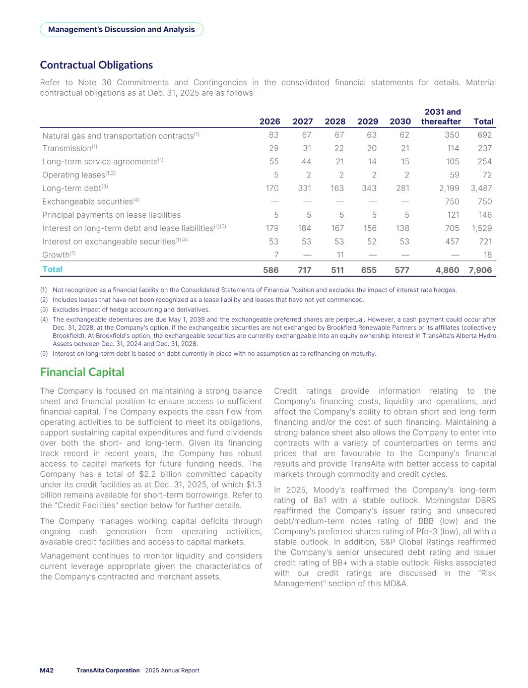 Contractual Obligations Refer to Note 36 Commitments and Contingencies in the consolidated financial statements for details. Material contractual obligations as at Dec. 31, 2025 are as follows:   2026 2027 2028 2029 2030 2031 and thereafter Total Natural gas and transportation contracts(1) 83 67 67 63 62 350 692 Transmission(1) 29 31 22 20 21 114 237 Long-term service agreements(1) 55 44 21 14 15 105 254 Operating leases(1,2) 5 2 2 2 2 59 72 Long-term debt(3) 170 331 163 343 281 2,199 3,487 Exchangeable securities(4) — — — — — 750 750 Principal payments on lease liabilities 5 5 5 5 5 121 146 Interest on long-term debt and lease liabilities(1)(5) 179 184 167 156 138 705 1,529 Interest on exchangeable securities(1)(4) 53 53 53 52 53 457 721 Growth(1) 7 — 11 — — — 18 Total 586 717 511 655 577 4,860 7,906 (1) Not recognized as a financial liability on the Consolidated Statements of Financial Position and excludes the impact of interest rate hedges. (2) Includes leases that have not been recognized as a lease liability and leases that have not yet commenced. (3) Excludes impact of hedge accounting and derivatives. (4) The exchangeable debentures are due May 1, 2039 and the exchangeable preferred shares are perpetual. However, a cash payment could occur after Dec. 31, 2028, at the Company's option, if the exchangeable securities are not exchanged by Brookfield Renewable Partners or its affiliates (collectively Brookfield). At Brookfield's option, the exchangeable securities are currently exchangeable into an equity ownership interest in TransAlta’s Alberta Hydro Assets between Dec. 31, 2024 and Dec. 31, 2028. (5) Interest on long-term debt is based on debt currently in place with no assumption as to refinancing on maturity. Financial Capital The Company is focused on maintaining a strong balance sheet and financial position to ensure access to sufficient financial capital. The Company expects the cash flow from operating activities to be sufficient to meet its obligations, support sustaining capital expenditures and fund dividends over both the short- and long-term. Given its financing track record in recent years, the Company has robust access to capital markets for future funding needs. The Company has a total of $2.2 billion committed capacity under its credit facilities as at Dec. 31, 2025, of which $1.3 billion remains available for short-term borrowings. Refer to the "Credit Facilities" section below for further details. The Company manages working capital deficits through ongoing cash generation from operating activities, available credit facilities and access to capital markets. Management continues to monitor liquidity and considers current leverage appropriate given the characteristics of the Company’s contracted and merchant assets. Credit ratings provide information relating to the Company's financing costs, liquidity and operations, and affect the Company's ability to obtain short and long-term financing and/or the cost of such financing. Maintaining a strong balance sheet also allows the Company to enter into contracts with a variety of counterparties on terms and prices that are favourable to the Company’s financial results and provide TransAlta with better access to capital markets through commodity and credit cycles. In 2025, Moody's reaffirmed the Company's long-term rating of Ba1 with a stable outlook. Morningstar DBRS reaffirmed the Company's issuer rating and unsecured debt/medium-term notes rating of BBB (low) and the Company's preferred shares rating of Pfd-3 (low), all with a stable outlook. In addition, S&P Global Ratings reaffirmed the Company's senior unsecured debt rating and issuer credit rating of BB+ with a stable outlook. Risks associated with our credit ratings are discussed in the "Risk Management" section of this MD&A. M42 TransAlta Corporation 2025 Annual Report