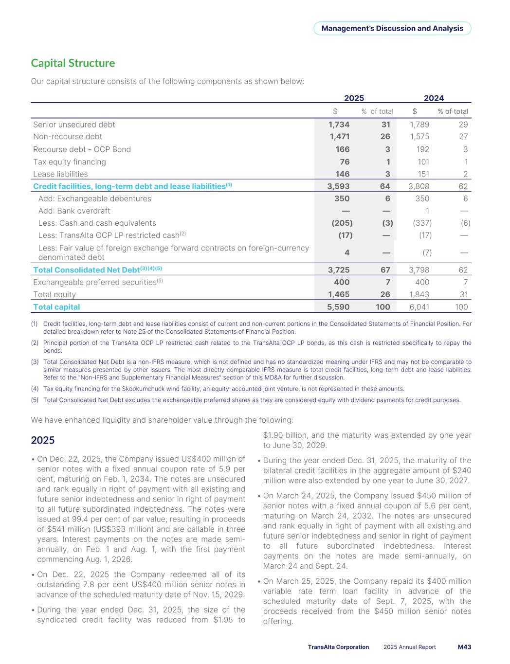 Capital Structure Our capital structure consists of the following components as shown below: As at Dec. 31 2025 2024 $ % of total $ % of total Senior unsecured debt 1,734 31 1,789 29 Non-recourse debt 1,471 26 1,575 27 Recourse debt - OCP Bond 166 3 192 3 Tax equity financing 76 1 101 1 Lease liabilities 146 3 151 2 Credit facilities, long-term debt and lease liabilities(1) 3,593 64 3,808 62 Add: Exchangeable debentures 350 6 350 6 Add: Bank overdraft — — 1 — Less: Cash and cash equivalents (205) (3) (337) (6) Less: TransAlta OCP LP restricted cash(2) (17) — (17) — Less: Fair value of foreign exchange forward contracts on foreign-currency denominated debt 4 — (7) — Total Consolidated Net Debt(3)(4)(5) 3,725 67 3,798 62 Exchangeable preferred securities(5) 400 7 400 7 Total equity 1,465 26 1,843 31 Total capital 5,590 100 6,041 100 (1) Credit facilities, long-term debt and lease liabilities consist of current and non-current portions in the Consolidated Statements of Financial Position. For detailed breakdown refer to Note 25 of the Consolidated Statements of Financial Position. (2) Principal portion of the TransAlta OCP LP restricted cash related to the TransAlta OCP LP bonds, as this cash is restricted specifically to repay the bonds. (3) Total Consolidated Net Debt is a non-IFRS measure, which is not defined and has no standardized meaning under IFRS and may not be comparable to similar measures presented by other issuers. The most directly comparable IFRS measure is total credit facilities, long-term debt and lease liabilities. Refer to the "Non-IFRS and Supplementary Financial Measures" section of this MD&A for further discussion. (4) Tax equity financing for the Skookumchuck wind facility, an equity-accounted joint venture, is not represented in these amounts. (5) Total Consolidated Net Debt excludes the exchangeable preferred shares as they are considered equity with dividend payments for credit purposes. We have enhanced liquidity and shareholder value through the following: 2025 • On Dec. 22, 2025, the Company issued US$400 million of senior notes with a fixed annual coupon rate of 5.9 per cent, maturing on Feb. 1, 2034. The notes are unsecured and rank equally in right of payment with all existing and future senior indebtedness and senior in right of payment to all future subordinated indebtedness. The notes were issued at 99.4 per cent of par value, resulting in proceeds of $541 million (US$393 million) and are callable in three years. Interest payments on the notes are made semi- annually, on Feb. 1 and Aug. 1, with the first payment commencing Aug. 1, 2026. • On Dec. 22, 2025 the Company redeemed all of its outstanding 7.8 per cent US$400 million senior notes in advance of the scheduled maturity date of Nov. 15, 2029. • During the year ended Dec. 31, 2025, the size of the syndicated credit facility was reduced from $1.95 to $1.90 billion, and the maturity was extended by one year to June 30, 2029. • During the year ended Dec. 31, 2025, the maturity of the bilateral credit facilities in the aggregate amount of $240 million were also extended by one year to June 30, 2027. • On March 24, 2025, the Company issued $450 million of senior notes with a fixed annual coupon of 5.6 per cent, maturing on March 24, 2032. The notes are unsecured and rank equally in right of payment with all existing and future senior indebtedness and senior in right of payment to all future subordinated indebtedness. Interest payments on the notes are made semi-annually, on March 24 and Sept. 24. • On March 25, 2025, the Company repaid its $400 million variable rate term loan facility in advance of the scheduled maturity date of Sept. 7, 2025, with the proceeds received from the $450 million senior notes offering. TransAlta Corporation 2025 Annual Report M43