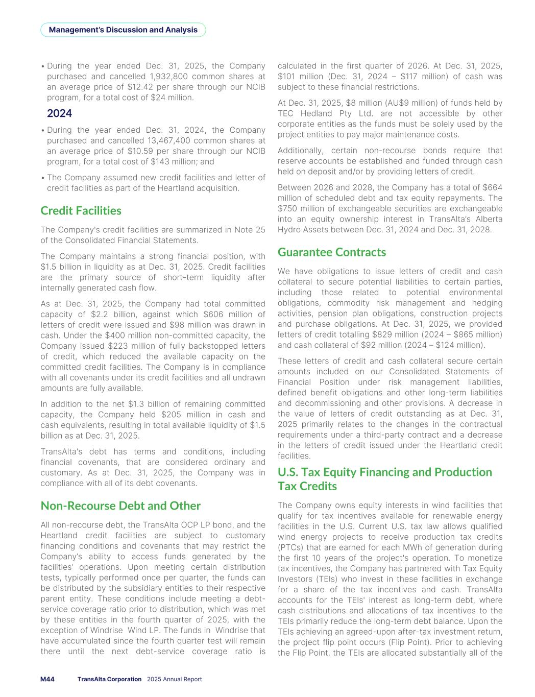 • During the year ended Dec. 31, 2025, the Company purchased and cancelled 1,932,800 common shares at an average price of $12.42 per share through our NCIB program, for a total cost of $24 million. 2024 • During the year ended Dec. 31, 2024, the Company purchased and cancelled 13,467,400 common shares at an average price of $10.59 per share through our NCIB program, for a total cost of $143 million; and • The Company assumed new credit facilities and letter of credit facilities as part of the Heartland acquisition. Credit Facilities The Company's credit facilities are summarized in Note 25 of the Consolidated Financial Statements. The Company maintains a strong financial position, with $1.5 billion in liquidity as at Dec. 31, 2025. Credit facilities are the primary source of short-term liquidity after internally generated cash flow. As at Dec. 31, 2025, the Company had total committed capacity of $2.2 billion, against which $606 million of letters of credit were issued and $98 million was drawn in cash. Under the $400 million non-committed capacity, the Company issued $223 million of fully backstopped letters of credit, which reduced the available capacity on the committed credit facilities. The Company is in compliance with all covenants under its credit facilities and all undrawn amounts are fully available. In addition to the net $1.3 billion of remaining committed capacity, the Company held $205 million in cash and cash equivalents, resulting in total available liquidity of $1.5 billion as at Dec. 31, 2025. TransAlta's debt has terms and conditions, including financial covenants, that are considered ordinary and customary. As at Dec. 31, 2025, the Company was in compliance with all of its debt covenants. Non-Recourse Debt and Other All non-recourse debt, the TransAlta OCP LP bond, and the Heartland credit facilities are subject to customary financing conditions and covenants that may restrict the Company’s ability to access funds generated by the facilities’ operations. Upon meeting certain distribution tests, typically performed once per quarter, the funds can be distributed by the subsidiary entities to their respective parent entity. These conditions include meeting a debt- service coverage ratio prior to distribution, which was met by these entities in the fourth quarter of 2025, with the exception of Windrise Wind LP. The funds in Windrise that have accumulated since the fourth quarter test will remain there until the next debt-service coverage ratio is calculated in the first quarter of 2026. At Dec. 31, 2025, $101 million (Dec. 31, 2024 – $117 million) of cash was subject to these financial restrictions. At Dec. 31, 2025, $8 million (AU$9 million) of funds held by TEC Hedland Pty Ltd. are not accessible by other corporate entities as the funds must be solely used by the project entities to pay major maintenance costs. Additionally, certain non-recourse bonds require that reserve accounts be established and funded through cash held on deposit and/or by providing letters of credit. Between 2026 and 2028, the Company has a total of $664 million of scheduled debt and tax equity repayments. The $750 million of exchangeable securities are exchangeable into an equity ownership interest in TransAlta’s Alberta Hydro Assets between Dec. 31, 2024 and Dec. 31, 2028. Guarantee Contracts We have obligations to issue letters of credit and cash collateral to secure potential liabilities to certain parties, including those related to potential environmental obligations, commodity risk management and hedging activities, pension plan obligations, construction projects and purchase obligations. At Dec. 31, 2025, we provided letters of credit totalling $829 million (2024 – $865 million) and cash collateral of $92 million (2024 – $124 million). These letters of credit and cash collateral secure certain amounts included on our Consolidated Statements of Financial Position under risk management liabilities, defined benefit obligations and other long-term liabilities and decommissioning and other provisions. A decrease in the value of letters of credit outstanding as at Dec. 31, 2025 primarily relates to the changes in the contractual requirements under a third-party contract and a decrease in the letters of credit issued under the Heartland credit facilities. U.S. Tax Equity Financing and Production Tax Credits The Company owns equity interests in wind facilities that qualify for tax incentives available for renewable energy facilities in the U.S. Current U.S. tax law allows qualified wind energy projects to receive production tax credits (PTCs) that are earned for each MWh of generation during the first 10 years of the project's operation. To monetize tax incentives, the Company has partnered with Tax Equity Investors (TEIs) who invest in these facilities in exchange for a share of the tax incentives and cash. TransAlta accounts for the TEIs' interest as long-term debt, where cash distributions and allocations of tax incentives to the TEIs primarily reduce the long-term debt balance. Upon the TEIs achieving an agreed-upon after-tax investment return, the project flip point occurs (Flip Point). Prior to achieving the Flip Point, the TEIs are allocated substantially all of the M44 TransAlta Corporation 2025 Annual Report