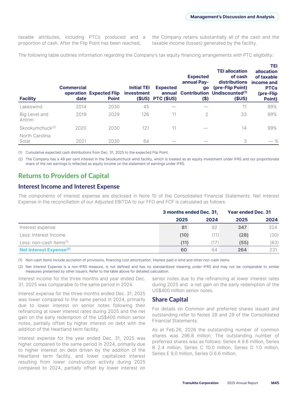 taxable attributes, including PTCs produced and a proportion of cash. After the Flip Point has been reached, the Company retains substantially all of the cash and the taxable income (losses) generated by the facility. The following table outlines information regarding the Company's tax equity financing arrangements with PTC eligibility: Facility Commercial operation date Expected Flip Point Initial TEI investment ($US) Expected annual PTC ($US) Expected annual Pay- go Contribution ($) TEI allocation of cash distributions (pre-Flip Point) Undiscounted(1) ($US) TEI allocation of taxable income and PTCs (pre-Flip Point) Lakeswind 2014 2030 45 — — 11 99% Big Level and Antrim 2019 2029 126 11 2 33 99% Skookumchuck(2) 2020 2030 121 11 — 14 99% North Carolina Solar 2021 2030 64 — — 3 — % (1) Cumulative expected cash distributions from Dec. 31, 2025 to the expected Flip Point. (2) The Company has a 49 per cent interest in the Skookumchuck wind facility, which is treated as an equity investment under IFRS and our proportionate share of the net earnings is reflected as equity income on the statement of earnings under IFRS. Returns to Providers of Capital Interest Income and Interest Expense The components of interest expense are disclosed in Note 10 of the Consolidated Financial Statements. Net Interest Expense in the reconciliation of our Adjusted EBITDA to our FFO and FCF is calculated as follows: 3 months ended Dec. 31, Year ended Dec. 31 2025 2024 2025 2024 Interest expense 81 92 347 324 Less: Interest Income (10) (11) (28) (30) Less: non-cash items(1) (11) (17) (55) (63) Net Interest Expense(2) 60 64 264 231 (1) Non-cash items include accretion of provisions, financing cost amortization, interest paid in kind and other non-cash items. (2) Net Interest Expense is a non-IFRS measure, is not defined and has no standardized meaning under IFRS and may not be comparable to similar measures presented by other issuers. Refer to the table above for detailed calculation. Interest income for the three months and year ended Dec. 31, 2025 was comparable to the same period in 2024. Interest expense for the three months ended Dec. 31, 2025 was lower compared to the same period in 2024, primarily due to lower interest on senior notes following their refinancing at lower interest rates during 2025 and the net gain on the early redemption of the US$400 million senior notes, partially offset by higher interest on debt with the addition of the Heartland term facility. Interest expense for the year ended Dec. 31, 2025 was higher compared to the same period in 2024, primarily due to higher interest on debt driven by the addition of the Heartland term facility, and lower capitalized interest resulting from lower construction activity during 2025 compared to 2024, partially offset by lower interest on senior notes due to the refinancing at lower interest rates during 2025 and a net gain on the early redemption of the US$400 million senior notes. Share Capital For details on Common and preferred shares issued and outstanding refer to Notes 28 and 29 of the Consolidated Financial Statements. As at Feb.26, 2026 the outstanding number of common shares was 296.8 million. The outstanding number of preferred shares was as follows: Series A 9.6 million, Series B 2.4 million, Series C 10.0 million, Series D 1.0 million, Series E 9.0 million, Series G 6.6 million. TransAlta Corporation 2025 Annual Report M45