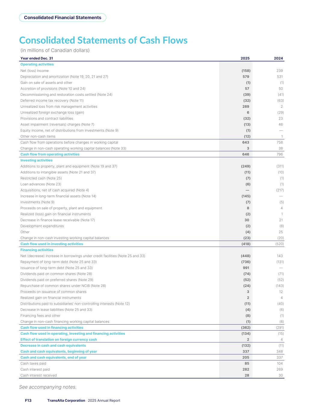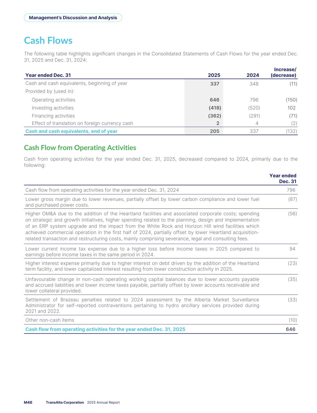 Cash Flows The following table highlights significant changes in the Consolidated Statements of Cash Flows for the year ended Dec. 31, 2025 and Dec. 31, 2024: Year ended Dec. 31 2025 2024 Increase/ (decrease) Cash and cash equivalents, beginning of year 337 348 (11) Provided by (used in):     Operating activities 646 796 (150) Investing activities (418) (520) 102 Financing activities (362) (291) (71) Effect of translation on foreign currency cash 2 4 (2) Cash and cash equivalents, end of year 205 337 (132) Cash Flow from Operating Activities Cash from operating activities for the year ended Dec. 31, 2025, decreased compared to 2024, primarily due to the following: Year ended Dec. 31 Cash flow from operating activities for the year ended Dec. 31, 2024 796 Lower gross margin due to lower revenues, partially offset by lower carbon compliance and lower fuel and purchased power costs. (87) Higher OM&A due to the addition of the Heartland facilities and associated corporate costs; spending on strategic and growth initiatives, higher spending related to the planning, design and implementation of an ERP system upgrade and the impact from the White Rock and Horizon Hill wind facilities which achieved commercial operation in the first half of 2024, partially offset by lower Heartland acquisition- related transaction and restructuring costs, mainly comprising severance, legal and consulting fees. (56) Lower current income tax expense due to a higher loss before income taxes in 2025 compared to earnings before income taxes in the same period in 2024. 94 Higher interest expense primarily due to higher interest on debt driven by the addition of the Heartland term facility, and lower capitalized interest resulting from lower construction activity in 2025. (23) Unfavourable change in non-cash operating working capital balances due to lower accounts payable and accrued liabilities and lower income taxes payable, partially offset by lower accounts receivable and lower collateral provided. (35) Settlement of Brazeau penalties related to 2024 assessment by the Alberta Market Surveillance Administrator for self-reported contraventions pertaining to hydro ancillary services provided during 2021 and 2022. (33) Other non-cash items (10) Cash flow from operating activities for the year ended Dec. 31, 2025 646 M46 TransAlta Corporation 2025 Annual Report