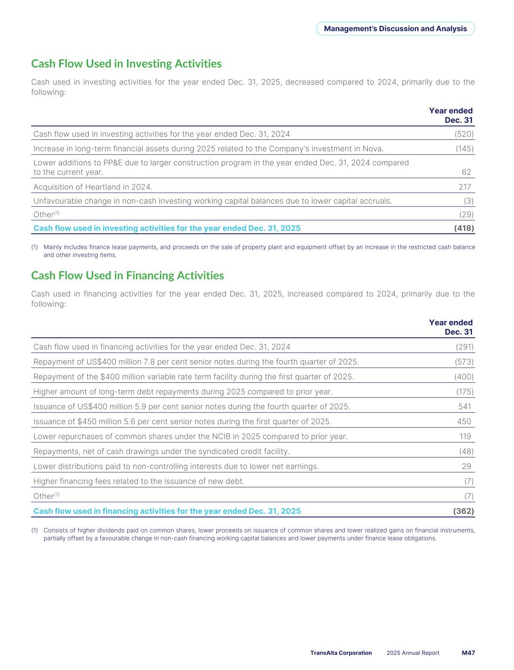 Cash Flow Used in Investing Activities Cash used in investing activities for the year ended Dec. 31, 2025, decreased compared to 2024, primarily due to the following: Year ended Dec. 31 Cash flow used in investing activities for the year ended Dec. 31, 2024 (520) Increase in long-term financial assets during 2025 related to the Company's investment in Nova. (145) Lower additions to PP&E due to larger construction program in the year ended Dec. 31, 2024 compared to the current year. 62 Acquisition of Heartland in 2024. 217 Unfavourable change in non-cash investing working capital balances due to lower capital accruals. (3) Other(1) (29) Cash flow used in investing activities for the year ended Dec. 31, 2025 (418) (1) Mainly includes finance lease payments, and proceeds on the sale of property plant and equipment offset by an increase in the restricted cash balance and other investing items. Cash Flow Used in Financing Activities Cash used in financing activities for the year ended Dec. 31, 2025, increased compared to 2024, primarily due to the following: Year ended Dec. 31 Cash flow used in financing activities for the year ended Dec. 31, 2024 (291) Repayment of US$400 million 7.8 per cent senior notes during the fourth quarter of 2025. (573) Repayment of the $400 million variable rate term facility during the first quarter of 2025. (400) Higher amount of long-term debt repayments during 2025 compared to prior year. (175) Issuance of US$400 million 5.9 per cent senior notes during the fourth quarter of 2025. 541 Issuance of $450 million 5.6 per cent senior notes during the first quarter of 2025. 450 Lower repurchases of common shares under the NCIB in 2025 compared to prior year. 119 Repayments, net of cash drawings under the syndicated credit facility. (48) Lower distributions paid to non-controlling interests due to lower net earnings. 29 Higher financing fees related to the issuance of new debt. (7) Other(1) (7) Cash flow used in financing activities for the year ended Dec. 31, 2025 (362) (1) Consists of higher dividends paid on common shares, lower proceeds on issuance of common shares and lower realized gains on financial instruments, partially offset by a favourable change in non-cash financing working capital balances and lower payments under finance lease obligations. TransAlta Corporation 2025 Annual Report M47