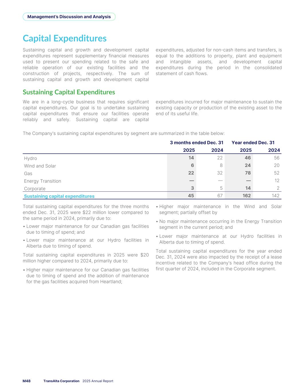 Capital Expenditures Sustaining capital and growth and development capital expenditures represent supplementary financial measures used to present our spending related to the safe and reliable operation of our existing facilities and the construction of projects, respectively. The sum of sustaining capital and growth and development capital expenditures, adjusted for non-cash items and transfers, is equal to the additions to property, plant and equipment and intangible assets, and development capital expenditures during the period in the consolidated statement of cash flows. Sustaining Capital Expenditures We are in a long-cycle business that requires significant capital expenditures. Our goal is to undertake sustaining capital expenditures that ensure our facilities operate reliably and safely. Sustaining capital are capital expenditures incurred for major maintenance to sustain the existing capacity or production of the existing asset to the end of its useful life. The Company's sustaining capital expenditures by segment are summarized in the table below: 3 months ended Dec. 31 Year ended Dec. 31 2025 2024 2025 2024 Hydro 14 22 46 56 Wind and Solar 6 8 24 20 Gas 22 32 78 52 Energy Transition — — — 12 Corporate 3 5 14 2 Sustaining capital expenditures 45 67 162 142 Total sustaining capital expenditures for the three months ended Dec. 31, 2025 were $22 million lower compared to the same period in 2024, primarily due to: • Lower major maintenance for our Canadian gas facilities due to timing of spend; and • Lower major maintenance at our Hydro facilities in Alberta due to timing of spend. Total sustaining capital expenditures in 2025 were $20 million higher compared to 2024, primarily due to: • Higher major maintenance for our Canadian gas facilities due to timing of spend and the addition of maintenance for the gas facilities acquired from Heartland; • Higher major maintenance in the Wind and Solar segment; partially offset by • No major maintenance occurring in the Energy Transition segment in the current period; and • Lower major maintenance at our Hydro facilities in Alberta due to timing of spend. Total sustaining capital expenditures for the year ended Dec. 31, 2024 were also impacted by the receipt of a lease incentive related to the Company's head office during the first quarter of 2024, included in the Corporate segment. M48 TransAlta Corporation 2025 Annual Report