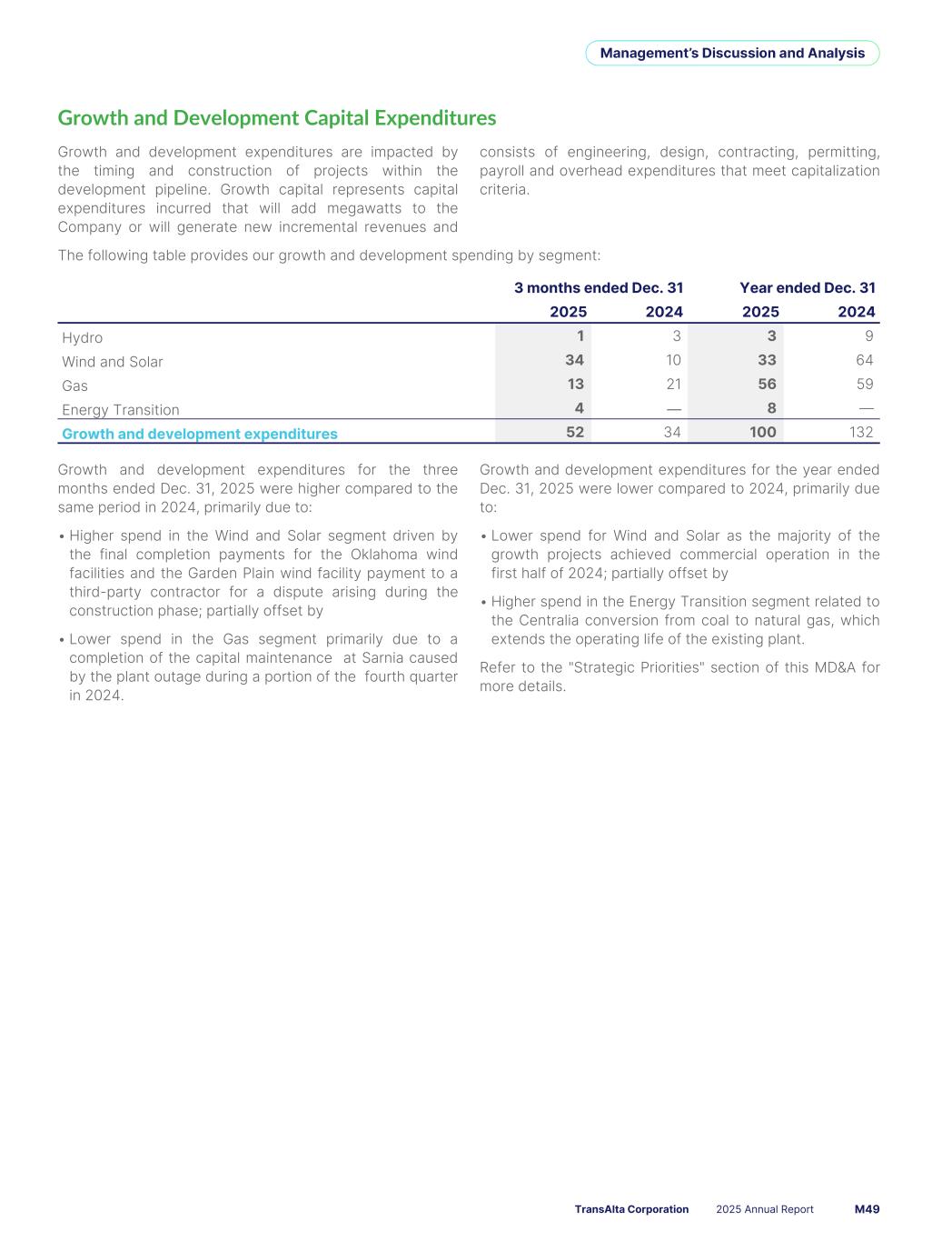 Growth and Development Capital Expenditures Growth and development expenditures are impacted by the timing and construction of projects within the development pipeline. Growth capital represents capital expenditures incurred that will add megawatts to the Company or will generate new incremental revenues and consists of engineering, design, contracting, permitting, payroll and overhead expenditures that meet capitalization criteria. The following table provides our growth and development spending by segment: 3 months ended Dec. 31 Year ended Dec. 31 2025 2024 2025 2024 Hydro 1 3 3 9 Wind and Solar 34 10 33 64 Gas 13 21 56 59 Energy Transition 4 — 8 — Growth and development expenditures 52 34 100 132 Growth and development expenditures for the three months ended Dec. 31, 2025 were higher compared to the same period in 2024, primarily due to: • Higher spend in the Wind and Solar segment driven by the final completion payments for the Oklahoma wind facilities and the Garden Plain wind facility payment to a third-party contractor for a dispute arising during the construction phase; partially offset by • Lower spend in the Gas segment primarily due to a completion of the capital maintenance at Sarnia caused by the plant outage during a portion of the fourth quarter in 2024. Growth and development expenditures for the year ended Dec. 31, 2025 were lower compared to 2024, primarily due to: • Lower spend for Wind and Solar as the majority of the growth projects achieved commercial operation in the first half of 2024; partially offset by • Higher spend in the Energy Transition segment related to the Centralia conversion from coal to natural gas, which extends the operating life of the existing plant. Refer to the "Strategic Priorities" section of this MD&A for more details. TransAlta Corporation 2025 Annual Report M49