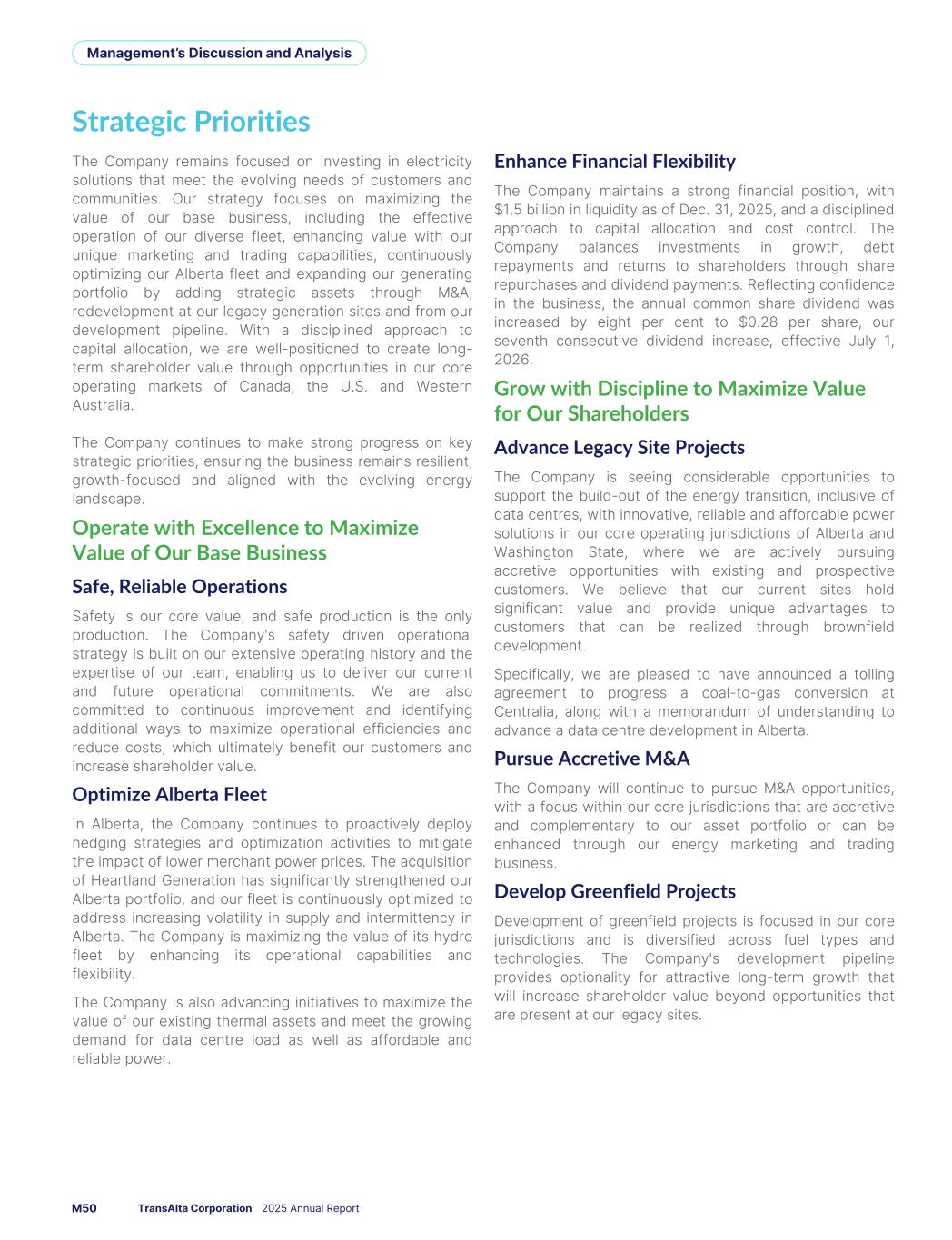 Strategic Priorities The Company remains focused on investing in electricity solutions that meet the evolving needs of customers and communities. Our strategy focuses on maximizing the value of our base business, including the effective operation of our diverse fleet, enhancing value with our unique marketing and trading capabilities, continuously optimizing our Alberta fleet and expanding our generating portfolio by adding strategic assets through M&A, redevelopment at our legacy generation sites and from our development pipeline. With a disciplined approach to capital allocation, we are well-positioned to create long- term shareholder value through opportunities in our core operating markets of Canada, the U.S. and Western Australia. The Company continues to make strong progress on key strategic priorities, ensuring the business remains resilient, growth-focused and aligned with the evolving energy landscape. Operate with Excellence to Maximize Value of Our Base Business Safe, Reliable Operations Safety is our core value, and safe production is the only production. The Company's safety driven operational strategy is built on our extensive operating history and the expertise of our team, enabling us to deliver our current and future operational commitments. We are also committed to continuous improvement and identifying additional ways to maximize operational efficiencies and reduce costs, which ultimately benefit our customers and increase shareholder value. Optimize Alberta Fleet In Alberta, the Company continues to proactively deploy hedging strategies and optimization activities to mitigate the impact of lower merchant power prices. The acquisition of Heartland Generation has significantly strengthened our Alberta portfolio, and our fleet is continuously optimized to address increasing volatility in supply and intermittency in Alberta. The Company is maximizing the value of its hydro fleet by enhancing its operational capabilities and flexibility. The Company is also advancing initiatives to maximize the value of our existing thermal assets and meet the growing demand for data centre load as well as affordable and reliable power. Enhance Financial Flexibility The Company maintains a strong financial position, with $1.5 billion in liquidity as of Dec. 31, 2025, and a disciplined approach to capital allocation and cost control. The Company balances investments in growth, debt repayments and returns to shareholders through share repurchases and dividend payments. Reflecting confidence in the business, the annual common share dividend was increased by eight per cent to $0.28 per share, our seventh consecutive dividend increase, effective July 1, 2026. Grow with Discipline to Maximize Value for Our Shareholders Advance Legacy Site Projects The Company is seeing considerable opportunities to support the build-out of the energy transition, inclusive of data centres, with innovative, reliable and affordable power solutions in our core operating jurisdictions of Alberta and Washington State, where we are actively pursuing accretive opportunities with existing and prospective customers. We believe that our current sites hold significant value and provide unique advantages to customers that can be realized through brownfield development. Specifically, we are pleased to have announced a tolling agreement to progress a coal-to-gas conversion at Centralia, along with a memorandum of understanding to advance a data centre development in Alberta. Pursue Accretive M&A The Company will continue to pursue M&A opportunities, with a focus within our core jurisdictions that are accretive and complementary to our asset portfolio or can be enhanced through our energy marketing and trading business. Develop Greenfield Projects Development of greenfield projects is focused in our core jurisdictions and is diversified across fuel types and technologies. The Company's development pipeline provides optionality for attractive long-term growth that will increase shareholder value beyond opportunities that are present at our legacy sites. M50 TransAlta Corporation 2025 Annual Report