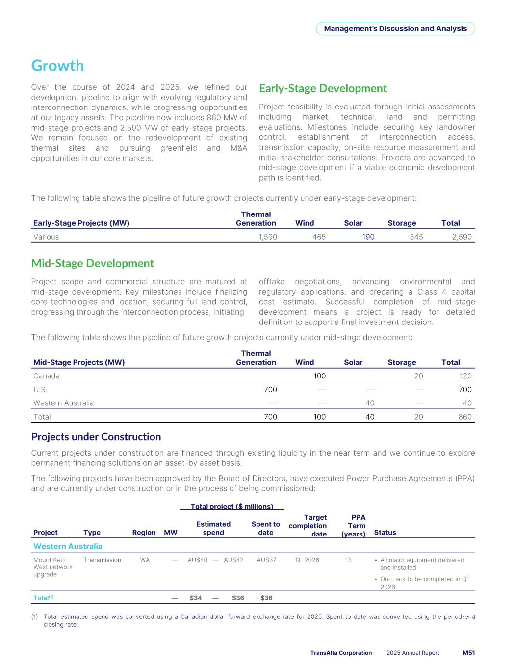 Growth Over the course of 2024 and 2025, we refined our development pipeline to align with evolving regulatory and interconnection dynamics, while progressing opportunities at our legacy assets. The pipeline now includes 860 MW of mid-stage projects and 2,590 MW of early-stage projects. We remain focused on the redevelopment of existing thermal sites and pursuing greenfield and M&A opportunities in our core markets. Early-Stage Development Project feasibility is evaluated through initial assessments including market, technical, land and permitting evaluations. Milestones include securing key landowner control, establishment of interconnection access, transmission capacity, on-site resource measurement and initial stakeholder consultations. Projects are advanced to mid-stage development if a viable economic development path is identified. The following table shows the pipeline of future growth projects currently under early-stage development: Early-Stage Projects (MW) Thermal Generation Wind Solar Storage Total Various 1,590 465 190 345 2,590 Mid-Stage Development Project scope and commercial structure are matured at mid-stage development. Key milestones include finalizing core technologies and location, securing full land control, progressing through the interconnection process, initiating offtake negotiations, advancing environmental and regulatory applications, and preparing a Class 4 capital cost estimate. Successful completion of mid-stage development means a project is ready for detailed definition to support a final investment decision. The following table shows the pipeline of future growth projects currently under mid-stage development: Mid-Stage Projects (MW) Thermal Generation Wind Solar Storage Total Canada — 100 — 20 120 U.S. 700 — — — 700 Western Australia — — 40 — 40 Total 700 100 40 20 860 Projects under Construction Current projects under construction are financed through existing liquidity in the near term and we continue to explore permanent financing solutions on an asset-by asset basis. The following projects have been approved by the Board of Directors, have executed Power Purchase Agreements (PPA) and are currently under construction or in the process of being commissioned: Total project ($ millions) Project Type Region MW Estimated spend Spent to date Target completion date PPA Term (years) Status Western Australia Mount Keith West network upgrade Transmission WA — AU$40 — AU$42 AU$37 Q1 2026 13 • All major equipment delivered and installed • On-track to be completed in Q1 2026 Total(1) — $34 — $36 $36 (1) Total estimated spend was converted using a Canadian dollar forward exchange rate for 2025. Spent to date was converted using the period-end closing rate. TransAlta Corporation 2025 Annual Report M51