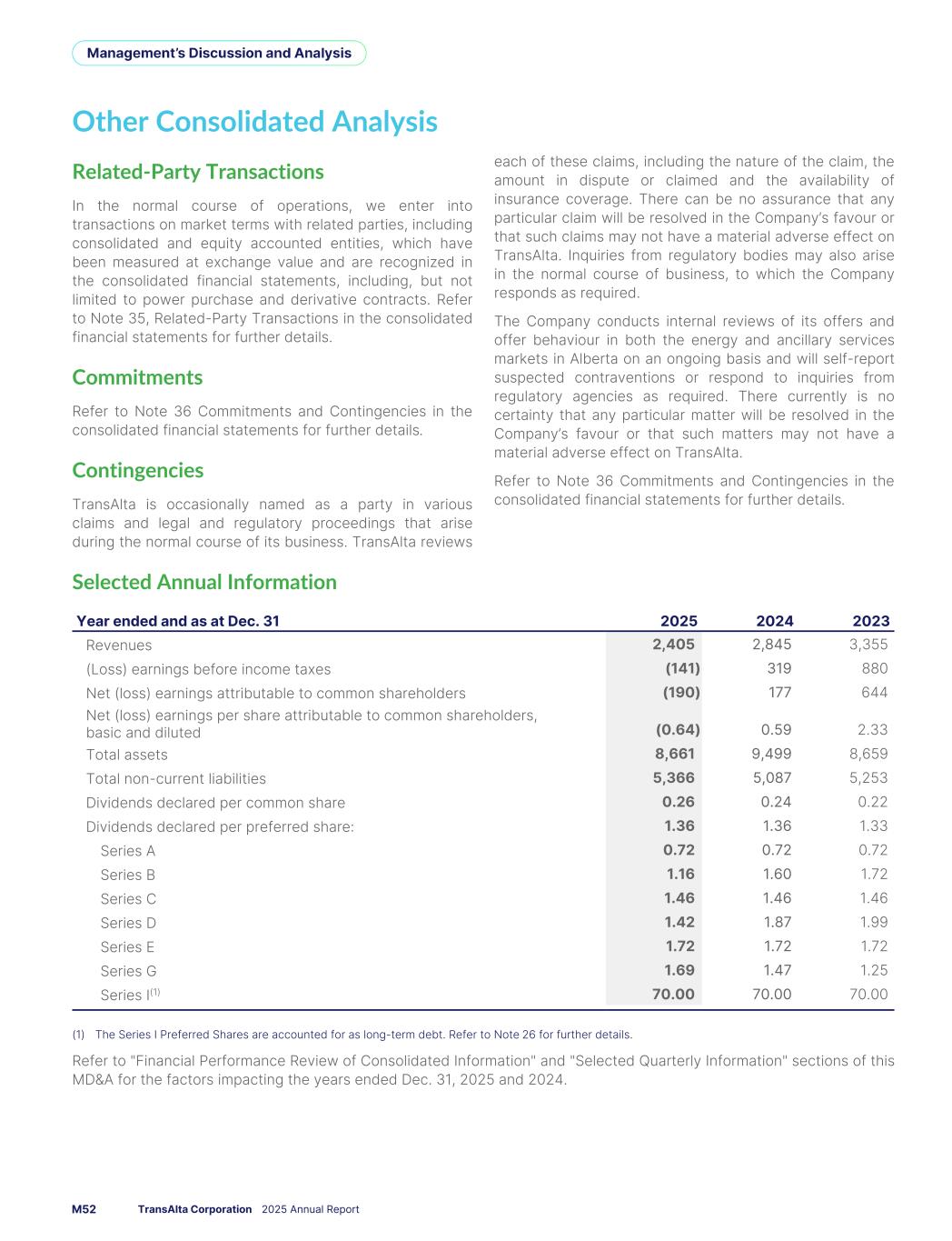 Other Consolidated Analysis Related-Party Transactions In the normal course of operations, we enter into transactions on market terms with related parties, including consolidated and equity accounted entities, which have been measured at exchange value and are recognized in the consolidated financial statements, including, but not limited to power purchase and derivative contracts. Refer to Note 35, Related-Party Transactions in the consolidated financial statements for further details. Commitments Refer to Note 36 Commitments and Contingencies in the consolidated financial statements for further details. Contingencies TransAlta is occasionally named as a party in various claims and legal and regulatory proceedings that arise during the normal course of its business. TransAlta reviews each of these claims, including the nature of the claim, the amount in dispute or claimed and the availability of insurance coverage. There can be no assurance that any particular claim will be resolved in the Company’s favour or that such claims may not have a material adverse effect on TransAlta. Inquiries from regulatory bodies may also arise in the normal course of business, to which the Company responds as required. The Company conducts internal reviews of its offers and offer behaviour in both the energy and ancillary services markets in Alberta on an ongoing basis and will self-report suspected contraventions or respond to inquiries from regulatory agencies as required. There currently is no certainty that any particular matter will be resolved in the Company’s favour or that such matters may not have a material adverse effect on TransAlta. Refer to Note 36 Commitments and Contingencies in the consolidated financial statements for further details. Selected Annual Information Year ended and as at Dec. 31 2025 2024 2023 Revenues 2,405 2,845 3,355 (Loss) earnings before income taxes (141) 319 880 Net (loss) earnings attributable to common shareholders (190) 177 644 Net (loss) earnings per share attributable to common shareholders, basic and diluted (0.64) 0.59 2.33 Total assets 8,661 9,499 8,659 Total non-current liabilities 5,366 5,087 5,253 Dividends declared per common share 0.26 0.24 0.22 Dividends declared per preferred share: 1.36 1.36 1.33 Series A 0.72 0.72 0.72 Series B 1.16 1.60 1.72 Series C 1.46 1.46 1.46 Series D 1.42 1.87 1.99 Series E 1.72 1.72 1.72 Series G 1.69 1.47 1.25 Series I(1) 70.00 70.00 70.00 (1) The Series I Preferred Shares are accounted for as long-term debt. Refer to Note 26 for further details. Refer to "Financial Performance Review of Consolidated Information" and "Selected Quarterly Information" sections of this MD&A for the factors impacting the years ended Dec. 31, 2025 and 2024. M52 TransAlta Corporation 2025 Annual Report