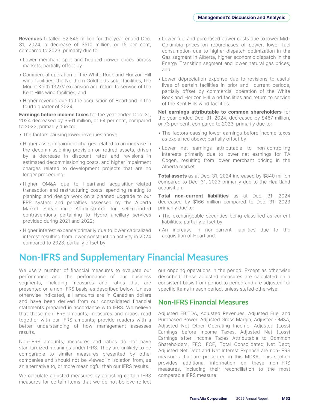 Revenues totalled $2,845 million for the year ended Dec. 31, 2024, a decrease of $510  million, or 15 per cent, compared to 2023, primarily due to: • Lower merchant spot and hedged power prices across markets; partially offset by • Commercial operation of the White Rock and Horizon Hill wind facilities, the Northern Goldfields solar facilities, the Mount Keith 132kV expansion and return to service of the Kent Hills wind facilities; and • Higher revenue due to the acquisition of Heartland in the fourth quarter of 2024. Earnings before income taxes for the year ended Dec. 31, 2024 decreased by $561 million, or 64 per cent, compared to 2023, primarily due to: • The factors causing lower revenues above; • Higher asset impairment charges related to an increase in the decommissioning provision on retired assets, driven by a decrease in discount rates and revisions in estimated decommissioning costs, and higher impairment charges related to development projects that are no longer proceeding; • Higher OM&A due to Heartland acquisition-related transaction and restructuring costs, spending relating to planning and design work on a planned upgrade to our ERP system and penalties assessed by the Alberta Market Surveillance Administrator for self-reported contraventions pertaining to Hydro ancillary services provided during 2021 and 2022; • Higher interest expense primarily due to lower capitalized interest resulting from lower construction activity in 2024 compared to 2023; partially offset by • Lower fuel and purchased power costs due to lower Mid- Columbia prices on repurchases of power, lower fuel consumption due to higher dispatch optimization in the Gas segment in Alberta, higher economic dispatch in the Energy Transition segment and lower natural gas prices; and • Lower depreciation expense due to revisions to useful lives of certain facilities in prior and current periods, partially offset by commercial operation of the White Rock and Horizon Hill wind facilities and return to service of the Kent Hills wind facilities. Net earnings attributable to common shareholders for the year ended Dec. 31, 2024, decreased by $467 million, or 73 per cent, compared to 2023, primarily due to: • The factors causing lower earnings before income taxes as explained above; partially offset by • Lower net earnings attributable to non-controlling interests primarily due to lower net earnings for TA Cogen, resulting from lower merchant pricing in the Alberta market. Total assets as at Dec. 31, 2024 increased by $840 million compared to Dec. 31, 2023 primarily due to the Heartland acquisition. Total non-current liabilities as at Dec. 31, 2024 decreased by $166 million compared to Dec. 31, 2023 primarily due to: • The exchangeable securities being classified as current liabilities; partially offset by • An increase in non-current liabilities due to the acquisition of Heartland. Non-IFRS and Supplementary Financial Measures We use a number of financial measures to evaluate our performance and the performance of our business segments, including measures and ratios that are presented on a non-IFRS basis, as described below. Unless otherwise indicated, all amounts are in Canadian dollars and have been derived from our consolidated financial statements prepared in accordance with IFRS. We believe that these non-IFRS amounts, measures and ratios, read together with our IFRS amounts, provide readers with a better understanding of how management assesses results. Non-IFRS amounts, measures and ratios do not have standardized meanings under IFRS. They are unlikely to be comparable to similar measures presented by other companies and should not be viewed in isolation from, as an alternative to, or more meaningful than our IFRS results. We calculate adjusted measures by adjusting certain IFRS measures for certain items that we do not believe reflect our ongoing operations in the period. Except as otherwise described, these adjusted measures are calculated on a consistent basis from period to period and are adjusted for specific items in each period, unless stated otherwise. Non-IFRS Financial Measures Adjusted EBITDA, Adjusted Revenues, Adjusted Fuel and Purchased Power, Adjusted Gross Margin, Adjusted OM&A, Adjusted Net Other Operating Income, Adjusted (Loss) Earnings before Income Taxes, Adjusted Net (Loss) Earnings after Income Taxes Attributable to Common Shareholders, FFO, FCF, Total Consolidated Net Debt, Adjusted Net Debt and Net Interest Expense are non-IFRS measures that are presented in this MD&A. This section provides additional information on these non-IFRS measures, including their reconciliation to the most comparable IFRS measure. TransAlta Corporation 2025 Annual Report M53