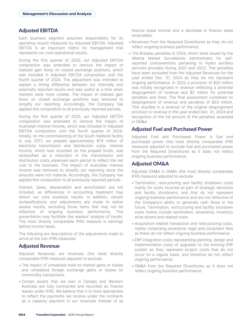 Adjusted EBITDA Each business segment assumes responsibility for its operating results measured by Adjusted EBITDA. Adjusted EBITDA is an important metric for management that represents our core operational results. During the first quarter of 2025, our Adjusted EBITDA composition was amended to remove the impact of realized gain (loss) on closed exchange positions, which was included in Adjusted EBITDA composition until the fourth quarter of 2024. The adjustment was intended to explain a timing difference between our internally and externally reported results and was useful at a time when markets were more volatile. The impact of realized gain (loss) on closed exchange positions was removed to simplify our reporting. Accordingly, the Company has applied this composition to all previously reported periods. During the first quarter of 2025, our Adjusted EBITDA composition was amended to remove the impact of Australian interest income, which was included in Adjusted EBITDA composition until the fourth quarter of 2024. Initially, on the commissioning of the South Hedland facility in July 2017, we prepaid approximately $74 million of electricity transmission and distribution costs. Interest income, which was recorded on the prepaid funds, was reclassified as a reduction in the transmission and distribution costs expensed each period to reflect the net cost to the business. The impact of Australian interest income was removed to simplify our reporting since the amounts were not material. Accordingly, the Company has applied this composition to all previously reported periods. Interest, taxes, depreciation and amortization are not included, as differences in accounting treatment may distort our core business results. In addition, certain reclassifications and adjustments are made to better assess results, excluding those items that may not be reflective of ongoing business performance. This presentation may facilitate the readers' analysis of trends. The most directly comparable IFRS measure is earnings before income taxes. The following are descriptions of the adjustments made to arrive at the non-IFRS measures: Adjusted Revenue Adjusted Revenues are revenues (the most directly comparable IFRS measure) adjusted to exclude: • The impact of unrealized mark-to-market gains or losses and unrealized  foreign exchange gains or losses on commodity transactions. • Certain assets that we own in Canada and Western Australia are fully contracted and recorded as finance leases under IFRS. We believe that it is more appropriate to reflect the payments we receive under the contracts as a capacity payment in our revenues instead of as finance lease income and a decrease in finance lease receivables. • Revenues from the Required Divestitures as they do not reflect ongoing business performance. • The Brazeau penalties in 2024, which were issued by the Alberta Market Surveillance Administrator for self- reported contraventions pertaining to Hydro ancillary services provided during 2021 and 2022. The penalties have been excluded from the Adjusted Revenues for the year ended Dec. 31, 2024 as they do not represent ongoing performance. In 2022 a provision of $20 million was initially recognized in revenue reflecting a potential disgorgement of revenue and $2  million for potential penalties and fines. The final assessment contained no disgorgement of revenue and penalties of $33  million. This resulted in a reversal of the original disgorgement provision in revenue in the year ended Dec. 31, 2024 and recognition of the full amount of the penalties assessed in OM&A. Adjusted Fuel and Purchased Power Adjusted Fuel and Purchased Power is fuel and purchased power (the most directly comparable IFRS measure) adjusted to exclude fuel and purchased power from the Required Divestitures as it does not reflect ongoing business performance. Adjusted OM&A Adjusted OM&A is OM&A (the most directly comparable IFRS measure) adjusted to exclude: • Termination, restructuring and facility shutdown costs mainly for costs incurred as part of strategic decisions and facility shutdowns, and that do not represent ongoing business performance and are not reflective of the Company's ability to generate cash flows in the future. Termination, restructuring and facility shutdown costs mainly include termination, severance, inventory write downs and related costs. • Acquisition-related transaction and restructuring costs, mainly comprising severance, legal and consultant fees as these do not reflect ongoing business performance. • ERP integration costs representing planning, design and implementation costs of upgrades to the existing ERP system as they represent project costs that do not occur on a regular basis, and therefore do not reflect ongoing performance. • OM&A from the Required Divestitures as it does not reflect ongoing business performance. M54 TransAlta Corporation 2025 Annual Report