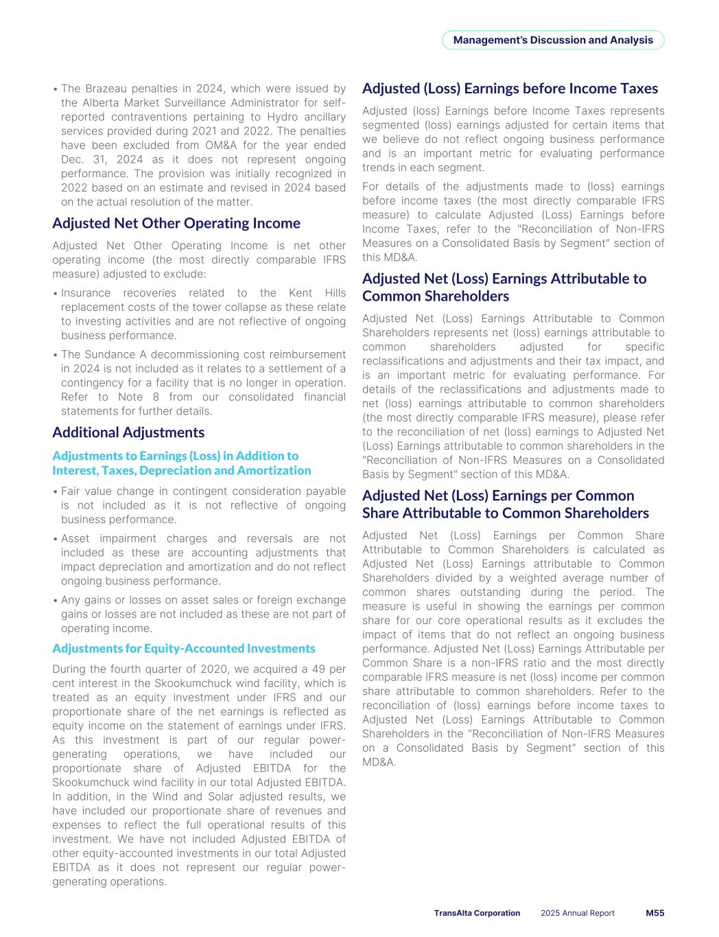 • The Brazeau penalties in 2024, which were issued by the Alberta Market Surveillance Administrator for self- reported contraventions pertaining to Hydro ancillary services provided during 2021 and 2022. The penalties have been excluded from OM&A for the year ended Dec. 31, 2024 as it does not represent ongoing performance. The provision was initially recognized in 2022 based on an estimate and revised in 2024 based on the actual resolution of the matter. Adjusted Net Other Operating Income Adjusted Net Other Operating Income is net other operating income (the most directly comparable IFRS measure) adjusted to exclude: • Insurance recoveries related to the Kent Hills replacement costs of the tower collapse as these relate to investing activities and are not reflective of ongoing business performance. • The Sundance A decommissioning cost reimbursement in 2024 is not included as it relates to a settlement of a contingency for a facility that is no longer in operation. Refer to Note 8 from our consolidated financial statements for further details. Additional Adjustments Adjustments to Earnings (Loss) in Addition to Interest, Taxes, Depreciation and Amortization • Fair value change in contingent consideration payable is not included as it is not reflective of ongoing business performance. • Asset impairment charges and reversals are not included as these are accounting adjustments that impact depreciation and amortization and do not reflect ongoing business performance. • Any gains or losses on asset sales or foreign exchange gains or losses are not included as these are not part of operating income. Adjustments for Equity-Accounted Investments During the fourth quarter of 2020, we acquired a 49 per cent interest in the Skookumchuck wind facility, which is treated as an equity investment under IFRS and our proportionate share of the net earnings is reflected as equity income on the statement of earnings under IFRS. As this investment is part of our regular power- generating operations, we have included our proportionate share of Adjusted EBITDA for the Skookumchuck wind facility in our total Adjusted EBITDA. In addition, in the Wind and Solar adjusted results, we have included our proportionate share of revenues and expenses to reflect the full operational results of this investment. We have not included Adjusted EBITDA of other equity-accounted investments in our total Adjusted EBITDA as it does not represent our regular power- generating operations. Adjusted (Loss) Earnings before Income Taxes Adjusted (loss) Earnings before Income Taxes represents segmented (loss) earnings adjusted for certain items that we believe do not reflect ongoing business performance and is an important metric for evaluating performance trends in each segment. For details of the adjustments made to (loss) earnings before income taxes (the most directly comparable IFRS measure) to calculate Adjusted (Loss) Earnings before Income Taxes, refer to the "Reconciliation of Non-IFRS Measures on a Consolidated Basis by Segment" section of this MD&A. Adjusted Net (Loss) Earnings Attributable to Common Shareholders Adjusted Net (Loss) Earnings Attributable to Common Shareholders represents net (loss) earnings attributable to common shareholders adjusted for specific reclassifications and adjustments and their tax impact, and is an important metric for evaluating performance. For details of the reclassifications and adjustments made to net (loss) earnings attributable to common shareholders (the most directly comparable IFRS measure), please refer to the reconciliation of net (loss) earnings to Adjusted Net (Loss) Earnings attributable to common shareholders in the "Reconciliation of Non-IFRS Measures on a Consolidated Basis by Segment" section of this MD&A. Adjusted Net (Loss) Earnings per Common Share Attributable to Common Shareholders Adjusted Net (Loss) Earnings per Common Share Attributable to Common Shareholders is calculated as Adjusted Net (Loss) Earnings attributable to Common Shareholders divided by a weighted average number of common shares outstanding during the period. The measure is useful in showing the earnings per common share for our core operational results as it excludes the impact of items that do not reflect an ongoing business performance. Adjusted Net (Loss) Earnings Attributable per Common Share is a non-IFRS ratio and the most directly comparable IFRS measure is net (loss) income per common share attributable to common shareholders. Refer to the reconciliation of (loss) earnings before income taxes to Adjusted Net (Loss) Earnings Attributable to Common Shareholders in the "Reconciliation of Non-IFRS Measures on a Consolidated Basis by Segment" section of this MD&A. TransAlta Corporation 2025 Annual Report M55