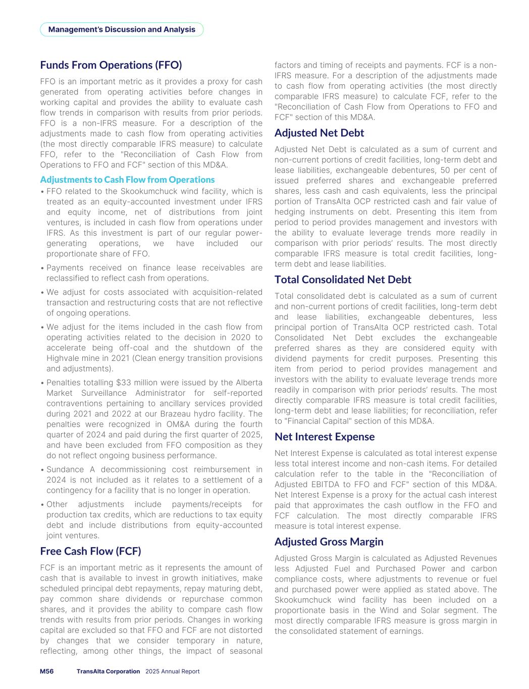 Funds From Operations (FFO) FFO is an important metric as it provides a proxy for cash generated from operating activities before changes in working capital and provides the ability to evaluate cash flow trends in comparison with results from prior periods. FFO is a non-IFRS measure. For a description of the adjustments made to cash flow from operating activities (the most directly comparable IFRS measure) to calculate FFO, refer to the "Reconciliation of Cash Flow from Operations to FFO and FCF" section of this MD&A. Adjustments to Cash Flow from Operations • FFO related to the Skookumchuck wind facility, which is treated as an equity-accounted investment under IFRS and equity income, net of distributions from joint ventures, is included in cash flow from operations under IFRS. As this investment is part of our regular power- generating operations, we have included our proportionate share of FFO. • Payments received on finance lease receivables are reclassified to reflect cash from operations. • We adjust for costs associated with acquisition-related transaction and restructuring costs that are not reflective of ongoing operations. • We adjust for the items included in the cash flow from operating activities related to the decision in 2020 to accelerate being off-coal and the shutdown of the Highvale mine in 2021 (Clean energy transition provisions and adjustments). • Penalties totalling $33 million were issued by the Alberta Market Surveillance Administrator for self-reported contraventions pertaining to ancillary services provided during 2021 and 2022 at our Brazeau hydro facility. The penalties were recognized in OM&A during the fourth quarter of 2024 and paid during the first quarter of 2025, and have been excluded from FFO composition as they do not reflect ongoing business performance. • Sundance A decommissioning cost reimbursement in 2024 is not included as it relates to a settlement of a contingency for a facility that is no longer in operation. • Other adjustments include payments/receipts for production tax credits, which are reductions to tax equity debt and include distributions from equity-accounted joint ventures. Free Cash Flow (FCF) FCF is an important metric as it represents the amount of cash that is available to invest in growth initiatives, make scheduled principal debt repayments, repay maturing debt, pay common share dividends or repurchase common shares, and it provides the ability to compare cash flow trends with results from prior periods. Changes in working capital are excluded so that FFO and FCF are not distorted by changes that we consider temporary in nature, reflecting, among other things, the impact of seasonal factors and timing of receipts and payments. FCF is a non- IFRS measure. For a description of the adjustments made to cash flow from operating activities (the most directly comparable IFRS measure) to calculate FCF, refer to the "Reconciliation of Cash Flow from Operations to FFO and FCF" section of this MD&A. Adjusted Net Debt Adjusted Net Debt is calculated as a sum of current and non-current portions of credit facilities, long-term debt and lease liabilities, exchangeable debentures, 50 per cent of issued preferred shares and exchangeable preferred shares, less cash and cash equivalents, less the principal portion of TransAlta OCP restricted cash and fair value of hedging instruments on debt. Presenting this item from period to period provides management and investors with the ability to evaluate leverage trends more readily in comparison with prior periods’ results. The most directly comparable IFRS measure is total credit facilities, long- term debt and lease liabilities. Total Consolidated Net Debt Total consolidated debt is calculated as a sum of current and non-current portions of credit facilities, long-term debt and lease liabilities, exchangeable debentures, less principal portion of TransAlta OCP restricted cash. Total Consolidated Net Debt excludes the exchangeable preferred shares as they are considered equity with dividend payments for credit purposes. Presenting this item from period to period provides management and investors with the ability to evaluate leverage trends more readily in comparison with prior periods’ results. The most directly comparable IFRS measure is total credit facilities, long-term debt and lease liabilities; for reconciliation, refer to "Financial Capital" section of this MD&A. Net Interest Expense Net Interest Expense is calculated as total interest expense less total interest income and non-cash items. For detailed calculation refer to the table in the "Reconciliation of Adjusted EBITDA to FFO and FCF" section of this MD&A. Net Interest Expense is a proxy for the actual cash interest paid that approximates the cash outflow in the FFO and FCF calculation. The most directly comparable IFRS measure is total interest expense. Adjusted Gross Margin Adjusted Gross Margin is calculated as Adjusted Revenues less Adjusted Fuel and Purchased Power and carbon compliance costs, where adjustments to revenue or fuel and purchased power were applied as stated above. The Skookumchuck wind facility has been included on a proportionate basis in the Wind and Solar segment. The most directly comparable IFRS measure is gross margin in the consolidated statement of earnings. M56 TransAlta Corporation 2025 Annual Report
