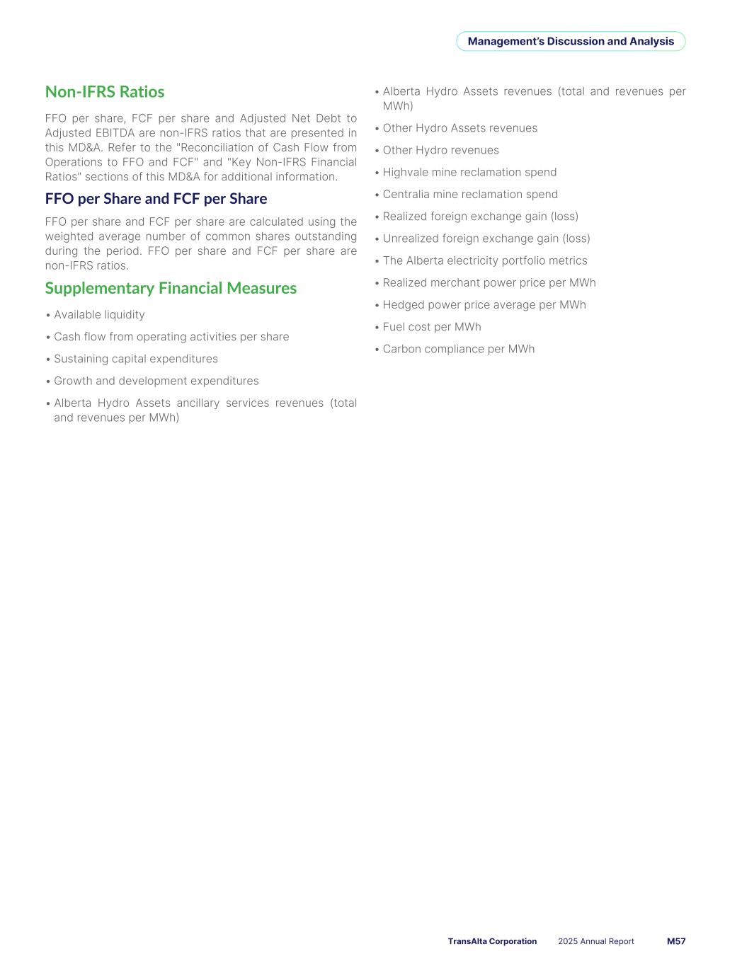 Non-IFRS Ratios FFO per share, FCF per share and Adjusted Net Debt to Adjusted EBITDA are non-IFRS ratios that are presented in this MD&A. Refer to the "Reconciliation of Cash Flow from Operations to FFO and FCF" and "Key Non-IFRS Financial Ratios" sections of this MD&A for additional information. FFO per Share and FCF per Share FFO per share and FCF per share are calculated using the weighted average number of common shares outstanding during the period. FFO per share and FCF per share are non-IFRS ratios. Supplementary Financial Measures • Available liquidity • Cash flow from operating activities per share • Sustaining capital expenditures • Growth and development expenditures • Alberta Hydro Assets ancillary services revenues (total and revenues per MWh) • Alberta Hydro Assets revenues (total and revenues per MWh) • Other Hydro Assets revenues • Other Hydro revenues • Highvale mine reclamation spend • Centralia mine reclamation spend • Realized foreign exchange gain (loss) • Unrealized foreign exchange gain (loss) • The Alberta electricity portfolio metrics • Realized merchant power price per MWh • Hedged power price average per MWh • Fuel cost per MWh • Carbon compliance per MWh TransAlta Corporation 2025 Annual Report M57