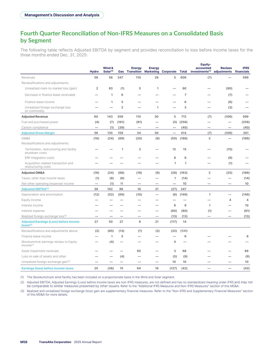 Fourth Quarter Reconciliation of Non-IFRS Measures on a Consolidated Basis by Segment The following table reflects Adjusted EBITDA by segment and provides reconciliation to loss before income taxes for the three months ended Dec. 31, 2025: Revenues 58 58 347 110 28 5 606 (7) — 599 Reclassifications and adjustments: Unrealized mark-to-market loss (gain) 2 83 (1) 5 1 — 90 — (90) — Decrease in finance lease receivable — 1 6 — — — 7 — (7) — Finance lease income — 1 5 — — — 6 — (6) — Unrealized foreign exchange loss on commodity — — 2 — 1 — 3 — (3) — Adjusted Revenue 60 143 359 115 30 5 712 (7) (106) 599 Fuel and purchased power (4) (7) (161) (81) — (5) (258) — — (258) Carbon compliance — (1) (39) — — — (40) — — (40) Adjusted Gross Margin 56 135 159 34 30 — 414 (7) (106) 301 OM&A (16) (24) (69) (20) (9) (50) (188) 2 — (186) Reclassifications and adjustments: Termination, restructuring and facility shutdown costs — — 1 2 — 12 15 — (15) — ERP integration costs — — — — — 9 9 — (9) — Acquisition-related transaction and restructuring costs — — — — — 1 1 — (1) — Adjusted OM&A (16) (24) (68) (18) (9) (28) (163) 2 (25) (186) Taxes, other than income taxes (1) (8) (6) — — 1 (14) — — (14) Net other operating (expense) income — (1) 11 — — — 10 — — 10 Adjusted EBITDA(2) 39 102 96 16 21 (27) 247 Depreciation and amortization (12) (52) (69) (10) — (6) (149) 1 — (148) Equity income — — — — — — — — 4 4 Interest income — — — — — 9 9 1 — 10 Interest expense — — — — — (80) (80) (1) — (81) Realized foreign exchange loss(3) — — — — — (13) (13) — — (13) Adjusted Earnings (Loss) before income taxes(2) 27 50 27 6 21 (117) 14 Reclassifications and adjustments above (2) (85) (13) (7) (2) (22) (131) Finance lease income — 1 5 — — — 6 — — 6 Skookumchuk earnings reclass to Equity income(1) — (4) — — — 4 — — — — Asset impairment reversals — — — 65 — 3 68 — — 68 Loss on sale of assets and other — — (4) — — (5) (9) — — (9) Unrealized foreign exchange gain(3) — — — — — 10 10 — — 10 Earnings (loss) before income taxes 25 (38) 15 64 19 (127) (42) — — (42) Hydro Wind & Solar(1) Gas Energy Transition Energy Marketing Corporate Total Equity- accounted investments(1) Reclass adjustments IFRS financials (1) The Skookumchuck wind facility has been included on a proportionate basis in the Wind and Solar segment. (2) Adjusted EBITDA, Adjusted Earnings (Loss) before income taxes are non-IFRS measures, are not defined and has no standardized meaning under IFRS and may not be comparable to similar measures presented by other issuers. Refer to the "Additional IFRS Measures and Non-IFRS Measures" section of this MD&A. (3) Realized and unrealized foreign exchange (loss) gain are supplementary financial measures. Refer to the "Non-IFRS and Supplementary Financial Measures" section of this MD&A for more details. M58 TransAlta Corporation 2025 Annual Report
