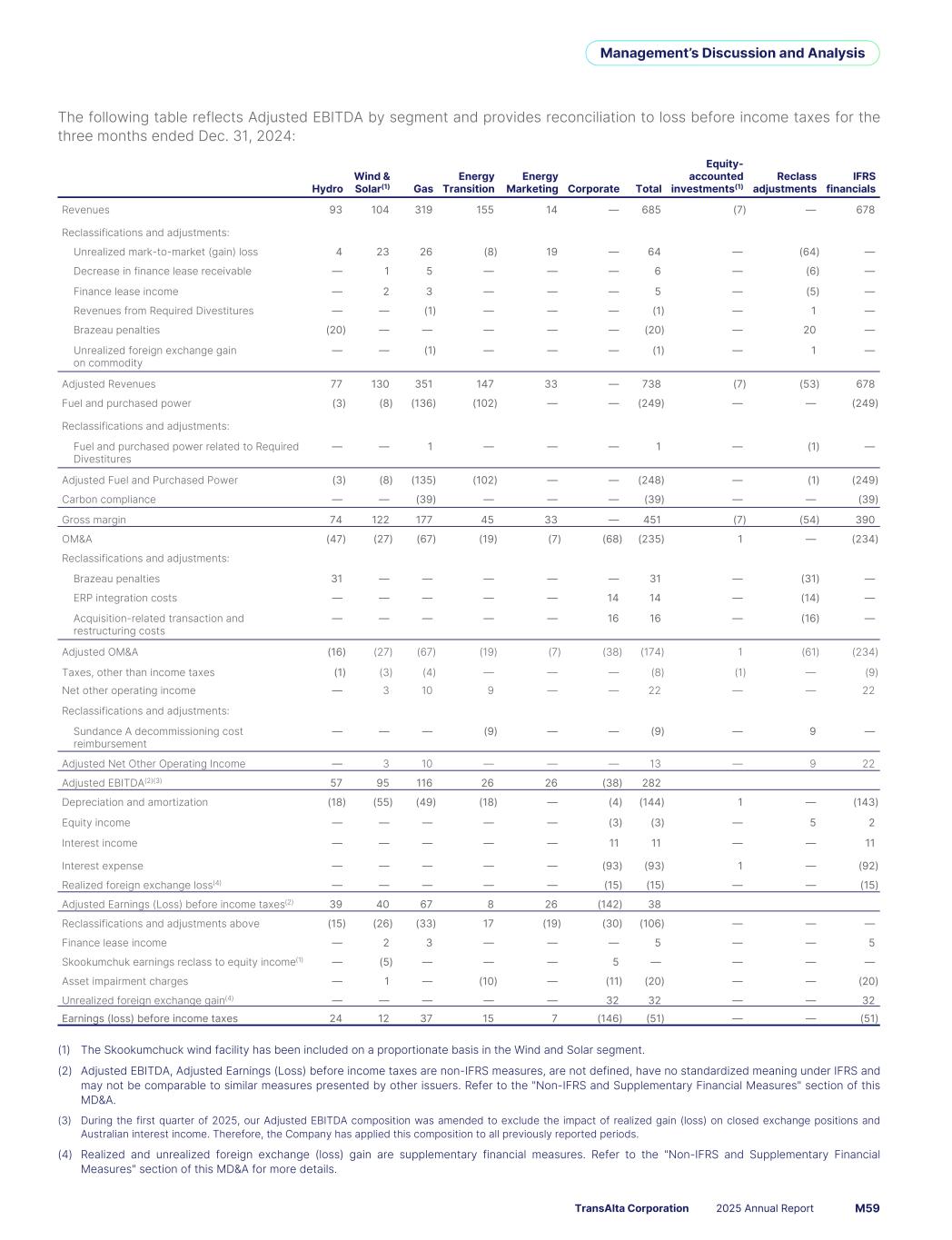 The following table reflects Adjusted EBITDA by segment and provides reconciliation to loss before income taxes for the three months ended Dec. 31, 2024: Hydro Wind & Solar(1) Gas Energy Transition Energy Marketing Corporate Total Equity- accounted investments(1) Reclass adjustments IFRS financials Revenues 93 104 319 155 14 — 685 (7) — 678 Reclassifications and adjustments: Unrealized mark-to-market (gain) loss 4 23 26 (8) 19 — 64 — (64) — Decrease in finance lease receivable — 1 5 — — — 6 — (6) — Finance lease income — 2 3 — — — 5 — (5) — Revenues from Required Divestitures — — (1) — — — (1) — 1 — Brazeau penalties (20) — — — — — (20) — 20 — Unrealized foreign exchange gain on commodity — — (1) — — — (1) — 1 — Adjusted Revenues 77 130 351 147 33 — 738 (7) (53) 678 Fuel and purchased power (3) (8) (136) (102) — — (249) — — (249) Reclassifications and adjustments: Fuel and purchased power related to Required Divestitures — — 1 — — — 1 — (1) — Adjusted Fuel and Purchased Power (3) (8) (135) (102) — — (248) — (1) (249) Carbon compliance — — (39) — — — (39) — — (39) Gross margin 74 122 177 45 33 — 451 (7) (54) 390 OM&A (47) (27) (67) (19) (7) (68) (235) 1 — (234) Reclassifications and adjustments: Brazeau penalties 31 — — — — — 31 — (31) — ERP integration costs — — — — — 14 14 — (14) — Acquisition-related transaction and restructuring costs — — — — — 16 16 — (16) — Adjusted OM&A (16) (27) (67) (19) (7) (38) (174) 1 (61) (234) Taxes, other than income taxes (1) (3) (4) — — — (8) (1) — (9) Net other operating income — 3 10 9 — — 22 — — 22 Reclassifications and adjustments: Sundance A decommissioning cost reimbursement — — — (9) — — (9) — 9 — Adjusted Net Other Operating Income — 3 10 — — — 13 — 9 22 Adjusted EBITDA(2)(3) 57 95 116 26 26 (38) 282 Depreciation and amortization (18) (55) (49) (18) — (4) (144) 1 — (143) Equity income — — — — — (3) (3) — 5 2 Interest income — — — — — 11 11 — — 11 Interest expense — — — — — (93) (93) 1 — (92) Realized foreign exchange loss(4) — — — — — (15) (15) — — (15) Adjusted Earnings (Loss) before income taxes(2) 39 40 67 8 26 (142) 38 Reclassifications and adjustments above (15) (26) (33) 17 (19) (30) (106) — — — Finance lease income — 2 3 — — — 5 — — 5 Skookumchuk earnings reclass to equity income(1) — (5) — — — 5 — — — — Asset impairment charges — 1 — (10) — (11) (20) — — (20) Unrealized foreign exchange gain(4) — — — — — 32 32 — — 32 Earnings (loss) before income taxes 24 12 37 15 7 (146) (51) — — (51) (1) The Skookumchuck wind facility has been included on a proportionate basis in the Wind and Solar segment. (2) Adjusted EBITDA, Adjusted Earnings (Loss) before income taxes are non-IFRS measures, are not defined, have no standardized meaning under IFRS and may not be comparable to similar measures presented by other issuers. Refer to the "Non-IFRS and Supplementary Financial Measures" section of this MD&A. (3) During the first quarter of 2025, our Adjusted EBITDA composition was amended to exclude the impact of realized gain (loss) on closed exchange positions and Australian interest income. Therefore, the Company has applied this composition to all previously reported periods. (4) Realized and unrealized foreign exchange (loss) gain are supplementary financial measures. Refer to the "Non-IFRS and Supplementary Financial Measures" section of this MD&A for more details. TransAlta Corporation 2025 Annual Report M59