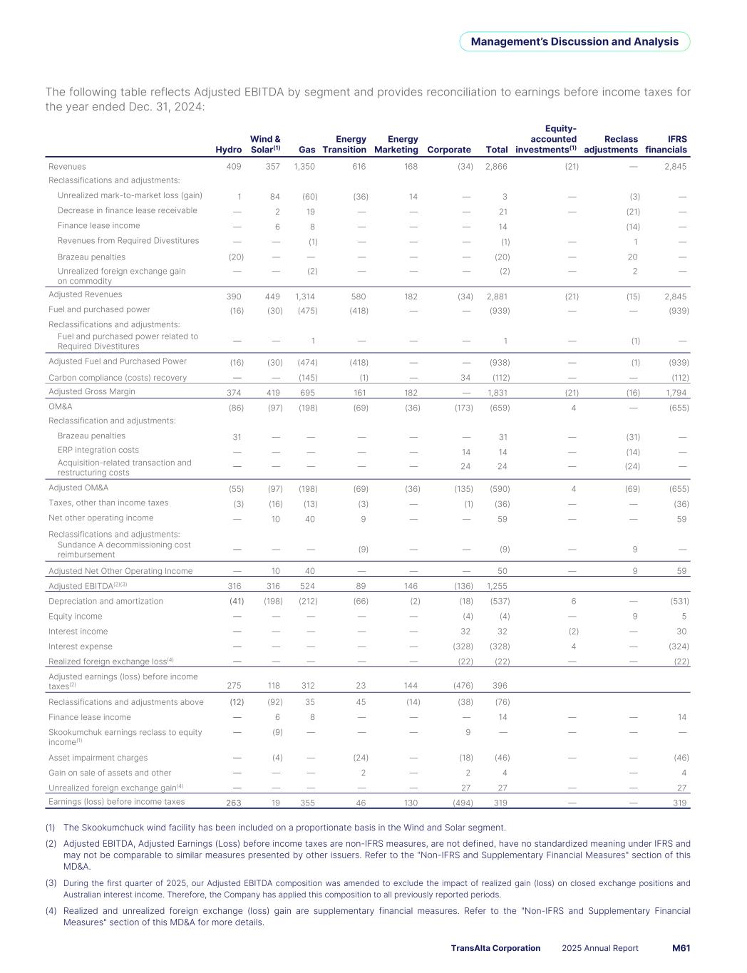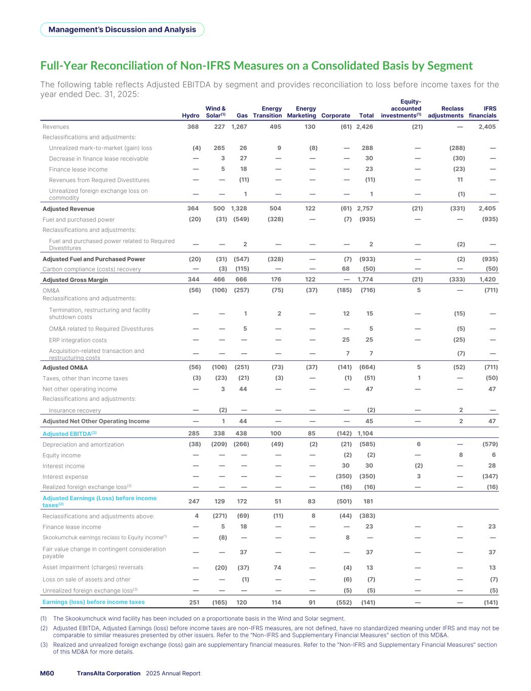 Full-Year Reconciliation of Non-IFRS Measures on a Consolidated Basis by Segment The following table reflects Adjusted EBITDA by segment and provides reconciliation to loss before income taxes for the year ended Dec. 31, 2025: Hydro Wind & Solar(1) Gas Energy Transition Energy Marketing Corporate Total Equity- accounted investments(1) Reclass adjustments IFRS financials Revenues 368 227 1,267 495 130 (61) 2,426 (21) — 2,405 Reclassifications and adjustments: Unrealized mark-to-market (gain) loss (4) 265 26 9 (8) — 288 — (288) — Decrease in finance lease receivable — 3 27 — — — 30 — (30) — Finance lease income — 5 18 — — — 23 — (23) — Revenues from Required Divestitures — — (11) — — — (11) — 11 — Unrealized foreign exchange loss on commodity — — 1 — — — 1 — (1) — Adjusted Revenue 364 500 1,328 504 122 (61) 2,757 (21) (331) 2,405 Fuel and purchased power (20) (31) (549) (328) — (7) (935) — — (935) Reclassifications and adjustments: Fuel and purchased power related to Required Divestitures — — 2 — — — 2 — (2) — Adjusted Fuel and Purchased Power (20) (31) (547) (328) — (7) (933) — (2) (935) Carbon compliance (costs) recovery — (3) (115) — — 68 (50) — — (50) Adjusted Gross Margin 344 466 666 176 122 — 1,774 (21) (333) 1,420 OM&A (56) (106) (257) (75) (37) (185) (716) 5 — (711) Reclassifications and adjustments: Termination, restructuring and facility shutdown costs — — 1 2 — 12 15 — (15) — OM&A related to Required Divestitures — — 5 — — — 5 — (5) — ERP integration costs — — — — — 25 25 — (25) — Acquisition-related transaction and restructuring costs — — — — — 7 7 (7) — Adjusted OM&A (56) (106) (251) (73) (37) (141) (664) 5 (52) (711) Taxes, other than income taxes (3) (23) (21) (3) — (1) (51) 1 — (50) Net other operating income — 3 44 — — — 47 — — 47 Reclassifications and adjustments: Insurance recovery — (2) — — — — (2) — 2 — Adjusted Net Other Operating Income — 1 44 — — — 45 — 2 47 Adjusted EBITDA(2) 285 338 438 100 85 (142) 1,104 Depreciation and amortization (38) (209) (266) (49) (2) (21) (585) 6 — (579) Equity income — — — — — (2) (2) — 8 6 Interest income — — — — — 30 30 (2) — 28 Interest expense — — — — — (350) (350) 3 — (347) Realized foreign exchange loss(3) — — — — — (16) (16) — — (16) Adjusted Earnings (Loss) before income taxes(2) 247 129 172 51 83 (501) 181 Reclassifications and adjustments above: 4 (271) (69) (11) 8 (44) (383) Finance lease income — 5 18 — — — 23 — — 23 Skookumchuk earnings reclass to Equity income(1) — (8) — — — 8 — — — — Fair value change in contingent consideration payable — — 37 — — — 37 — — 37 Asset impairment (charges) reversals — (20) (37) 74 — (4) 13 — — 13 Loss on sale of assets and other — — (1) — — (6) (7) — — (7) Unrealized foreign exchange loss(3) — — — — — (5) (5) — — (5) Earnings (loss) before income taxes 251 (165) 120 114 91 (552) (141) — — (141) (1) The Skookumchuck wind facility has been included on a proportionate basis in the Wind and Solar segment. (2) Adjusted EBITDA, Adjusted Earnings (loss) before income taxes are non-IFRS measures, are not defined, have no standardized meaning under IFRS and may not be comparable to similar measures presented by other issuers. Refer to the "Non-IFRS and Supplementary Financial Measures" section of this MD&A. (3) Realized and unrealized foreign exchange (loss) gain are supplementary financial measures. Refer to the "Non-IFRS and Supplementary Financial Measures" section of this MD&A for more details. M60 TransAlta Corporation 2025 Annual Report