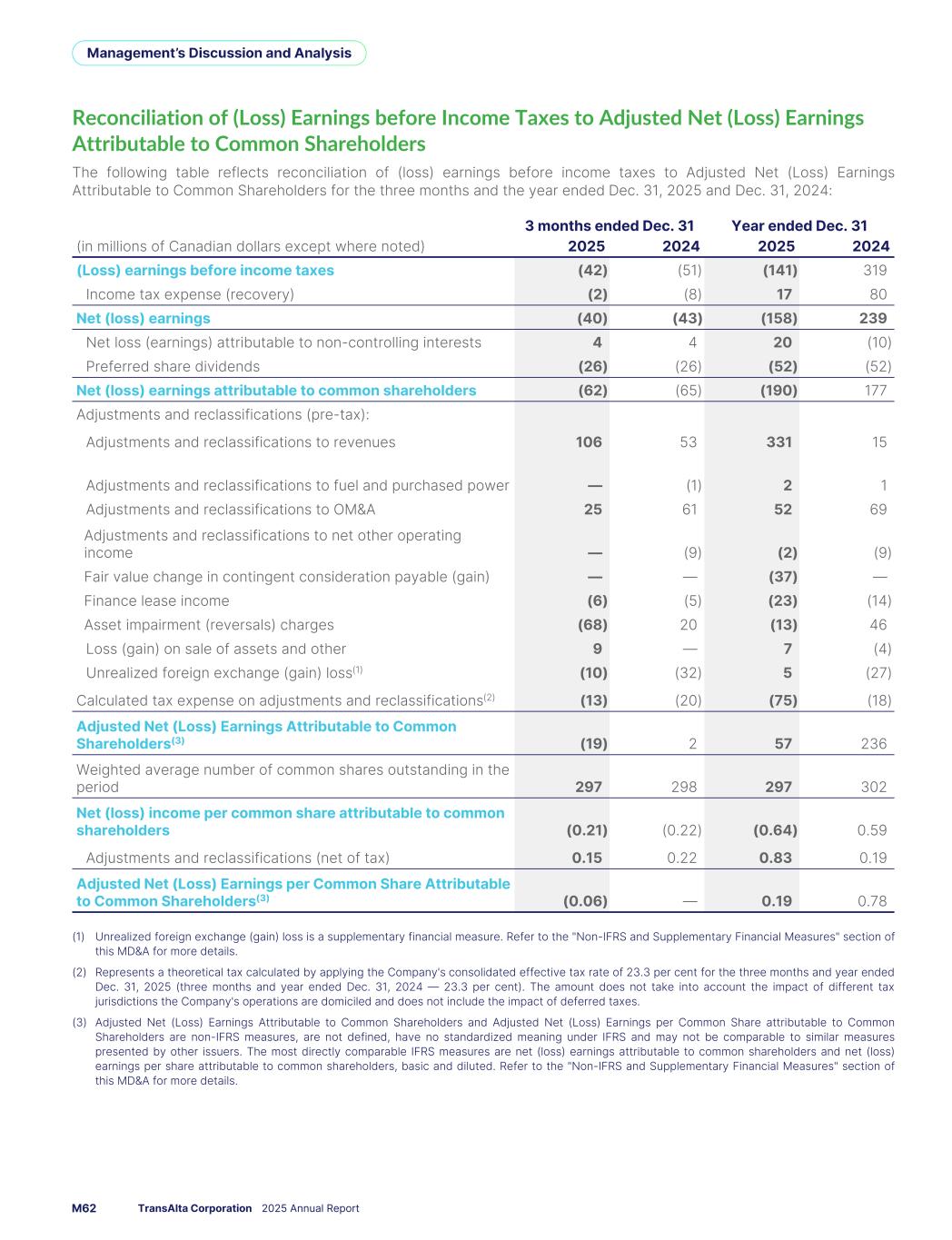 Reconciliation of (Loss) Earnings before Income Taxes to Adjusted Net (Loss) Earnings Attributable to Common Shareholders The following table reflects reconciliation of (loss) earnings before income taxes to Adjusted Net (Loss) Earnings Attributable to Common Shareholders for the three months and the year ended Dec. 31, 2025 and Dec. 31, 2024: 3 months ended Dec. 31 Year ended Dec. 31 (in millions of Canadian dollars except where noted) 2025 2024 2025 2024 (Loss) earnings before income taxes (42) (51) (141) 319 Income tax expense (recovery) (2) (8) 17 80 Net (loss) earnings (40) (43) (158) 239 Net loss (earnings) attributable to non-controlling interests 4 4 20 (10) Preferred share dividends (26) (26) (52) (52) Net (loss) earnings attributable to common shareholders (62) (65) (190) 177 Adjustments and reclassifications (pre-tax):   Adjustments and reclassifications to revenues 106 53 331 15 Adjustments and reclassifications to fuel and purchased power — (1) 2 1 Adjustments and reclassifications to OM&A 25 61 52 69 Adjustments and reclassifications to net other operating income — (9) (2) (9) Fair value change in contingent consideration payable (gain) — — (37) — Finance lease income (6) (5) (23) (14) Asset impairment (reversals) charges (68) 20 (13) 46 Loss (gain) on sale of assets and other 9 — 7 (4) Unrealized foreign exchange (gain) loss(1) (10) (32) 5 (27) Calculated tax expense on adjustments and reclassifications(2) (13) (20) (75) (18) Adjusted Net (Loss) Earnings Attributable to Common Shareholders(3) (19) 2 57 236 Weighted average number of common shares outstanding in the period 297 298 297 302 Net (loss) income per common share attributable to common shareholders (0.21) (0.22) (0.64) 0.59 Adjustments and reclassifications (net of tax) 0.15 0.22 0.83 0.19 Adjusted Net (Loss) Earnings per Common Share Attributable to Common Shareholders(3) (0.06) — 0.19 0.78 (1) Unrealized foreign exchange (gain) loss is a supplementary financial measure. Refer to the "Non-IFRS and Supplementary Financial Measures" section of this MD&A for more details. (2) Represents a theoretical tax calculated by applying the Company's consolidated effective tax rate of 23.3 per cent for the three months and year ended Dec. 31, 2025 (three months and year ended Dec. 31, 2024 — 23.3 per cent). The amount does not take into account the impact of different tax jurisdictions the Company's operations are domiciled and does not include the impact of deferred taxes. (3) Adjusted Net (Loss) Earnings Attributable to Common Shareholders and Adjusted Net (Loss) Earnings per Common Share attributable to Common Shareholders are non-IFRS measures, are not defined, have no standardized meaning under IFRS and may not be comparable to similar measures presented by other issuers. The most directly comparable IFRS measures are net (loss) earnings attributable to common shareholders and net (loss) earnings per share attributable to common shareholders, basic and diluted. Refer to the "Non-IFRS and Supplementary Financial Measures" section of this MD&A for more details. M62 TransAlta Corporation 2025 Annual Report