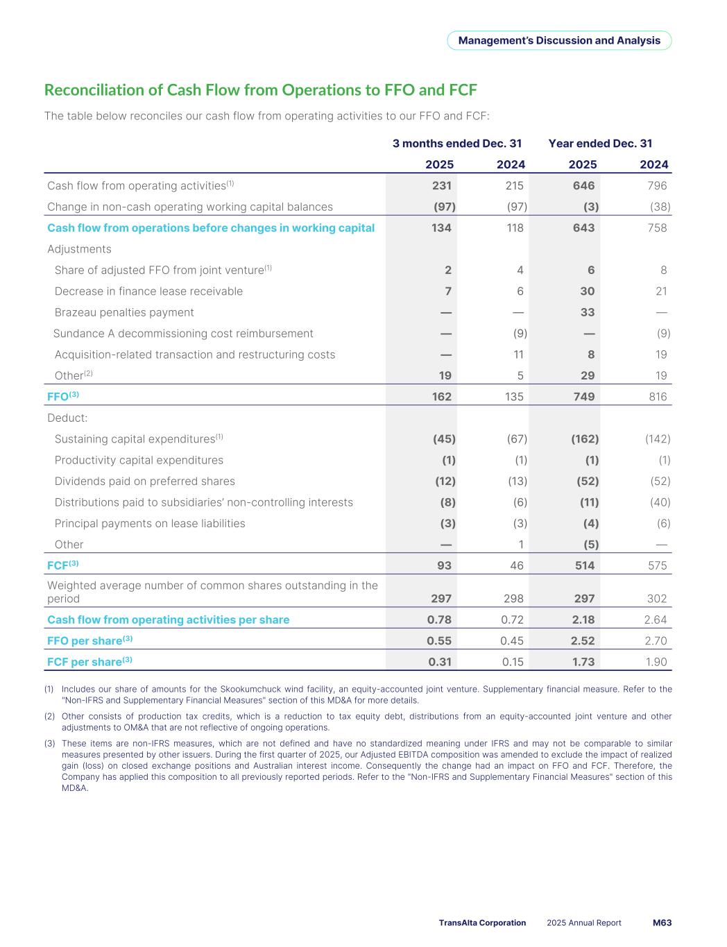 Reconciliation of Cash Flow from Operations to FFO and FCF The table below reconciles our cash flow from operating activities to our FFO and FCF:  3 months ended Dec. 31 Year ended Dec. 31 2025 2024 2025 2024 Cash flow from operating activities(1) 231 215 646 796 Change in non-cash operating working capital balances (97) (97) (3) (38) Cash flow from operations before changes in working capital 134 118 643 758 Adjustments     Share of adjusted FFO from joint venture(1) 2 4 6 8 Decrease in finance lease receivable 7 6 30 21 Brazeau penalties payment — — 33 — Sundance A decommissioning cost reimbursement — (9) — (9) Acquisition-related transaction and restructuring costs — 11 8 19 Other(2) 19 5 29 19 FFO(3) 162 135 749 816 Deduct:     Sustaining capital expenditures(1) (45) (67) (162) (142) Productivity capital expenditures (1) (1) (1) (1) Dividends paid on preferred shares (12) (13) (52) (52) Distributions paid to subsidiaries’ non-controlling interests (8) (6) (11) (40) Principal payments on lease liabilities (3) (3) (4) (6) Other — 1 (5) — FCF(3) 93 46 514 575 Weighted average number of common shares outstanding in the period 297 298 297 302 Cash flow from operating activities per share 0.78 0.72 2.18 2.64 FFO per share(3) 0.55 0.45 2.52 2.70 FCF per share(3) 0.31 0.15 1.73 1.90 (1) Includes our share of amounts for the Skookumchuck wind facility, an equity-accounted joint venture. Supplementary financial measure. Refer to the "Non-IFRS and Supplementary Financial Measures" section of this MD&A for more details. (2) Other consists of production tax credits, which is a reduction to tax equity debt, distributions from an equity-accounted joint venture and other adjustments to OM&A that are not reflective of ongoing operations. (3) These items are non-IFRS measures, which are not defined and have no standardized meaning under IFRS and may not be comparable to similar measures presented by other issuers. During the first quarter of 2025, our Adjusted EBITDA composition was amended to exclude the impact of realized gain (loss) on closed exchange positions and Australian interest income. Consequently the change had an impact on FFO and FCF. Therefore, the Company has applied this composition to all previously reported periods. Refer to the "Non-IFRS and Supplementary Financial Measures" section of this MD&A. TransAlta Corporation 2025 Annual Report M63