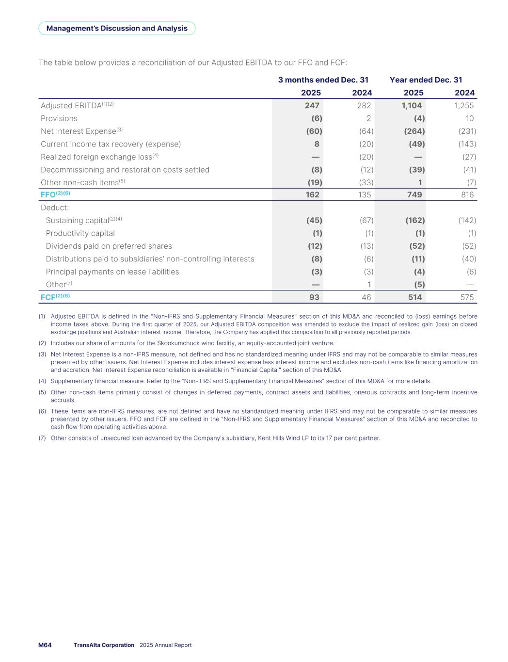 The table below provides a reconciliation of our Adjusted EBITDA to our FFO and FCF: 3 months ended Dec. 31 Year ended Dec. 31 2025 2024 2025 2024 Adjusted EBITDA(1)(2) 247 282 1,104 1,255 Provisions (6) 2 (4) 10 Net Interest Expense(3) (60) (64) (264) (231) Current income tax recovery (expense) 8 (20) (49) (143) Realized foreign exchange loss(4) — (20) — (27) Decommissioning and restoration costs settled (8) (12) (39) (41) Other non-cash items(5) (19) (33) 1 (7) FFO(2)(6) 162 135 749 816 Deduct: Sustaining capital(2)(4) (45) (67) (162) (142) Productivity capital (1) (1) (1) (1) Dividends paid on preferred shares (12) (13) (52) (52) Distributions paid to subsidiaries’ non-controlling interests (8) (6) (11) (40) Principal payments on lease liabilities (3) (3) (4) (6) Other(7) — 1 (5) — FCF(2)(6) 93 46 514 575 (1) Adjusted EBITDA is defined in the "Non-IFRS and Supplementary Financial Measures" section of this MD&A and reconciled to (loss) earnings before income taxes above. During the first quarter of 2025, our Adjusted EBITDA composition was amended to exclude the impact of realized gain (loss) on closed exchange positions and Australian interest income. Therefore, the Company has applied this composition to all previously reported periods. (2) Includes our share of amounts for the Skookumchuck wind facility, an equity-accounted joint venture. (3) Net Interest Expense is a non-IFRS measure, not defined and has no standardized meaning under IFRS and may not be comparable to similar measures presented by other issuers. Net Interest Expense includes interest expense less interest income and excludes non-cash items like financing amortization and accretion. Net Interest Expense reconciliation is available in "Financial Capital" section of this MD&A (4) Supplementary financial measure. Refer to the "Non-IFRS and Supplementary Financial Measures" section of this MD&A for more details. (5) Other non-cash items primarily consist of changes in deferred payments, contract assets and liabilities, onerous contracts and long-term incentive accruals. (6) These items are non-IFRS measures, are not defined and have no standardized meaning under IFRS and may not be comparable to similar measures presented by other issuers. FFO and FCF are defined in the "Non-IFRS and Supplementary Financial Measures" section of this MD&A and reconciled to cash flow from operating activities above. (7) Other consists of unsecured loan advanced by the Company's subsidiary, Kent Hills Wind LP to its 17 per cent partner. M64 TransAlta Corporation 2025 Annual Report