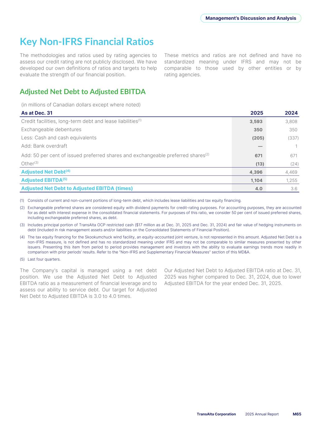 Key Non-IFRS Financial Ratios The methodologies and ratios used by rating agencies to assess our credit rating are not publicly disclosed. We have developed our own definitions of ratios and targets to help evaluate the strength of our financial position. These metrics and ratios are not defined and have no standardized meaning under IFRS and may not be comparable to those used by other entities or by rating agencies. Adjusted Net Debt to Adjusted EBITDA (in millions of Canadian dollars except where noted) As at Dec. 31 2025 2024 Credit facilities, long-term debt and lease liabilities(1) 3,593 3,808 Exchangeable debentures 350 350 Less: Cash and cash equivalents (205) (337) Add: Bank overdraft — 1 Add: 50 per cent of issued preferred shares and exchangeable preferred shares(2) 671 671 Other(3) (13) (24) Adjusted Net Debt(4) 4,396 4,469 Adjusted EBITDA(5) 1,104 1,255 Adjusted Net Debt to Adjusted EBITDA (times) 4.0 3.6 (1) Consists of current and non-current portions of long-term debt, which includes lease liabilities and tax equity financing. (2) Exchangeable preferred shares are considered equity with dividend payments for credit-rating purposes. For accounting purposes, they are accounted for as debt with interest expense in the consolidated financial statements. For purposes of this ratio, we consider 50 per cent of issued preferred shares, including exchangeable preferred shares, as debt. (3) Includes principal portion of TransAlta OCP restricted cash ($17 million as at Dec. 31, 2025 and Dec. 31, 2024) and fair value of hedging instruments on debt (included in risk management assets and/or liabilities on the Consolidated Statements of Financial Position). (4) The tax equity financing for the Skookumchuck wind facility, an equity-accounted joint venture, is not represented in this amount. Adjusted Net Debt is a non-IFRS measure, is not defined and has no standardized meaning under IFRS and may not be comparable to similar measures presented by other issuers. Presenting this item from period to period provides management and investors with the ability to evaluate earnings trends more readily in comparison with prior periods’ results. Refer to the "Non-IFRS and Supplementary Financial Measures" section of this MD&A. (5) Last four quarters. The Company's capital is managed using a net debt position. We use the Adjusted Net Debt to Adjusted EBITDA ratio as a measurement of financial leverage and to assess our ability to service debt. Our target for Adjusted Net Debt to Adjusted EBITDA is 3.0 to 4.0 times. Our Adjusted Net Debt to Adjusted EBITDA ratio at Dec. 31, 2025 was higher compared to Dec. 31, 2024, due to lower Adjusted EBITDA for the year ended Dec. 31, 2025. TransAlta Corporation 2025 Annual Report M65