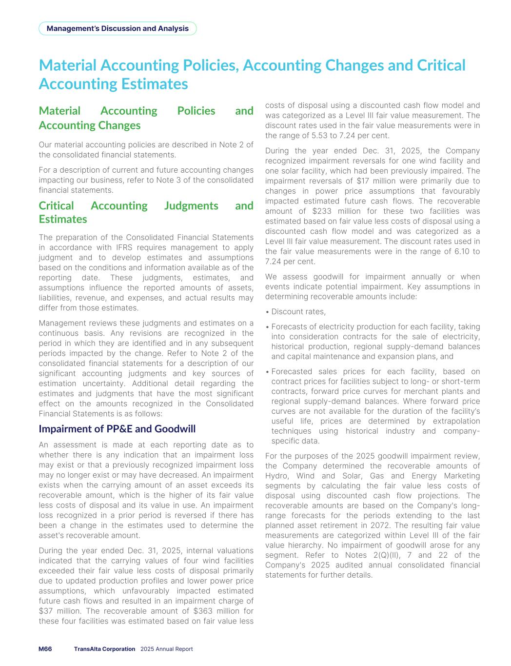 Material Accounting Policies, Accounting Changes and Critical Accounting Estimates Material Accounting Policies and Accounting Changes Our material accounting policies are described in Note 2 of the consolidated financial statements. For a description of current and future accounting changes impacting our business, refer to Note 3 of the consolidated financial statements. Critical Accounting Judgments and Estimates The preparation of the Consolidated Financial Statements in accordance with IFRS requires management to apply judgment and to develop estimates and assumptions based on the conditions and information available as of the reporting date. These judgments, estimates, and assumptions influence the reported amounts of assets, liabilities, revenue, and expenses, and actual results may differ from those estimates. Management reviews these judgments and estimates on a continuous basis. Any revisions are recognized in the period in which they are identified and in any subsequent periods impacted by the change. Refer to Note 2 of the consolidated financial statements for a description of our significant accounting judgments and key sources of estimation uncertainty. Additional detail regarding the estimates and judgments that have the most significant effect on the amounts recognized in the Consolidated Financial Statements is as follows: Impairment of PP&E and Goodwill An assessment is made at each reporting date as to whether there is any indication that an impairment loss may exist or that a previously recognized impairment loss may no longer exist or may have decreased. An impairment exists when the carrying amount of an asset exceeds its recoverable amount, which is the higher of its fair value less costs of disposal and its value in use. An impairment loss recognized in a prior period is reversed if there has been a change in the estimates used to determine the asset's recoverable amount. During the year ended Dec. 31, 2025, internal valuations indicated that the carrying values of four wind facilities exceeded their fair value less costs of disposal primarily due to updated production profiles and lower power price assumptions, which unfavourably impacted estimated future cash flows and resulted in an impairment charge of $37 million. The recoverable amount of $363 million for these four facilities was estimated based on fair value less costs of disposal using a discounted cash flow model and was categorized as a Level III fair value measurement. The discount rates used in the fair value measurements were in the range of 5.53 to 7.24 per cent. During the year ended Dec. 31, 2025, the Company recognized impairment reversals for one wind facility and one solar facility, which had been previously impaired. The impairment reversals of $17 million were primarily due to changes in power price assumptions that favourably impacted estimated future cash flows. The recoverable amount of $233 million for these two facilities was estimated based on fair value less costs of disposal using a discounted cash flow model and was categorized as a Level III fair value measurement. The discount rates used in the fair value measurements were in the range of 6.10 to 7.24 per cent. We assess goodwill for impairment annually or when events indicate potential impairment. Key assumptions in determining recoverable amounts include: • Discount rates, • Forecasts of electricity production for each facility, taking into consideration contracts for the sale of electricity, historical production, regional supply-demand balances and capital maintenance and expansion plans, and • Forecasted sales prices for each facility, based on contract prices for facilities subject to long- or short-term contracts, forward price curves for merchant plants and regional supply-demand balances. Where forward price curves are not available for the duration of the facility’s useful life, prices are determined by extrapolation techniques using historical industry and company- specific data. For the purposes of the 2025 goodwill impairment review, the Company determined the recoverable amounts of Hydro, Wind and Solar, Gas and Energy Marketing segments by calculating the fair value less costs of disposal using discounted cash flow projections. The recoverable amounts are based on the Company's long- range forecasts for the periods extending to the last planned asset retirement in 2072. The resulting fair value measurements are categorized within Level III of the fair value hierarchy. No impairment of goodwill arose for any segment. Refer to Notes 2(Q)(II), 7 and 22 of the Company's 2025 audited annual consolidated financial statements for further details. M66 TransAlta Corporation 2025 Annual Report