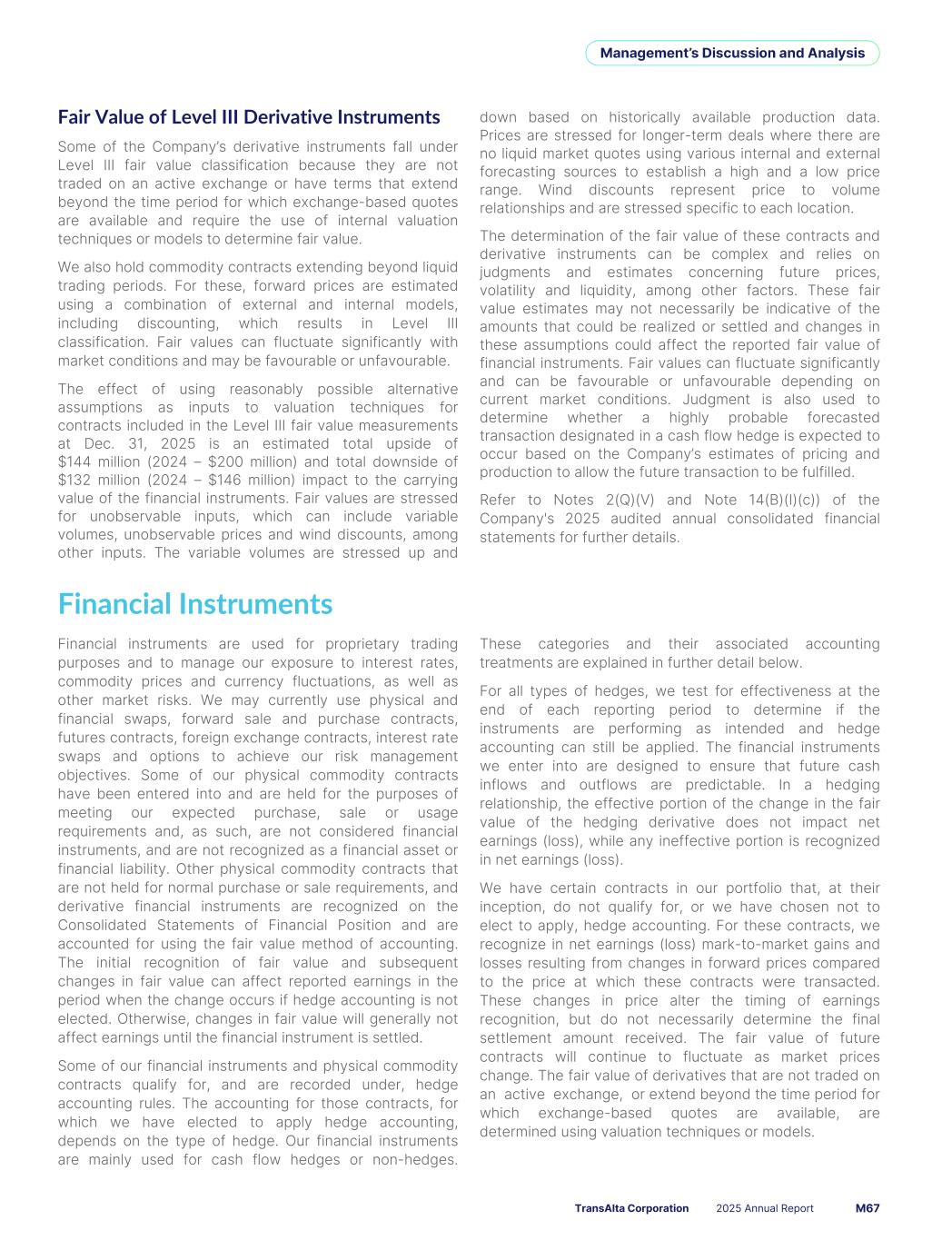 Fair Value of Level III Derivative Instruments Some of the Company’s derivative instruments fall under Level III fair value classification because they are not traded on an active exchange or have terms that extend beyond the time period for which exchange-based quotes are available and require the use of internal valuation techniques or models to determine fair value. We also hold commodity contracts extending beyond liquid trading periods. For these, forward prices are estimated using a combination of external and internal models, including discounting, which results in Level III classification. Fair values can fluctuate significantly with market conditions and may be favourable or unfavourable. The effect of using reasonably possible alternative assumptions as inputs to valuation techniques for contracts included in the Level III fair value measurements at Dec. 31, 2025 is an estimated total upside of $144  million (2024 – $200 million) and total downside of $132  million (2024 – $146  million) impact to the carrying value of the financial instruments. Fair values are stressed for unobservable inputs, which can include variable volumes, unobservable prices and wind discounts, among other inputs. The variable volumes are stressed up and down based on historically available production data. Prices are stressed for longer-term deals where there are no liquid market quotes using various internal and external forecasting sources to establish a high and a low price range. Wind discounts represent price to volume relationships and are stressed specific to each location. The determination of the fair value of these contracts and derivative instruments can be complex and relies on judgments and estimates concerning future prices, volatility and liquidity, among other factors. These fair value estimates may not necessarily be indicative of the amounts that could be realized or settled and changes in these assumptions could affect the reported fair value of financial instruments. Fair values can fluctuate significantly and can be favourable or unfavourable depending on current market conditions. Judgment is also used to determine whether a highly probable forecasted transaction designated in a cash flow hedge is expected to occur based on the Company’s estimates of pricing and production to allow the future transaction to be fulfilled. Refer to Notes 2(Q)(V) and Note 14(B)(I)(c)) of the Company's 2025 audited annual consolidated financial statements for further details. Financial Instruments Financial instruments are used for proprietary trading purposes and to manage our exposure to interest rates, commodity prices and currency fluctuations, as well as other market risks. We may currently use physical and financial swaps, forward sale and purchase contracts, futures contracts, foreign exchange contracts, interest rate swaps and options to achieve our risk management objectives. Some of our physical commodity contracts have been entered into and are held for the purposes of meeting our expected purchase, sale or usage requirements and, as such, are not considered financial instruments, and are not recognized as a financial asset or financial liability. Other physical commodity contracts that are not held for normal purchase or sale requirements, and derivative financial instruments are recognized on the Consolidated Statements of Financial Position and are accounted for using the fair value method of accounting. The initial recognition of fair value and subsequent changes in fair value can affect reported earnings in the period when the change occurs if hedge accounting is not elected. Otherwise, changes in fair value will generally not affect earnings until the financial instrument is settled. Some of our financial instruments and physical commodity contracts qualify for, and are recorded under, hedge accounting rules. The accounting for those contracts, for which we have elected to apply hedge accounting, depends on the type of hedge. Our financial instruments are mainly used for cash flow hedges or non-hedges. These categories and their associated accounting treatments are explained in further detail below. For all types of hedges, we test for effectiveness at the end of each reporting period to determine if the instruments are performing as intended and hedge accounting can still be applied. The financial instruments we enter into are designed to ensure that future cash inflows and outflows are predictable. In a hedging relationship, the effective portion of the change in the fair value of the hedging derivative does not impact net earnings (loss), while any ineffective portion is recognized in net earnings (loss). We have certain contracts in our portfolio that, at their inception, do not qualify for, or we have chosen not to elect to apply, hedge accounting. For these contracts, we recognize in net earnings (loss) mark-to-market gains and losses resulting from changes in forward prices compared to the price at which these contracts were transacted. These changes in price alter the timing of earnings recognition, but do not necessarily determine the final settlement amount received. The fair value of future contracts will continue to fluctuate as market prices change. The fair value of derivatives that are not traded on an active exchange, or extend beyond the time period for which exchange-based quotes are available, are determined using valuation techniques or models. TransAlta Corporation 2025 Annual Report M67