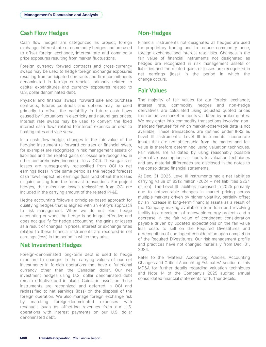 Cash Flow Hedges Cash flow hedges are categorized as project, foreign exchange, interest rate or commodity hedges and are used to offset foreign exchange, interest rate and commodity price exposures resulting from market fluctuations. Foreign currency forward contracts and cross-currency swaps may be used to hedge foreign exchange exposures resulting from anticipated contracts and firm commitments denominated in foreign currencies, primarily related to capital expenditures and currency exposures related to U.S. dollar denominated debt. Physical and financial swaps, forward sale and purchase contracts, futures contracts and options may be used primarily to offset the variability in future cash flows caused by fluctuations in electricity and natural gas prices. Interest rate swaps may be used to convert the fixed interest cash flows related to interest expense on debt to floating rates and vice versa. In a cash flow hedge, changes in the fair value of the hedging instrument (a forward contract or financial swap, for example) are recognized in risk management assets or liabilities and the related gains or losses are recognized in other comprehensive income or loss (OCI). These gains or losses are subsequently reclassified from OCI to net earnings (loss) in the same period as the hedged forecast cash flows impact net earnings (loss) and offset the losses or gains arising from the forecast transactions. For project hedges, the gains and losses reclassified from OCI are included in the carrying amount of the related PP&E. Hedge accounting follows a principles-based approach for qualifying hedges that is aligned with an entity's approach to risk management. When we do not elect hedge accounting or when the hedge is no longer effective and does not qualify for hedge accounting, the gains or losses as a result of changes in prices, interest or exchange rates related to these financial instruments are recorded in net earnings (loss) in the period in which they arise. Net Investment Hedges Foreign-denominated long-term debt is used to hedge exposure to changes in the carrying values of our net investments in foreign operations that have a functional currency other than the Canadian dollar. Our net investment hedges using U.S. dollar denominated debt remain effective and in place. Gains or losses on these instruments are recognized and deferred in OCI and reclassified to net earnings (loss) on the disposal of the foreign operation. We also manage foreign exchange risk by matching foreign-denominated expenses with revenues, such as offsetting revenues from our U.S. operations with interest payments on our U.S. dollar denominated debt. Non-Hedges Financial instruments not designated as hedges are used for proprietary trading and to reduce commodity price, foreign exchange and interest rate risks. Changes in the fair value of financial instruments not designated as hedges are recognized in risk management assets or liabilities and the related gains or losses are recognized in net earnings (loss) in the period in which the change occurs. Fair Values The majority of fair values for our foreign exchange, interest rate, commodity hedges and non-hedge derivatives are calculated using adjusted quoted prices from an active market or inputs validated by broker quotes. We may enter into commodity transactions involving non- standard features for which market-observable data is not available. These transactions are defined under IFRS as Level III instruments. Level III instruments incorporate inputs that are not observable from the market and fair value is therefore determined using valuation techniques. Fair values are validated by using reasonably possible alternative assumptions as inputs to valuation techniques and any material differences are disclosed in the notes to the consolidated financial statements. At Dec. 31, 2025, Level III instruments had a net liabilities carrying value of $312 million (2024 – net liabilities $234 million). The Level III liabilities increased in 2025 primarily due to unfavourable changes in market pricing across multiple markets driven by higher volatility, partially offset by an increase in long-term financial assets as a result of the Company making available a term loan and revolving facility to a developer of renewable energy projects and a decrease in the fair value of contingent consideration payable driven by updated expectations on the fair value less costs to sell on the Required Divestitures and derecognition of contingent consideration upon completion of the Required Divestitures. Our risk management profile and practices have not changed materially from Dec. 31, 2024. Refer to the "Material Accounting Policies, Accounting Changes and Critical Accounting Estimates" section of this MD&A for further details regarding valuation techniques and Note 14 of the Company's 2025 audited annual consolidated financial statements for further details. M68 TransAlta Corporation 2025 Annual Report