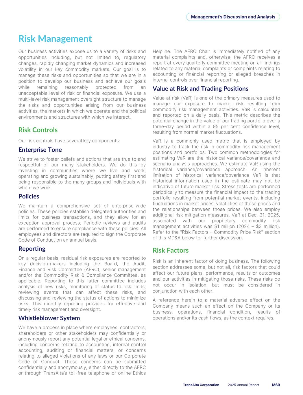 Risk Management Our business activities expose us to a variety of risks and opportunities including, but not limited to, regulatory changes, rapidly changing market dynamics and increased volatility in our key commodity markets. Our goal is to manage these risks and opportunities so that we are in a position to develop our business and achieve our goals while remaining reasonably protected from an unacceptable level of risk or financial exposure. We use a multi-level risk management oversight structure to manage the risks and opportunities arising from our business activities, the markets in which we operate and the political environments and structures with which we interact. Risk Controls Our risk controls have several key components: Enterprise Tone We strive to foster beliefs and actions that are true to and respectful of our many stakeholders. We do this by investing in communities where we live and work, operating and growing sustainably, putting safety first and being responsible to the many groups and individuals with whom we work. Policies We maintain a comprehensive set of enterprise-wide policies. These policies establish delegated authorities and limits for business transactions, and they allow for an exception approval process. Periodic reviews and audits are performed to ensure compliance with these policies. All employees and directors are required to sign the Corporate Code of Conduct on an annual basis. Reporting On a regular basis, residual risk exposures are reported to key decision-makers including the Board, the Audit, Finance and Risk Committee (AFRC), senior management and/or the Commodity Risk & Compliance Committee, as applicable. Reporting to this latter committee includes analysis of new risks, monitoring of status to risk limits, reviewing events that can affect these risks, and discussing and reviewing the status of actions to minimize risks. This monthly reporting provides for effective and timely risk management and oversight. Whistleblower System We have a process in place where employees, contractors, shareholders or other stakeholders may confidentially or anonymously report any potential legal or ethical concerns, including concerns relating to accounting, internal control accounting, auditing or financial matters, or concerns relating to alleged violations of any laws or our Corporate Code of Conduct.  These concerns can be submitted confidentially and anonymously, either directly to the AFRC or through TransAlta’s toll-free telephone or online Ethics Helpline. The AFRC Chair is immediately notified of any material complaints and, otherwise, the AFRC receives a report at every quarterly committee meeting on all findings related to any material complaints or complaints relating to accounting or financial reporting or alleged breaches in internal controls over financial reporting. Value at Risk and Trading Positions Value at risk (VaR) is one of the primary measures used to manage our exposure to market risk resulting from commodity risk management activities. VaR is calculated and reported on a daily basis. This metric describes the potential change in the value of our trading portfolio over a three-day period within a 95 per cent confidence level, resulting from normal market fluctuations. VaR is a commonly used metric that is employed by industry to track the risk in commodity risk management positions and portfolios. Two common methodologies for estimating VaR are the historical variance/covariance and scenario analysis approaches. We estimate VaR using the historical variance/covariance approach. An inherent limitation of historical variance/covariance VaR is that historical information used in the estimate may not be indicative of future market risk. Stress tests are performed periodically to measure the financial impact to the trading portfolio resulting from potential market events, including fluctuations in market prices, volatilities of those prices and the relationships between those prices. We also employ additional risk mitigation measures. VaR at Dec. 31, 2025, associated with our proprietary commodity risk management activities was $1 million (2024 – $3 million). Refer to the "Risk Factors – Commodity Price Risk" section of this MD&A below for further discussion. Risk Factors Risk is an inherent factor of doing business. The following section addresses some, but not all, risk factors that could affect our future plans, performance, results or outcomes and our activities in mitigating those risks. These risks do not occur in isolation, but must be considered in conjunction with each other. A reference herein to a material adverse effect on the Company means such an effect on the Company or its business, operations, financial condition, results of operations and/or its cash flows, as the context requires. TransAlta Corporation 2025 Annual Report M69