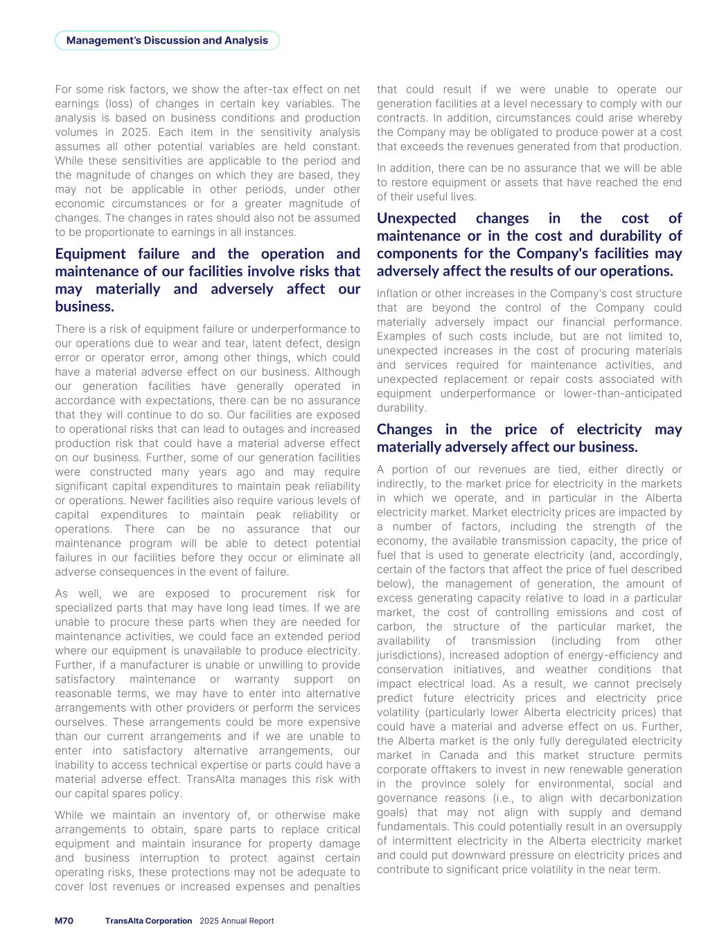 For some risk factors, we show the after-tax effect on net earnings (loss) of changes in certain key variables. The analysis is based on business conditions and production volumes in 2025. Each item in the sensitivity analysis assumes all other potential variables are held constant. While these sensitivities are applicable to the period and the magnitude of changes on which they are based, they may not be applicable in other periods, under other economic circumstances or for a greater magnitude of changes. The changes in rates should also not be assumed to be proportionate to earnings in all instances. Equipment failure and the operation and maintenance of our facilities involve risks that may materially and adversely affect our business. There is a risk of equipment failure or underperformance to our operations due to wear and tear, latent defect, design error or operator error, among other things, which could have a material adverse effect on our business. Although our generation facilities have generally operated in accordance with expectations, there can be no assurance that they will continue to do so. Our facilities are exposed to operational risks that can lead to outages and increased production risk that could have a material adverse effect on our business. Further, some of our generation facilities were constructed many years ago and may require significant capital expenditures to maintain peak reliability or operations. Newer facilities also require various levels of capital expenditures to maintain peak reliability or operations. There can be no assurance that our maintenance program will be able to detect potential failures in our facilities before they occur or eliminate all adverse consequences in the event of failure. As well, we are exposed to procurement risk for specialized parts that may have long lead times. If we are unable to procure these parts when they are needed for maintenance activities, we could face an extended period where our equipment is unavailable to produce electricity. Further, if a manufacturer is unable or unwilling to provide satisfactory maintenance or warranty support on reasonable terms, we may have to enter into alternative arrangements with other providers or perform the services ourselves. These arrangements could be more expensive than our current arrangements and if we are unable to enter into satisfactory alternative arrangements, our inability to access technical expertise or parts could have a material adverse effect. TransAlta manages this risk with our capital spares policy. While we maintain an inventory of, or otherwise make arrangements to obtain, spare parts to replace critical equipment and maintain insurance for property damage and business interruption to protect against certain operating risks, these protections may not be adequate to cover lost revenues or increased expenses and penalties that could result if we were unable to operate our generation facilities at a level necessary to comply with our contracts. In addition, circumstances could arise whereby the Company may be obligated to produce power at a cost that exceeds the revenues generated from that production. In addition, there can be no assurance that we will be able to restore equipment or assets that have reached the end of their useful lives. Unexpected changes in the cost of maintenance or in the cost and durability of components for the Company's facilities may adversely affect the results of our operations. Inflation or other increases in the Company's cost structure that are beyond the control of the Company could materially adversely impact our financial performance. Examples of such costs include, but are not limited to, unexpected increases in the cost of procuring materials and services required for maintenance activities, and unexpected replacement or repair costs associated with equipment underperformance or lower-than-anticipated durability. Changes in the price of electricity may materially adversely affect our business. A portion of our revenues are tied, either directly or indirectly, to the market price for electricity in the markets in which we operate, and in particular in the Alberta electricity market. Market electricity prices are impacted by a number of factors, including the strength of the economy, the available transmission capacity, the price of fuel that is used to generate electricity (and, accordingly, certain of the factors that affect the price of fuel described below), the management of generation, the amount of excess generating capacity relative to load in a particular market, the cost of controlling emissions and cost of carbon, the structure of the particular market, the availability of transmission (including from other jurisdictions), increased adoption of energy-efficiency and conservation initiatives, and weather conditions that impact electrical load. As a result, we cannot precisely predict future electricity prices and electricity price volatility (particularly lower Alberta electricity prices) that could have a material and adverse effect on us. Further, the Alberta market is the only fully deregulated electricity market in Canada and this market structure permits corporate offtakers to invest in new renewable generation in the province solely for environmental, social and governance reasons (i.e., to align with decarbonization goals) that may not align with supply and demand fundamentals. This could potentially result in an oversupply of intermittent electricity in the Alberta electricity market and could put downward pressure on electricity prices and contribute to significant price volatility in the near term. M70 TransAlta Corporation 2025 Annual Report