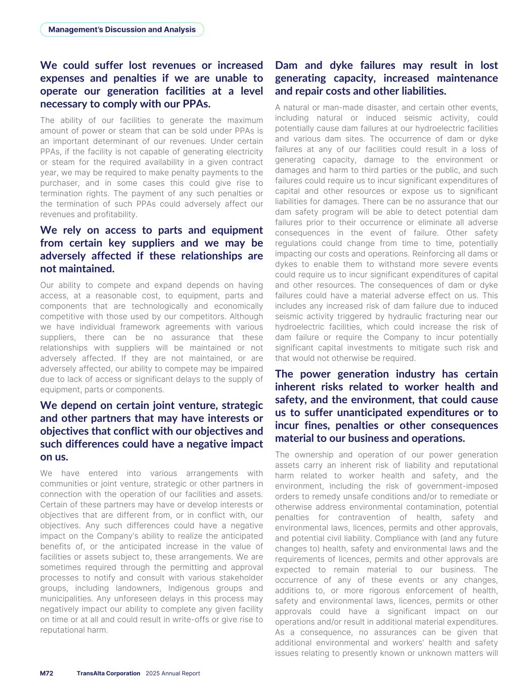 We could suffer lost revenues or increased expenses and penalties if we are unable to operate our generation facilities at a level necessary to comply with our PPAs. The ability of our facilities to generate the maximum amount of power or steam that can be sold under PPAs is an important determinant of our revenues. Under certain PPAs, if the facility is not capable of generating electricity or steam for the required availability in a given contract year, we may be required to make penalty payments to the purchaser, and in some cases this could give rise to termination rights. The payment of any such penalties or the termination of such PPAs could adversely affect our revenues and profitability. We rely on access to parts and equipment from certain key suppliers and we may be adversely affected if these relationships are not maintained. Our ability to compete and expand depends on having access, at a reasonable cost, to equipment, parts and components that are technologically and economically competitive with those used by our competitors. Although we have individual framework agreements with various suppliers, there can be no assurance that these relationships with suppliers will be maintained or not adversely affected. If they are not maintained, or are adversely affected, our ability to compete may be impaired due to lack of access or significant delays to the supply of equipment, parts or components. We depend on certain joint venture, strategic and other partners that may have interests or objectives that conflict with our objectives and such differences could have a negative impact on us. We have entered into various arrangements with communities or joint venture, strategic or other partners in connection with the operation of our facilities and assets. Certain of these partners may have or develop interests or objectives that are different from, or in conflict with, our objectives. Any such differences could have a negative impact on the Company's ability to realize the anticipated benefits of, or the anticipated increase in the value of facilities or assets subject to, these arrangements. We are sometimes required through the permitting and approval processes to notify and consult with various stakeholder groups, including landowners, Indigenous groups and municipalities. Any unforeseen delays in this process may negatively impact our ability to complete any given facility on time or at all and could result in write-offs or give rise to reputational harm. Dam and dyke failures may result in lost generating capacity, increased maintenance and repair costs and other liabilities. A natural or man-made disaster, and certain other events, including natural or induced seismic activity, could potentially cause dam failures at our hydroelectric facilities and various dam sites. The occurrence of dam or dyke failures at any of our facilities could result in a loss of generating capacity, damage to the environment or damages and harm to third parties or the public, and such failures could require us to incur significant expenditures of capital and other resources or expose us to significant liabilities for damages. There can be no assurance that our dam safety program will be able to detect potential dam failures prior to their occurrence or eliminate all adverse consequences in the event of failure. Other safety regulations could change from time to time, potentially impacting our costs and operations. Reinforcing all dams or dykes to enable them to withstand more severe events could require us to incur significant expenditures of capital and other resources. The consequences of dam or dyke failures could have a material adverse effect on us. This includes any increased risk of dam failure due to induced seismic activity triggered by hydraulic fracturing near our hydroelectric facilities, which could increase the risk of dam failure or require the Company to incur potentially significant capital investments to mitigate such risk and that would not otherwise be required. The power generation industry has certain inherent risks related to worker health and safety, and the environment, that could cause us to suffer unanticipated expenditures or to incur fines, penalties or other consequences material to our business and operations. The ownership and operation of our power generation assets carry an inherent risk of liability and reputational harm related to worker health and safety, and the environment, including the risk of government-imposed orders to remedy unsafe conditions and/or to remediate or otherwise address environmental contamination, potential penalties for contravention of health, safety and environmental laws, licences, permits and other approvals, and potential civil liability. Compliance with (and any future changes to) health, safety and environmental laws and the requirements of licences, permits and other approvals are expected to remain material to our business. The occurrence of any of these events or any changes, additions to, or more rigorous enforcement of health, safety and environmental laws, licences, permits or other approvals could have a significant impact on our operations and/or result in additional material expenditures. As a consequence, no assurances can be given that additional environmental and workers' health and safety issues relating to presently known or unknown matters will M72 TransAlta Corporation 2025 Annual Report