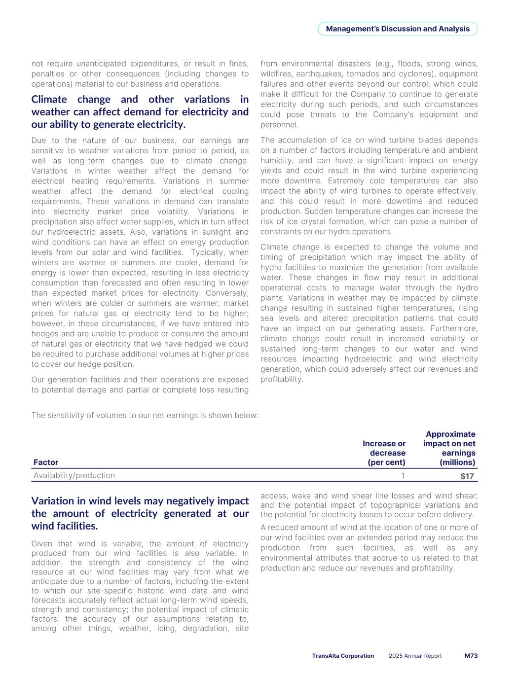 not require unanticipated expenditures, or result in fines, penalties or other consequences (including changes to operations) material to our business and operations. Climate change and other variations in weather can affect demand for electricity and our ability to generate electricity. Due to the nature of our business, our earnings are sensitive to weather variations from period to period, as well as long-term changes due to climate change. Variations in winter weather affect the demand for electrical heating requirements. Variations in summer weather affect the demand for electrical cooling requirements. These variations in demand can translate into electricity market price volatility. Variations in precipitation also affect water supplies, which in turn affect our hydroelectric assets. Also, variations in sunlight and wind conditions can have an effect on energy production levels from our solar and wind facilities. Typically, when winters are warmer or summers are cooler, demand for energy is lower than expected, resulting in less electricity consumption than forecasted and often resulting in lower than expected market prices for electricity. Conversely, when winters are colder or summers are warmer, market prices for natural gas or electricity tend to be higher; however, in these circumstances, if we have entered into hedges and are unable to produce or consume the amount of natural gas or electricity that we have hedged we could be required to purchase additional volumes at higher prices to cover our hedge position. Our generation facilities and their operations are exposed to potential damage and partial or complete loss resulting from environmental disasters (e.g., floods, strong winds, wildfires, earthquakes, tornados and cyclones), equipment failures and other events beyond our control, which could make it difficult for the Company to continue to generate electricity during such periods, and such circumstances could pose threats to the Company's equipment and personnel. The accumulation of ice on wind turbine blades depends on a number of factors including temperature and ambient humidity, and can have a significant impact on energy yields and could result in the wind turbine experiencing more downtime. Extremely cold temperatures can also impact the ability of wind turbines to operate effectively, and this could result in more downtime and reduced production. Sudden temperature changes can increase the risk of ice crystal formation, which can pose a number of constraints on our hydro operations. Climate change is expected to change the volume and timing of precipitation which may impact the ability of hydro facilities to maximize the generation from available water. These changes in flow may result in additional operational costs to manage water through the hydro plants. Variations in weather may be impacted by climate change resulting in sustained higher temperatures, rising sea levels and altered precipitation patterns that could have an impact on our generating assets. Furthermore, climate change could result in increased variability or sustained long-term changes to our water and wind resources impacting hydroelectric and wind electricity generation, which could adversely affect our revenues and profitability. The sensitivity of volumes to our net earnings is shown below: Factor Increase or decrease (per cent) Approximate impact on net earnings (millions) Availability/production 1 $17 Variation in wind levels may negatively impact the amount of electricity generated at our wind facilities. Given that wind is variable, the amount of electricity produced from our wind facilities is also variable. In addition, the strength and consistency of the wind resource at our wind facilities may vary from what we anticipate due to a number of factors, including the extent to which our site-specific historic wind data and wind forecasts accurately reflect actual long-term wind speeds, strength and consistency; the potential impact of climatic factors; the accuracy of our assumptions relating to, among other things, weather, icing, degradation, site access, wake and wind shear line losses and wind shear; and the potential impact of topographical variations and the potential for electricity losses to occur before delivery. A reduced amount of wind at the location of one or more of our wind facilities over an extended period may reduce the production from such facilities, as well as any environmental attributes that accrue to us related to that production and reduce our revenues and profitability. TransAlta Corporation 2025 Annual Report M73
