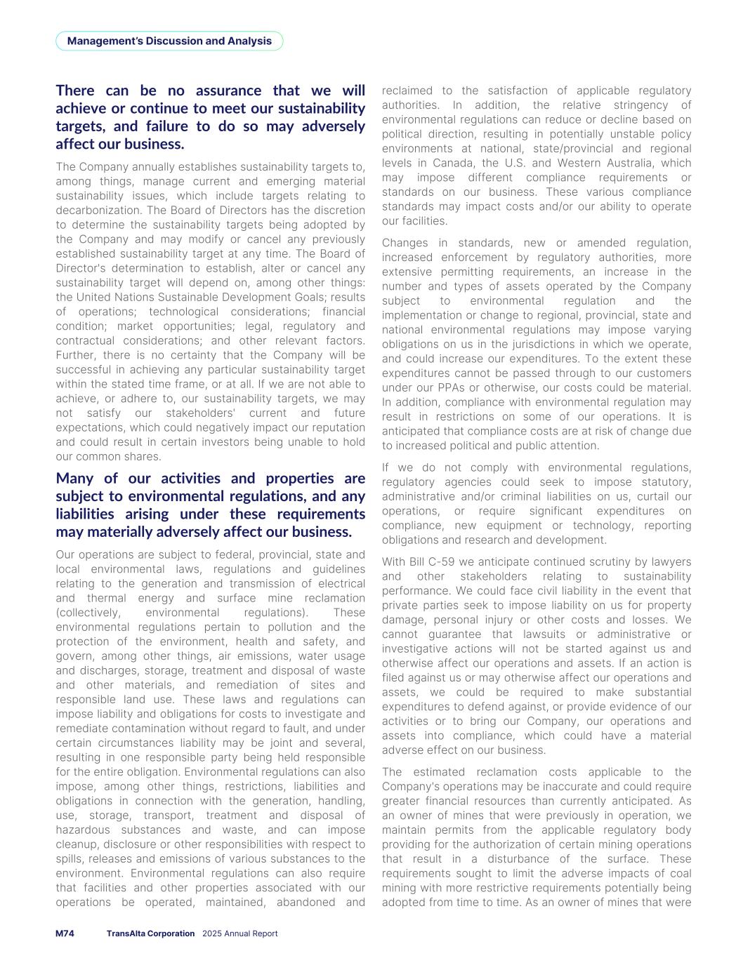 There can be no assurance that we will achieve or continue to meet our sustainability targets, and failure to do so may adversely affect our business. The Company annually establishes sustainability targets to, among things, manage current and emerging material sustainability issues, which include targets relating to decarbonization. The Board of Directors has the discretion to determine the sustainability targets being adopted by the Company and may modify or cancel any previously established sustainability target at any time. The Board of Director's determination to establish, alter or cancel any sustainability target will depend on, among other things: the United Nations Sustainable Development Goals; results of operations; technological considerations; financial condition; market opportunities; legal, regulatory and contractual considerations; and other relevant factors. Further, there is no certainty that the Company will be successful in achieving any particular sustainability target within the stated time frame, or at all. If we are not able to achieve, or adhere to, our sustainability targets, we may not satisfy our stakeholders' current and future expectations, which could negatively impact our reputation and could result in certain investors being unable to hold our common shares. Many of our activities and properties are subject to environmental regulations, and any liabilities arising under these requirements may materially adversely affect our business. Our operations are subject to federal, provincial, state and local environmental laws, regulations and guidelines relating to the generation and transmission of electrical and thermal energy and surface mine reclamation (collectively, environmental regulations). These environmental regulations pertain to pollution and the protection of the environment, health and safety, and govern, among other things, air emissions, water usage and discharges, storage, treatment and disposal of waste and other materials, and remediation of sites and responsible land use. These laws and regulations can impose liability and obligations for costs to investigate and remediate contamination without regard to fault, and under certain circumstances liability may be joint and several, resulting in one responsible party being held responsible for the entire obligation. Environmental regulations can also impose, among other things, restrictions, liabilities and obligations in connection with the generation, handling, use, storage, transport, treatment and disposal of hazardous substances and waste, and can impose cleanup, disclosure or other responsibilities with respect to spills, releases and emissions of various substances to the environment. Environmental regulations can also require that facilities and other properties associated with our operations be operated, maintained, abandoned and reclaimed to the satisfaction of applicable regulatory authorities. In addition, the relative stringency of environmental regulations can reduce or decline based on political direction, resulting in potentially unstable policy environments at national, state/provincial and regional levels in Canada, the U.S. and Western Australia, which may impose different compliance requirements or standards on our business. These various compliance standards may impact costs and/or our ability to operate our facilities. Changes in standards, new or amended regulation, increased enforcement by regulatory authorities, more extensive permitting requirements, an increase in the number and types of assets operated by the Company subject to environmental regulation and the implementation or change to regional, provincial, state and national environmental regulations may impose varying obligations on us in the jurisdictions in which we operate, and could increase our expenditures. To the extent these expenditures cannot be passed through to our customers under our PPAs or otherwise, our costs could be material. In addition, compliance with environmental regulation may result in restrictions on some of our operations. It is anticipated that compliance costs are at risk of change due to increased political and public attention. If we do not comply with environmental regulations, regulatory agencies could seek to impose statutory, administrative and/or criminal liabilities on us, curtail our operations, or require significant expenditures on compliance, new equipment or technology, reporting obligations and research and development. With Bill C-59 we anticipate continued scrutiny by lawyers and other stakeholders relating to sustainability performance. We could face civil liability in the event that private parties seek to impose liability on us for property damage, personal injury or other costs and losses. We cannot guarantee that lawsuits or administrative or investigative actions will not be started against us and otherwise affect our operations and assets. If an action is filed against us or may otherwise affect our operations and assets, we could be required to make substantial expenditures to defend against, or provide evidence of our activities or to bring our Company, our operations and assets into compliance, which could have a material adverse effect on our business. The estimated reclamation costs applicable to the Company's operations may be inaccurate and could require greater financial resources than currently anticipated. As an owner of mines that were previously in operation, we maintain permits from the applicable regulatory body providing for the authorization of certain mining operations that result in a disturbance of the surface. These requirements sought to limit the adverse impacts of coal mining with more restrictive requirements potentially being adopted from time to time. As an owner of mines that were M74 TransAlta Corporation 2025 Annual Report