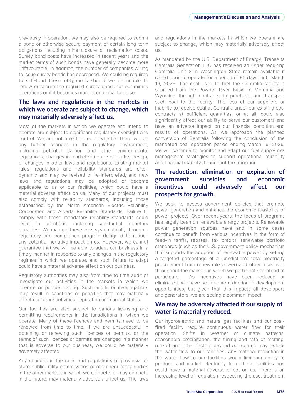 previously in operation, we may also be required to submit a bond or otherwise secure payment of certain long-term obligations including mine closure or reclamation costs. Surety bond costs have increased in recent years and the market terms of such bonds have generally become more unfavourable. In addition, the number of companies willing to issue surety bonds has decreased. We could be required to self-fund these obligations should we be unable to renew or secure the required surety bonds for our mining operations or if it becomes more economical to do so. The laws and regulations in the markets in which we operate are subject to change, which may materially adversely affect us. Most of the markets in which we operate and intend to operate are subject to significant regulatory oversight and control. We are not able to predict whether there will be any further changes in the regulatory environment, including potential carbon and other environmental regulations, changes in market structure or market design, or changes in other laws and regulations. Existing market rules, regulations and reliability standards are often dynamic and may be revised or re-interpreted, and new laws and regulations may be adopted or become applicable to us or our facilities, which could have a material adverse effect on us. Many of our projects must also comply with reliability standards, including those established by the North American Electric Reliability Corporation and Alberta Reliability Standards. Failure to comply with these mandatory reliability standards could result in sanctions, including substantial monetary penalties. We manage these risks systematically through a regulatory and compliance program designed to reduce any potential negative impact on us. However, we cannot guarantee that we will be able to adapt our business in a timely manner in response to any changes in the regulatory regimes in which we operate, and such failure to adapt could have a material adverse effect on our business. Regulatory authorities may also from time to time audit or investigate our activities in the markets in which we operate or pursue trading. Such audits or investigations may result in sanctions or penalties that may materially affect our future activities, reputation or financial status. Our facilities are also subject to various licensing and permitting requirements in the jurisdictions in which we operate. Many of these licences and permits need to be renewed from time to time. If we are unsuccessful in obtaining or renewing such licences or permits, or the terms of such licences or permits are changed in a manner that is adverse to our business, we could be materially adversely affected. Any changes in the rules and regulations of provincial or state public utility commissions or other regulatory bodies in the other markets in which we compete, or may compete in the future, may materially adversely affect us. The laws and regulations in the markets in which we operate are subject to change, which may materially adversely affect us. As mandated by the U.S. Department of Energy, TransAlta Centralia Generation LLC has received an Order requiring Centralia Unit 2 in Washington State remain available if called upon to operate for a period of 90 days, until March 16, 2026. The coal used to fuel the Centralia facility is sourced from the Powder River Basin in Montana and Wyoming through contracts to purchase and transport such coal to the facility. The loss of our suppliers or inability to receive coal at Centralia under our existing coal contracts at sufficient quantities, or at all, could also significantly affect our ability to serve our customers and have an adverse impact on our financial condition and results of operations. As we approach the planned conversion of Centralia following the conclusion of the mandated coal operation period ending March 16, 2026, we will continue to monitor and adapt our fuel supply risk management strategies to support operational reliability and financial stability throughout the transition. The reduction, elimination or expiration of government subsidies and economic incentives could adversely affect our prospects for growth. We seek to access government policies that promote power generation and enhance the economic feasibility of power projects. Over recent years, the focus of programs has largely been on renewable energy projects. Renewable power generation sources have and in some cases continue to benefit from various incentives in the form of feed-in tariffs, rebates, tax credits, renewable portfolio standards (such as the U.S. government policy mechanism that supports the adoption of renewable power by setting a targeted percentage of a jurisdiction's total electricity procurement from renewable power) and other incentives throughout the markets in which we participate or intend to participate. As incentives have been reduced or eliminated, we have seen some reduction in development opportunities, but given that this impacts all developers and generators, we are seeing a common impact. We may be adversely affected if our supply of water is materially reduced. Our hydroelectric and natural gas facilities and our coal- fired facility require continuous water flow for their operation. Shifts in weather or climate patterns, seasonable precipitation, the timing and rate of melting, run-off and other factors beyond our control may reduce the water flow to our facilities. Any material reduction in the water flow to our facilities would limit our ability to produce and market electricity from these facilities and could have a material adverse effect on us. There is an increasing level of regulation respecting the use, treatment TransAlta Corporation 2025 Annual Report M75