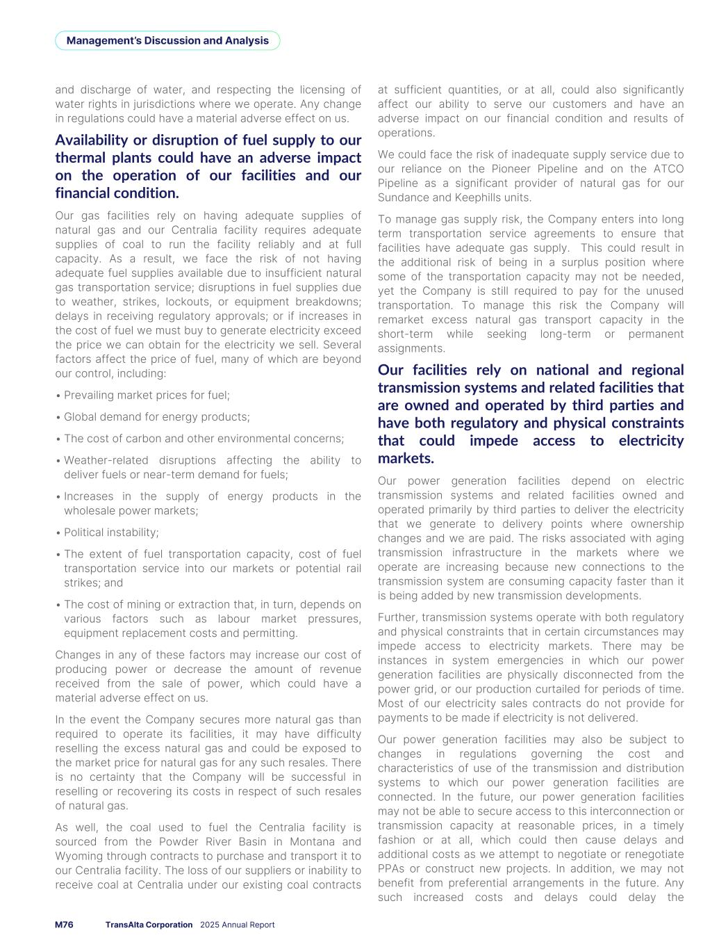 and discharge of water, and respecting the licensing of water rights in jurisdictions where we operate. Any change in regulations could have a material adverse effect on us. Availability or disruption of fuel supply to our thermal plants could have an adverse impact on the operation of our facilities and our financial condition. Our gas facilities rely on having adequate supplies of natural gas and our Centralia facility requires adequate supplies of coal to run the facility reliably and at full capacity. As a result, we face the risk of not having adequate fuel supplies available due to insufficient natural gas transportation service; disruptions in fuel supplies due to weather, strikes, lockouts, or equipment breakdowns; delays in receiving regulatory approvals; or if increases in the cost of fuel we must buy to generate electricity exceed the price we can obtain for the electricity we sell. Several factors affect the price of fuel, many of which are beyond our control, including: • Prevailing market prices for fuel; • Global demand for energy products; • The cost of carbon and other environmental concerns; • Weather-related disruptions affecting the ability to deliver fuels or near-term demand for fuels; • Increases in the supply of energy products in the wholesale power markets; • Political instability; • The extent of fuel transportation capacity, cost of fuel transportation service into our markets or potential rail strikes; and • The cost of mining or extraction that, in turn, depends on various factors such as labour market pressures, equipment replacement costs and permitting. Changes in any of these factors may increase our cost of producing power or decrease the amount of revenue received from the sale of power, which could have a material adverse effect on us. In the event the Company secures more natural gas than required to operate its facilities, it may have difficulty reselling the excess natural gas and could be exposed to the market price for natural gas for any such resales. There is no certainty that the Company will be successful in reselling or recovering its costs in respect of such resales of natural gas. As well, the coal used to fuel the Centralia facility is sourced from the Powder River Basin in Montana and Wyoming through contracts to purchase and transport it to our Centralia facility. The loss of our suppliers or inability to receive coal at Centralia under our existing coal contracts at sufficient quantities, or at all, could also significantly affect our ability to serve our customers and have an adverse impact on our financial condition and results of operations. We could face the risk of inadequate supply service due to our reliance on the Pioneer Pipeline and on the ATCO Pipeline as a significant provider of natural gas for our Sundance and Keephills units. To manage gas supply risk, the Company enters into long term transportation service agreements to ensure that facilities have adequate gas supply. This could result in the additional risk of being in a surplus position where some of the transportation capacity may not be needed, yet the Company is still required to pay for the unused transportation. To manage this risk the Company will remarket excess natural gas transport capacity in the short-term while seeking long-term or permanent assignments. Our facilities rely on national and regional transmission systems and related facilities that are owned and operated by third parties and have both regulatory and physical constraints that could impede access to electricity markets. Our power generation facilities depend on electric transmission systems and related facilities owned and operated primarily by third parties to deliver the electricity that we generate to delivery points where ownership changes and we are paid. The risks associated with aging transmission infrastructure in the markets where we operate are increasing because new connections to the transmission system are consuming capacity faster than it is being added by new transmission developments. Further, transmission systems operate with both regulatory and physical constraints that in certain circumstances may impede access to electricity markets. There may be instances in system emergencies in which our power generation facilities are physically disconnected from the power grid, or our production curtailed for periods of time. Most of our electricity sales contracts do not provide for payments to be made if electricity is not delivered. Our power generation facilities may also be subject to changes in regulations governing the cost and characteristics of use of the transmission and distribution systems to which our power generation facilities are connected. In the future, our power generation facilities may not be able to secure access to this interconnection or transmission capacity at reasonable prices, in a timely fashion or at all, which could then cause delays and additional costs as we attempt to negotiate or renegotiate PPAs or construct new projects. In addition, we may not benefit from preferential arrangements in the future. Any such increased costs and delays could delay the M76 TransAlta Corporation 2025 Annual Report
