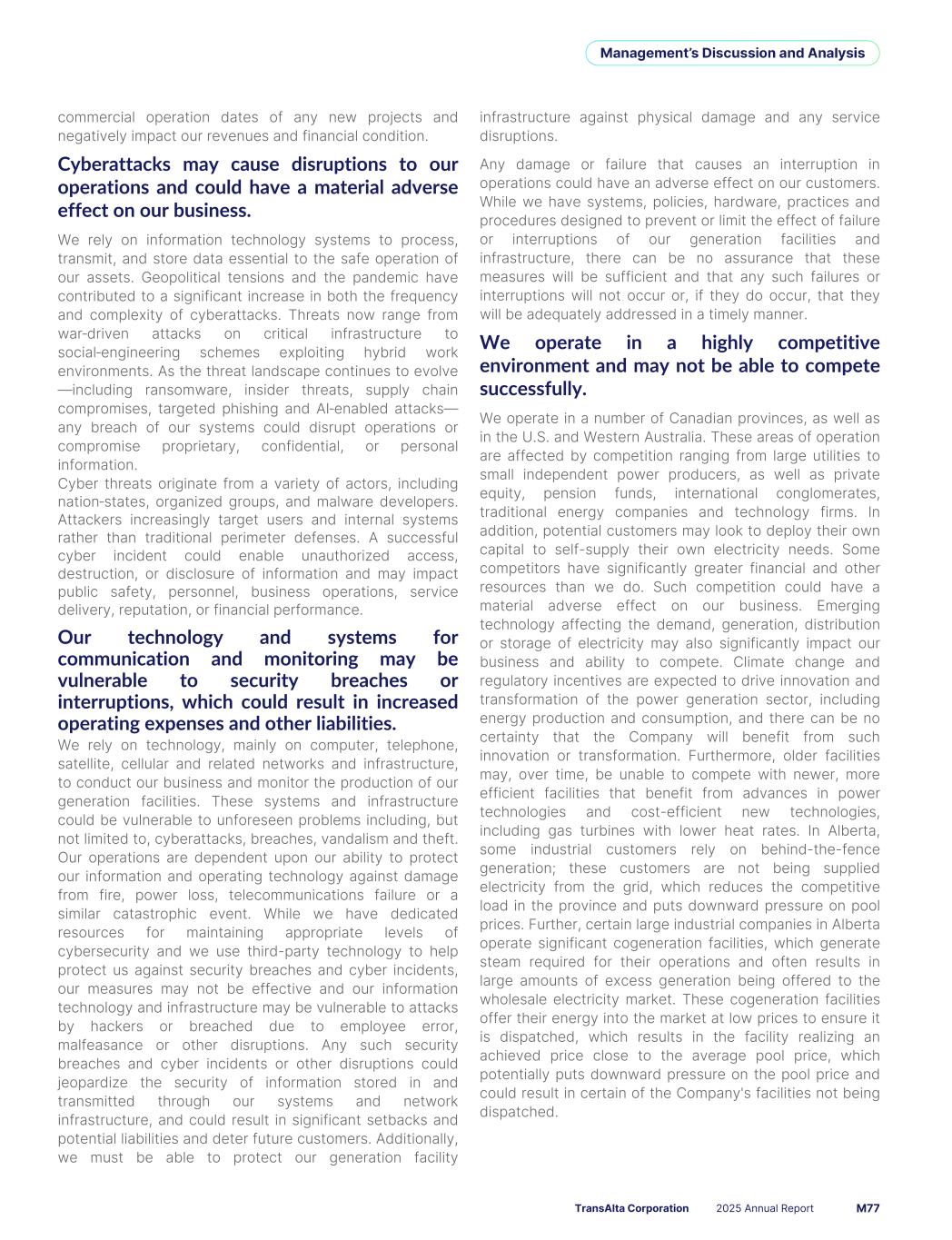 commercial operation dates of any new projects and negatively impact our revenues and financial condition. Cyberattacks may cause disruptions to our operations and could have a material adverse effect on our business. We rely on information technology systems to process, transmit, and store data essential to the safe operation of our assets. Geopolitical tensions and the pandemic have contributed to a significant increase in both the frequency and complexity of cyberattacks. Threats now range from war‑driven attacks on critical infrastructure to social‑engineering schemes exploiting hybrid work environments. As the threat landscape continues to evolve —including ransomware, insider threats, supply chain compromises, targeted phishing and AI‑enabled attacks— any breach of our systems could disrupt operations or compromise proprietary, confidential, or personal information. Cyber threats originate from a variety of actors, including nation‑states, organized groups, and malware developers. Attackers increasingly target users and internal systems rather than traditional perimeter defenses. A successful cyber incident could enable unauthorized access, destruction, or disclosure of information and may impact public safety, personnel, business operations, service delivery, reputation, or financial performance. Our technology and systems for communication and monitoring may be vulnerable to security breaches or interruptions, which could result in increased operating expenses and other liabilities. We rely on technology, mainly on computer, telephone, satellite, cellular and related networks and infrastructure, to conduct our business and monitor the production of our generation facilities. These systems and infrastructure could be vulnerable to unforeseen problems including, but not limited to, cyberattacks, breaches, vandalism and theft. Our operations are dependent upon our ability to protect our information and operating technology against damage from fire, power loss, telecommunications failure or a similar catastrophic event. While we have dedicated resources for maintaining appropriate levels of cybersecurity and we use third-party technology to help protect us against security breaches and cyber incidents, our measures may not be effective and our information technology and infrastructure may be vulnerable to attacks by hackers or breached due to employee error, malfeasance or other disruptions. Any such security breaches and cyber incidents or other disruptions could jeopardize the security of information stored in and transmitted through our systems and network infrastructure, and could result in significant setbacks and potential liabilities and deter future customers. Additionally, we must be able to protect our generation facility infrastructure against physical damage and any service disruptions. Any damage or failure that causes an interruption in operations could have an adverse effect on our customers. While we have systems, policies, hardware, practices and procedures designed to prevent or limit the effect of failure or interruptions of our generation facilities and infrastructure, there can be no assurance that these measures will be sufficient and that any such failures or interruptions will not occur or, if they do occur, that they will be adequately addressed in a timely manner. We operate in a highly competitive environment and may not be able to compete successfully. We operate in a number of Canadian provinces, as well as in the U.S. and Western Australia. These areas of operation are affected by competition ranging from large utilities to small independent power producers, as well as private equity, pension funds, international conglomerates, traditional energy companies and technology firms. In addition, potential customers may look to deploy their own capital to self-supply their own electricity needs. Some competitors have significantly greater financial and other resources than we do. Such competition could have a material adverse effect on our business. Emerging technology affecting the demand, generation, distribution or storage of electricity may also significantly impact our business and ability to compete. Climate change and regulatory incentives are expected to drive innovation and transformation of the power generation sector, including energy production and consumption, and there can be no certainty that the Company will benefit from such innovation or transformation. Furthermore, older facilities may, over time, be unable to compete with newer, more efficient facilities that benefit from advances in power technologies and cost-efficient new technologies, including gas turbines with lower heat rates. In Alberta, some industrial customers rely on behind-the-fence generation; these customers are not being supplied electricity from the grid, which reduces the competitive load in the province and puts downward pressure on pool prices. Further, certain large industrial companies in Alberta operate significant cogeneration facilities, which generate steam required for their operations and often results in large amounts of excess generation being offered to the wholesale electricity market. These cogeneration facilities offer their energy into the market at low prices to ensure it is dispatched, which results in the facility realizing an achieved price close to the average pool price, which potentially puts downward pressure on the pool price and could result in certain of the Company's facilities not being dispatched. TransAlta Corporation 2025 Annual Report M77