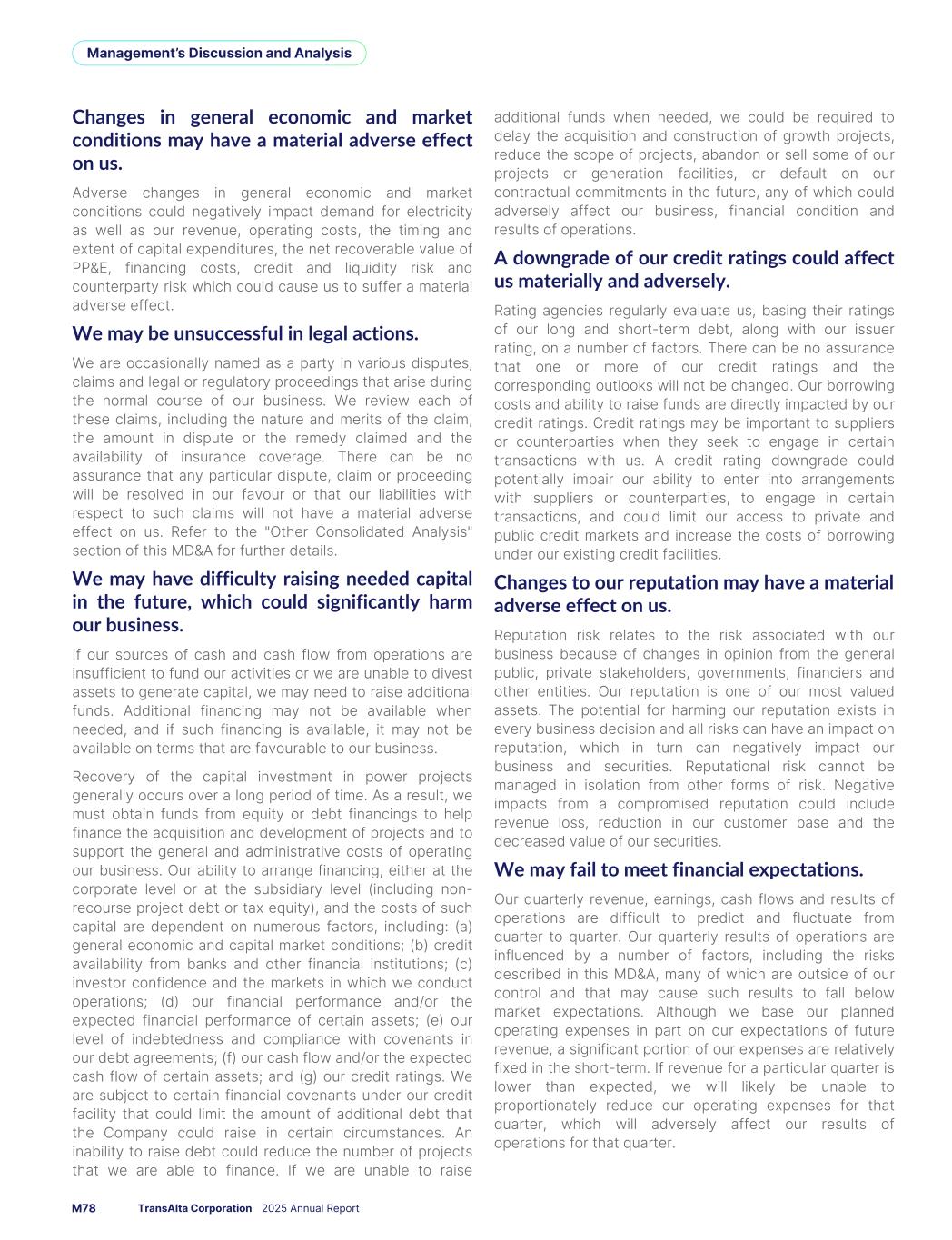 Changes in general economic and market conditions may have a material adverse effect on us. Adverse changes in general economic and market conditions could negatively impact demand for electricity as well as our revenue, operating costs, the timing and extent of capital expenditures, the net recoverable value of PP&E, financing costs, credit and liquidity risk and counterparty risk which could cause us to suffer a material adverse effect. We may be unsuccessful in legal actions. We are occasionally named as a party in various disputes, claims and legal or regulatory proceedings that arise during the normal course of our business. We review each of these claims, including the nature and merits of the claim, the amount in dispute or the remedy claimed and the availability of insurance coverage. There can be no assurance that any particular dispute, claim or proceeding will be resolved in our favour or that our liabilities with respect to such claims will not have a material adverse effect on us. Refer to the "Other Consolidated Analysis" section of this MD&A for further details. We may have difficulty raising needed capital in the future, which could significantly harm our business. If our sources of cash and cash flow from operations are insufficient to fund our activities or we are unable to divest assets to generate capital, we may need to raise additional funds. Additional financing may not be available when needed, and if such financing is available, it may not be available on terms that are favourable to our business. Recovery of the capital investment in power projects generally occurs over a long period of time. As a result, we must obtain funds from equity or debt financings to help finance the acquisition and development of projects and to support the general and administrative costs of operating our business. Our ability to arrange financing, either at the corporate level or at the subsidiary level (including non- recourse project debt or tax equity), and the costs of such capital are dependent on numerous factors, including: (a) general economic and capital market conditions; (b) credit availability from banks and other financial institutions; (c) investor confidence and the markets in which we conduct operations; (d) our financial performance and/or the expected financial performance of certain assets; (e) our level of indebtedness and compliance with covenants in our debt agreements; (f) our cash flow and/or the expected cash flow of certain assets; and (g) our credit ratings. We are subject to certain financial covenants under our credit facility that could limit the amount of additional debt that the Company could raise in certain circumstances. An inability to raise debt could reduce the number of projects that we are able to finance. If we are unable to raise additional funds when needed, we could be required to delay the acquisition and construction of growth projects, reduce the scope of projects, abandon or sell some of our projects or generation facilities, or default on our contractual commitments in the future, any of which could adversely affect our business, financial condition and results of operations. A downgrade of our credit ratings could affect us materially and adversely. Rating agencies regularly evaluate us, basing their ratings of our long and short-term debt, along with our issuer rating, on a number of factors. There can be no assurance that one or more of our credit ratings and the corresponding outlooks will not be changed. Our borrowing costs and ability to raise funds are directly impacted by our credit ratings. Credit ratings may be important to suppliers or counterparties when they seek to engage in certain transactions with us. A credit rating downgrade could potentially impair our ability to enter into arrangements with suppliers or counterparties, to engage in certain transactions, and could limit our access to private and public credit markets and increase the costs of borrowing under our existing credit facilities. Changes to our reputation may have a material adverse effect on us. Reputation risk relates to the risk associated with our business because of changes in opinion from the general public, private stakeholders, governments, financiers and other entities. Our reputation is one of our most valued assets. The potential for harming our reputation exists in every business decision and all risks can have an impact on reputation, which in turn can negatively impact our business and securities. Reputational risk cannot be managed in isolation from other forms of risk. Negative impacts from a compromised reputation could include revenue loss, reduction in our customer base and the decreased value of our securities. We may fail to meet financial expectations. Our quarterly revenue, earnings, cash flows and results of operations are difficult to predict and fluctuate from quarter to quarter. Our quarterly results of operations are influenced by a number of factors, including the risks described in this MD&A, many of which are outside of our control and that may cause such results to fall below market expectations. Although we base our planned operating expenses in part on our expectations of future revenue, a significant portion of our expenses are relatively fixed in the short-term. If revenue for a particular quarter is lower than expected, we will likely be unable to proportionately reduce our operating expenses for that quarter, which will adversely affect our results of operations for that quarter. M78 TransAlta Corporation 2025 Annual Report