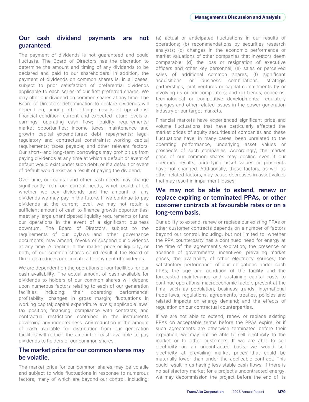 Our cash dividend payments are not guaranteed. The payment of dividends is not guaranteed and could fluctuate. The Board of Directors has the discretion to determine the amount and timing of any dividends to be declared and paid to our shareholders. In addition, the payment of dividends on common shares is, in all cases, subject to prior satisfaction of preferential dividends applicable to each series of our first preferred shares. We may alter our dividend on common shares at any time. The Board of Directors' determination to declare dividends will depend on, among other things: results of operations; financial condition; current and expected future levels of earnings; operating cash flow; liquidity requirements; market opportunities; income taxes; maintenance and growth capital expenditures; debt repayments; legal, regulatory and contractual constraints; working capital requirements; taxes payable; and other relevant factors. Our short- and long-term borrowings may prohibit us from paying dividends at any time at which a default or event of default would exist under such debt, or if a default or event of default would exist as a result of paying the dividend. Over time, our capital and other cash needs may change significantly from our current needs, which could affect whether we pay dividends and the amount of any dividends we may pay in the future. If we continue to pay dividends at the current level, we may not retain a sufficient amount of cash to finance growth opportunities, meet any large unanticipated liquidity requirements or fund our operations in the event of a significant business downturn. The Board of Directors, subject to the requirements of our bylaws and other governance documents, may amend, revoke or suspend our dividends at any time. A decline in the market price or liquidity, or both, of our common shares could result if the Board of Directors reduces or eliminates the payment of dividends. We are dependent on the operations of our facilities for our cash availability. The actual amount of cash available for dividends to holders of our common shares will depend upon numerous factors relating to each of our generation facilities including: their operating performance; profitability; changes in gross margin; fluctuations in working capital; capital expenditure levels; applicable laws; tax position; financing; compliance with contracts; and contractual restrictions contained in the instruments governing any indebtedness. Any reduction in the amount of cash available for distribution from our generation facilities will reduce the amount of cash available to pay dividends to holders of our common shares. The market price for our common shares may be volatile. The market price for our common shares may be volatile and subject to wide fluctuations in response to numerous factors, many of which are beyond our control, including: (a) actual or anticipated fluctuations in our results of operations; (b) recommendations by securities research analysts; (c) changes in the economic performance or market valuations of other companies that investors deem comparable; (d) the loss or resignation of executive officers and other key personnel; (e) sales or perceived sales of additional common shares; (f) significant acquisitions or business combinations, strategic partnerships, joint ventures or capital commitments by or involving us or our competitors; and (g) trends, concerns, technological or competitive developments, regulatory changes and other related issues in the power generation industry or our target markets. Financial markets have experienced significant price and volume fluctuations that have particularly affected the market prices of equity securities of companies and these fluctuations have, in many cases, been unrelated to the operating performance, underlying asset values or prospects of such companies. Accordingly, the market price of our common shares may decline even if our operating results, underlying asset values or prospects have not changed. Additionally, these factors, as well as other related factors, may cause decreases in asset values that may result in impairment losses. We may not be able to extend, renew or replace expiring or terminated PPAs, or other customer contracts at favourable rates or on a long-term basis. Our ability to extend, renew or replace our existing PPAs or other customer contracts depends on a number of factors beyond our control, including, but not limited to: whether the PPA counterparty has a continued need for energy at the time of the agreement’s expiration; the presence or absence of governmental incentives; prevailing market prices; the availability of other electricity sources; the satisfactory performance of our obligations under such PPAs; the age and condition of the facility and the forecasted maintenance and sustaining capital costs to continue operations; macroeconomic factors present at the time, such as population, business trends, international trade laws, regulations, agreements, treaties, policies and related impacts on energy demand; and the effects of regulation on our contractual counterparties. If we are not able to extend, renew or replace existing PPAs on acceptable terms before the PPAs expire, or if such agreements are otherwise terminated before their expiration, we may not be able to sell electricity to the market or to other customers. If we are able to sell electricity on an uncontracted basis, we would sell electricity at prevailing market prices that could be materially lower than under the applicable contract. This could result in us having less stable cash flows. If there is no satisfactory market for a project’s uncontracted energy, we may decommission the project before the end of its TransAlta Corporation 2025 Annual Report M79