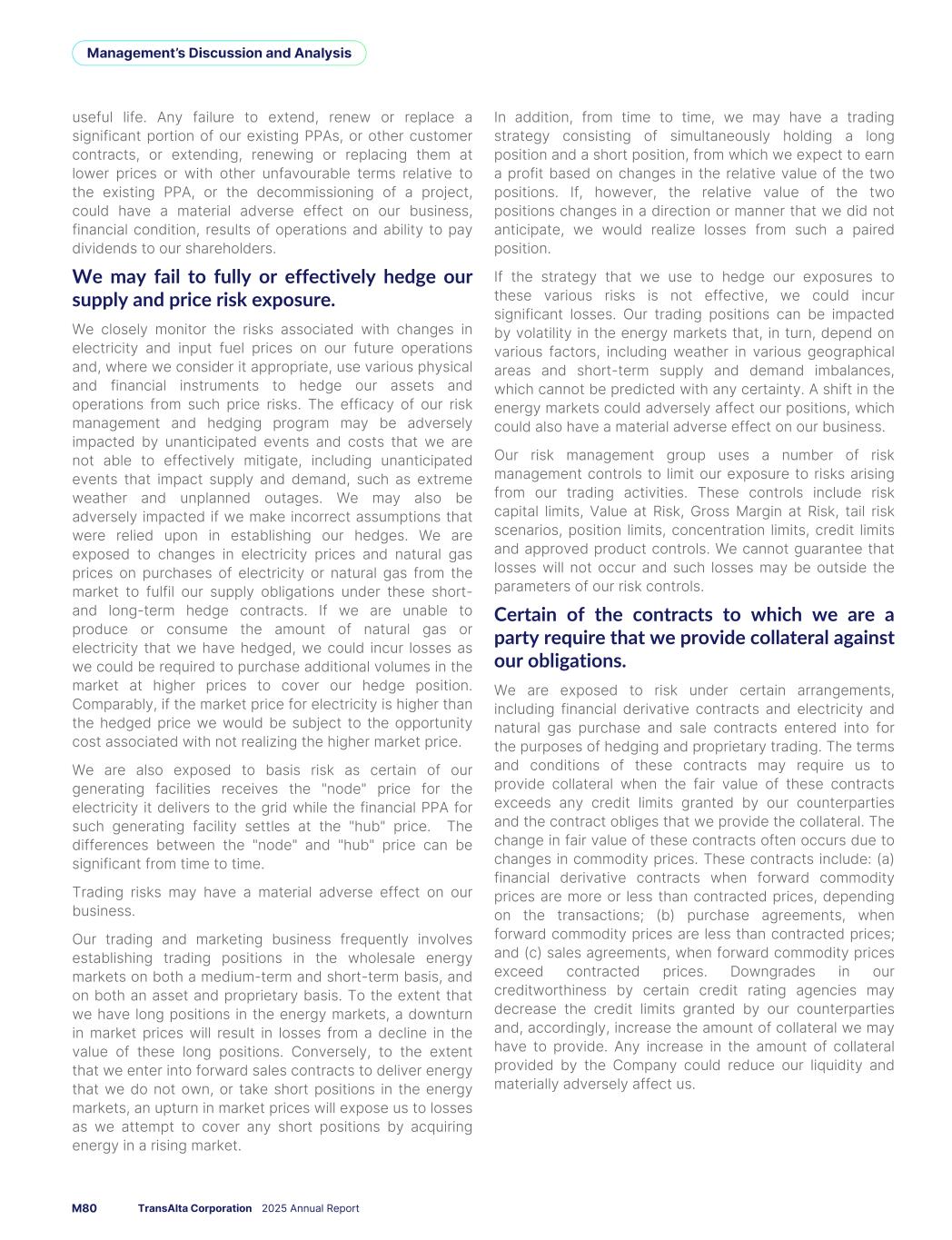 useful life. Any failure to extend, renew or replace a significant portion of our existing PPAs, or other customer contracts, or extending, renewing or replacing them at lower prices or with other unfavourable terms relative to the existing PPA, or the decommissioning of a project, could have a material adverse effect on our business, financial condition, results of operations and ability to pay dividends to our shareholders. We may fail to fully or effectively hedge our supply and price risk exposure. We closely monitor the risks associated with changes in electricity and input fuel prices on our future operations and, where we consider it appropriate, use various physical and financial instruments to hedge our assets and operations from such price risks. The efficacy of our risk management and hedging program may be adversely impacted by unanticipated events and costs that we are not able to effectively mitigate, including unanticipated events that impact supply and demand, such as extreme weather and unplanned outages. We may also be adversely impacted if we make incorrect assumptions that were relied upon in establishing our hedges. We are exposed to changes in electricity prices and natural gas prices on purchases of electricity or natural gas from the market to fulfil our supply obligations under these short- and long-term hedge contracts. If we are unable to produce or consume the amount of natural gas or electricity that we have hedged, we could incur losses as we could be required to purchase additional volumes in the market at higher prices to cover our hedge position. Comparably, if the market price for electricity is higher than the hedged price we would be subject to the opportunity cost associated with not realizing the higher market price. We are also exposed to basis risk as certain of our generating facilities receives the "node" price for the electricity it delivers to the grid while the financial PPA for such generating facility settles at the "hub" price. The differences between the "node" and "hub" price can be significant from time to time. Trading risks may have a material adverse effect on our business. Our trading and marketing business frequently involves establishing trading positions in the wholesale energy markets on both a medium-term and short-term basis, and on both an asset and proprietary basis. To the extent that we have long positions in the energy markets, a downturn in market prices will result in losses from a decline in the value of these long positions. Conversely, to the extent that we enter into forward sales contracts to deliver energy that we do not own, or take short positions in the energy markets, an upturn in market prices will expose us to losses as we attempt to cover any short positions by acquiring energy in a rising market. In addition, from time to time, we may have a trading strategy consisting of simultaneously holding a long position and a short position, from which we expect to earn a profit based on changes in the relative value of the two positions. If, however, the relative value of the two positions changes in a direction or manner that we did not anticipate, we would realize losses from such a paired position. If the strategy that we use to hedge our exposures to these various risks is not effective, we could incur significant losses. Our trading positions can be impacted by volatility in the energy markets that, in turn, depend on various factors, including weather in various geographical areas and short-term supply and demand imbalances, which cannot be predicted with any certainty. A shift in the energy markets could adversely affect our positions, which could also have a material adverse effect on our business. Our risk management group uses a number of risk management controls to limit our exposure to risks arising from our trading activities. These controls include risk capital limits, Value at Risk, Gross Margin at Risk, tail risk scenarios, position limits, concentration limits, credit limits and approved product controls. We cannot guarantee that losses will not occur and such losses may be outside the parameters of our risk controls. Certain of the contracts to which we are a party require that we provide collateral against our obligations. We are exposed to risk under certain arrangements, including financial derivative contracts and electricity and natural gas purchase and sale contracts entered into for the purposes of hedging and proprietary trading. The terms and conditions of these contracts may require us to provide collateral when the fair value of these contracts exceeds any credit limits granted by our counterparties and the contract obliges that we provide the collateral. The change in fair value of these contracts often occurs due to changes in commodity prices. These contracts include: (a) financial derivative contracts when forward commodity prices are more or less than contracted prices, depending on the transactions; (b) purchase agreements, when forward commodity prices are less than contracted prices; and (c) sales agreements, when forward commodity prices exceed contracted prices. Downgrades in our creditworthiness by certain credit rating agencies may decrease the credit limits granted by our counterparties and, accordingly, increase the amount of collateral we may have to provide. Any increase in the amount of collateral provided by the Company could reduce our liquidity and materially adversely affect us. M80 TransAlta Corporation 2025 Annual Report