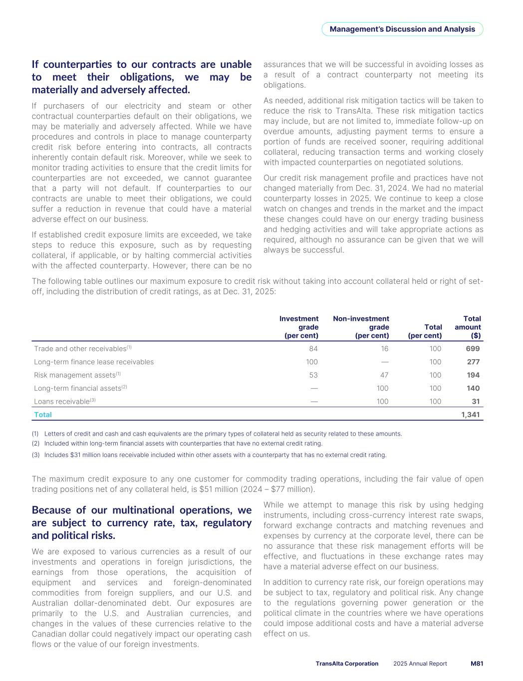 If counterparties to our contracts are unable to meet their obligations, we may be materially and adversely affected. If purchasers of our electricity and steam or other contractual counterparties default on their obligations, we may be materially and adversely affected. While we have procedures and controls in place to manage counterparty credit risk before entering into contracts, all contracts inherently contain default risk. Moreover, while we seek to monitor trading activities to ensure that the credit limits for counterparties are not exceeded, we cannot guarantee that a party will not default. If counterparties to our contracts are unable to meet their obligations, we could suffer a reduction in revenue that could have a material adverse effect on our business. If established credit exposure limits are exceeded, we take steps to reduce this exposure, such as by requesting collateral, if applicable, or by halting commercial activities with the affected counterparty. However, there can be no assurances that we will be successful in avoiding losses as a result of a contract counterparty not meeting its obligations. As needed, additional risk mitigation tactics will be taken to reduce the risk to TransAlta. These risk mitigation tactics may include, but are not limited to, immediate follow-up on overdue amounts, adjusting payment terms to ensure a portion of funds are received sooner, requiring additional collateral, reducing transaction terms and working closely with impacted counterparties on negotiated solutions. Our credit risk management profile and practices have not changed materially from Dec. 31, 2024. We had no material counterparty losses in 2025. We continue to keep a close watch on changes and trends in the market and the impact these changes could have on our energy trading business and hedging activities and will take appropriate actions as required, although no assurance can be given that we will always be successful. The following table outlines our maximum exposure to credit risk without taking into account collateral held or right of set- off, including the distribution of credit ratings, as at Dec. 31, 2025: Investment grade (per cent) Non-investment grade (per cent) Total (per cent) Total amount ($) Trade and other receivables(1) 84 16 100 699 Long-term finance lease receivables 100 — 100 277 Risk management assets(1) 53 47 100 194 Long-term financial assets(2) — 100 100 140 Loans receivable(3) — 100 100 31 Total       1,341 (1) Letters of credit and cash and cash equivalents are the primary types of collateral held as security related to these amounts. (2) Included within long-term financial assets with counterparties that have no external credit rating. (3) Includes $31 million loans receivable included within other assets with a counterparty that has no external credit rating. The maximum credit exposure to any one customer for commodity trading operations, including the fair value of open trading positions net of any collateral held, is $51 million (2024 – $77 million). Because of our multinational operations, we are subject to currency rate, tax, regulatory and political risks. We are exposed to various currencies as a result of our investments and operations in foreign jurisdictions, the earnings from those operations, the acquisition of equipment and services and foreign-denominated commodities from foreign suppliers, and our U.S. and Australian dollar-denominated debt. Our exposures are primarily to the U.S. and Australian currencies, and changes in the values of these currencies relative to the Canadian dollar could negatively impact our operating cash flows or the value of our foreign investments. While we attempt to manage this risk by using hedging instruments, including cross-currency interest rate swaps, forward exchange contracts and matching revenues and expenses by currency at the corporate level, there can be no assurance that these risk management efforts will be effective, and fluctuations in these exchange rates may have a material adverse effect on our business. In addition to currency rate risk, our foreign operations may be subject to tax, regulatory and political risk. Any change to the regulations governing power generation or the political climate in the countries where we have operations could impose additional costs and have a material adverse effect on us. TransAlta Corporation 2025 Annual Report M81