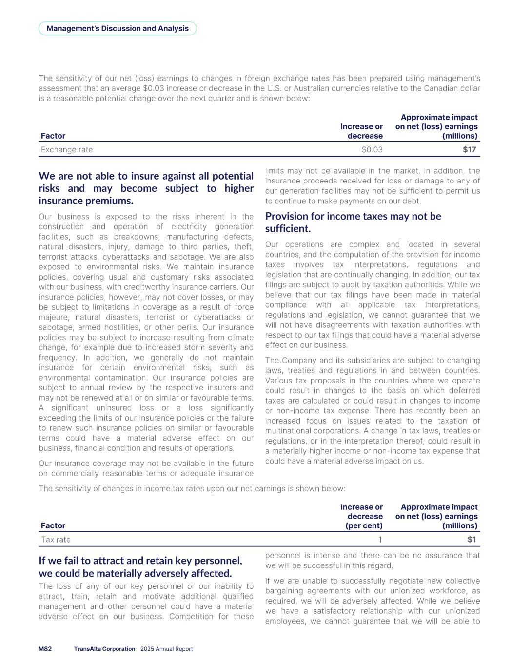 The sensitivity of our net (loss) earnings to changes in foreign exchange rates has been prepared using management’s assessment that an average $0.03 increase or decrease in the U.S. or Australian currencies relative to the Canadian dollar is a reasonable potential change over the next quarter and is shown below: Factor Increase or decrease Approximate impact on net (loss) earnings (millions) Exchange rate $0.03 $17 We are not able to insure against all potential risks and may become subject to higher insurance premiums. Our business is exposed to the risks inherent in the construction and operation of electricity generation facilities, such as breakdowns, manufacturing defects, natural disasters, injury, damage to third parties, theft, terrorist attacks, cyberattacks and sabotage. We are also exposed to environmental risks. We maintain insurance policies, covering usual and customary risks associated with our business, with creditworthy insurance carriers. Our insurance policies, however, may not cover losses, or may be subject to limitations in coverage as a result of force majeure, natural disasters, terrorist or cyberattacks or sabotage, armed hostilities, or other perils. Our insurance policies may be subject to increase resulting from climate change, for example due to increased storm severity and frequency. In addition, we generally do not maintain insurance for certain environmental risks, such as environmental contamination. Our insurance policies are subject to annual review by the respective insurers and may not be renewed at all or on similar or favourable terms. A significant uninsured loss or a loss significantly exceeding the limits of our insurance policies or the failure to renew such insurance policies on similar or favourable terms could have a material adverse effect on our business, financial condition and results of operations. Our insurance coverage may not be available in the future on commercially reasonable terms or adequate insurance limits may not be available in the market. In addition, the insurance proceeds received for loss or damage to any of our generation facilities may not be sufficient to permit us to continue to make payments on our debt. Provision for income taxes may not be sufficient. Our operations are complex and located in several countries, and the computation of the provision for income taxes involves tax interpretations, regulations and legislation that are continually changing. In addition, our tax filings are subject to audit by taxation authorities. While we believe that our tax filings have been made in material compliance with all applicable tax interpretations, regulations and legislation, we cannot guarantee that we will not have disagreements with taxation authorities with respect to our tax filings that could have a material adverse effect on our business. The Company and its subsidiaries are subject to changing laws, treaties and regulations in and between countries. Various tax proposals in the countries where we operate could result in changes to the basis on which deferred taxes are calculated or could result in changes to income or non-income tax expense. There has recently been an increased focus on issues related to the taxation of multinational corporations. A change in tax laws, treaties or regulations, or in the interpretation thereof, could result in a materially higher income or non-income tax expense that could have a material adverse impact on us. The sensitivity of changes in income tax rates upon our net earnings is shown below: Factor Increase or decrease (per cent) Approximate impact on net (loss) earnings (millions) Tax rate 1 $1 If we fail to attract and retain key personnel, we could be materially adversely affected. The loss of any of our key personnel or our inability to attract, train, retain and motivate additional qualified management and other personnel could have a material adverse effect on our business. Competition for these personnel is intense and there can be no assurance that we will be successful in this regard. If we are unable to successfully negotiate new collective bargaining agreements with our unionized workforce, as required, we will be adversely affected. While we believe we have a satisfactory relationship with our unionized employees, we cannot guarantee that we will be able to M82 TransAlta Corporation 2025 Annual Report
