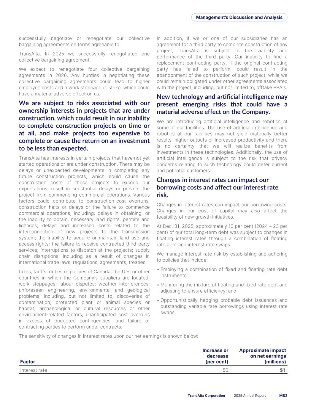 successfully negotiate or renegotiate our collective bargaining agreements on terms agreeable to TransAlta. In 2025 we successfully renegotiated one collective bargaining agreement. We expect to renegotiate four collective bargaining agreements in 2026. Any hurdles in negotiating these collective bargaining agreements could lead to higher employee costs and a work stoppage or strike, which could have a material adverse effect on us. We are subject to risks associated with our ownership interests in projects that are under construction, which could result in our inability to complete construction projects on time or at all, and make projects too expensive to complete or cause the return on an investment to be less than expected. TransAlta has interests in certain projects that have not yet started operations or are under construction. There may be delays or unexpected developments in completing any future construction projects, which could cause the construction costs of these projects to exceed our expectations, result in substantial delays or prevent the project from commencing commercial operations. Various factors could contribute to construction-cost overruns, construction halts or delays or the failure to commence commercial operations, including: delays in obtaining, or the inability to obtain, necessary land rights, permits and licences; delays and increased costs related to the interconnection of new projects to the transmission system; the inability to acquire or maintain land use and access rights; the failure to receive contracted third-party services; interruptions to dispatch at the projects; supply chain disruptions, including as a result of changes in international trade laws, regulations, agreements, treaties, taxes, tariffs, duties or policies of Canada, the U.S. or other countries in which the Company's suppliers are located; work stoppages; labour disputes; weather interferences; unforeseen engineering, environmental and geological problems, including, but not limited to, discoveries of contamination, protected plant or animal species or habitat, archaeological or cultural resources or other environment-related factors; unanticipated cost overruns in excess of budgeted contingencies; and failure of contracting parties to perform under contracts. In addition, if we or one of our subsidiaries has an agreement for a third party to complete construction of any project, TransAlta is subject to the viability and performance of the third party. Our inability to find a replacement contracting party, if the original contracting party has failed to perform, could result in the abandonment of the construction of such project, while we could remain obligated under other agreements associated with the project, including, but not limited to, offtake PPA's. New technology and artificial intelligence may present emerging risks that could have a material adverse effect on the Company. We are introducing artificial intelligence and robotics at some of our facilities. The use of artificial intelligence and robotics at our facilities may not yield materially better results, higher outputs or increased productivity and there is no certainty that we will realize benefits from investments in these technologies. Additionally, the use of artificial intelligence is subject to the risk that privacy concerns relating to such technology could deter current and potential customers. Changes in interest rates can impact our borrowing costs and affect our interest rate risk. Changes in interest rates can impact our borrowing costs. Changes in our cost of capital may also affect the feasibility of new growth initiatives. At Dec. 31, 2025, approximately 10 per cent (2024 – 23 per cent) of our total long-term debt was subject to changes in floating interest rates through a combination of floating rate debt and interest rate swaps. We manage interest rate risk by establishing and adhering to policies that include: • Employing a combination of fixed and floating rate debt instruments; • Monitoring the mixture of floating and fixed rate debt and adjusting to ensure efficiency; and • Opportunistically hedging probable debt issuances and outstanding variable rate borrowings using interest rate swaps. The sensitivity of changes in interest rates upon our net earnings is shown below: Factor Increase or decrease (per cent) Approximate impact on net earnings (millions) Interest rate 50 $1 TransAlta Corporation 2025 Annual Report M83