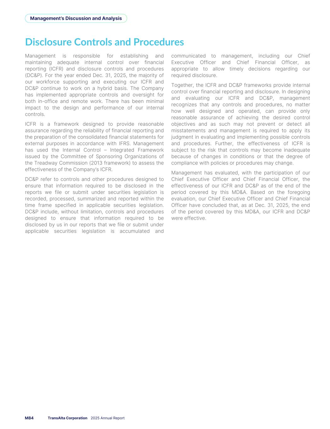 Disclosure Controls and Procedures Management is responsible for establishing and maintaining adequate internal control over financial reporting (ICFR) and disclosure controls and procedures (DC&P). For the year ended Dec. 31, 2025, the majority of our workforce supporting and executing our ICFR and DC&P continue to work on a hybrid basis. The Company has implemented appropriate controls and oversight for both in-office and remote work. There has been minimal impact to the design and performance of our internal controls. ICFR is a framework designed to provide reasonable assurance regarding the reliability of financial reporting and the preparation of the consolidated financial statements for external purposes in accordance with IFRS. Management has used the Internal Control – Integrated Framework issued by the Committee of Sponsoring Organizations of the Treadway Commission (2013 framework) to assess the effectiveness of the Company’s ICFR. DC&P refer to controls and other procedures designed to ensure that information required to be disclosed in the reports we file or submit under securities legislation is recorded, processed, summarized and reported within the time frame specified in applicable securities legislation. DC&P include, without limitation, controls and procedures designed to ensure that information required to be disclosed by us in our reports that we file or submit under applicable securities legislation is accumulated and communicated to management, including our Chief Executive Officer and Chief Financial Officer, as appropriate to allow timely decisions regarding our required disclosure. Together, the ICFR and DC&P frameworks provide internal control over financial reporting and disclosure. In designing and evaluating our ICFR and DC&P, management recognizes that any controls and procedures, no matter how well designed and operated, can provide only reasonable assurance of achieving the desired control objectives and as such may not prevent or detect all misstatements and management is required to apply its judgment in evaluating and implementing possible controls and procedures. Further, the effectiveness of ICFR is subject to the risk that controls may become inadequate because of changes in conditions or that the degree of compliance with policies or procedures may change. Management has evaluated, with the participation of our Chief Executive Officer and Chief Financial Officer, the effectiveness of our ICFR and DC&P as of the end of the period covered by this MD&A. Based on the foregoing evaluation, our Chief Executive Officer and Chief Financial Officer have concluded that, as at Dec. 31, 2025, the end of the period covered by this MD&A, our ICFR and DC&P were effective. M84 TransAlta Corporation 2025 Annual Report