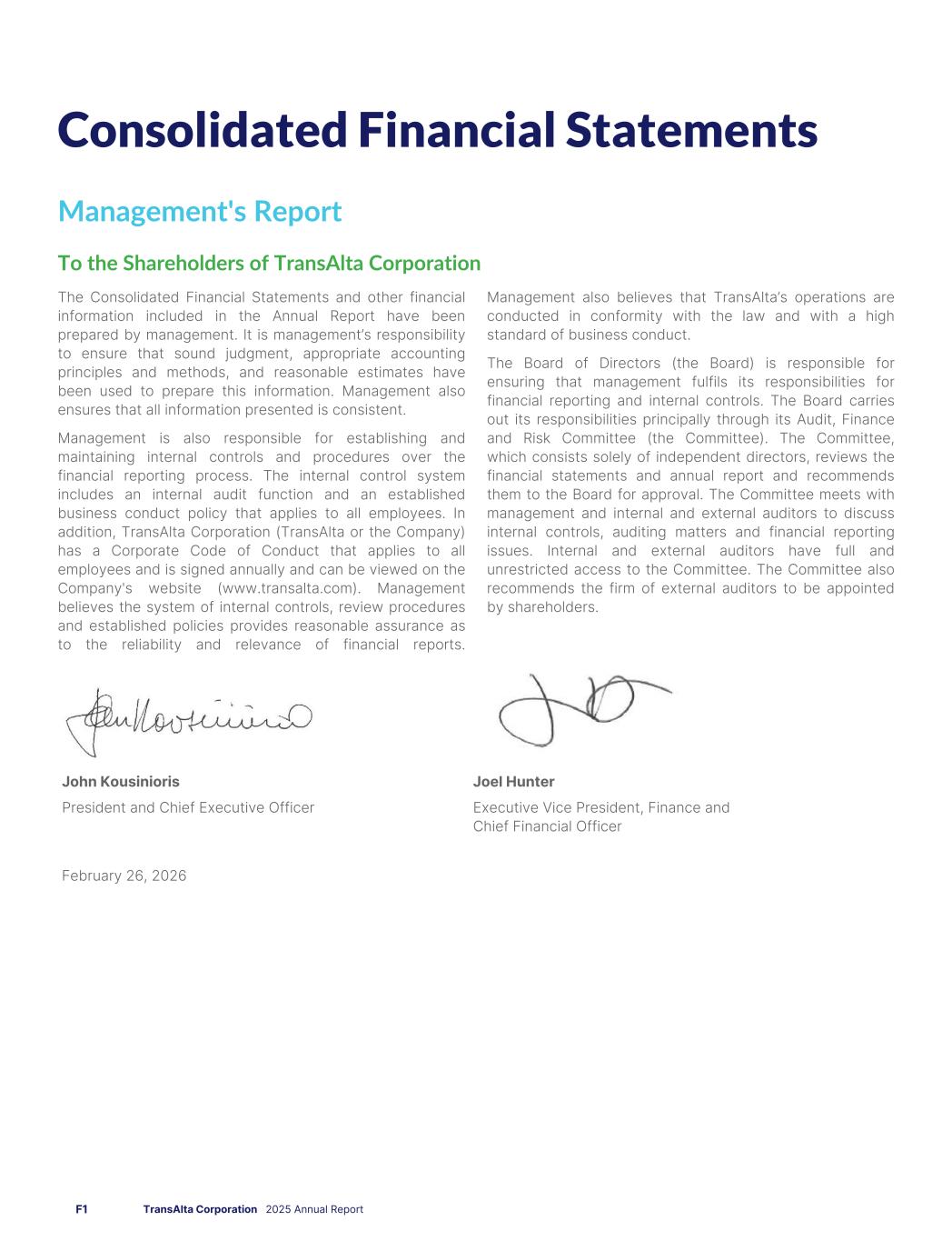 Consolidated Financial Statements Management's Report To the Shareholders of TransAlta Corporation The Consolidated Financial Statements and other financial information included in the Annual Report have been prepared by management. It is management’s responsibility to ensure that sound judgment, appropriate accounting principles and methods, and reasonable estimates have been used to prepare this information. Management also ensures that all information presented is consistent. Management is also responsible for establishing and maintaining internal controls and procedures over the financial reporting process. The internal control system includes an internal audit function and an established business conduct policy that applies to all employees. In addition, TransAlta Corporation (TransAlta or the Company) has a Corporate Code of Conduct that applies to all employees and is signed annually and can be viewed on the Company's website (www.transalta.com). Management believes the system of internal controls, review procedures and established policies provides reasonable assurance as to the reliability and relevance of financial reports. Management also believes that TransAlta’s operations are conducted in conformity with the law and with a high standard of business conduct. The Board of Directors (the Board) is responsible for ensuring that management fulfils its responsibilities for financial reporting and internal controls. The Board carries out its responsibilities principally through its Audit, Finance and Risk Committee (the Committee). The Committee, which consists solely of independent directors, reviews the financial statements and annual report and recommends them to the Board for approval. The Committee meets with management and internal and external auditors to discuss internal controls, auditing matters and financial reporting issues. Internal and external auditors have full and unrestricted access to the Committee. The Committee also recommends the firm of external auditors to be appointed by shareholders. John Kousinioris Joel Hunter President and Chief Executive Officer Executive Vice President, Finance and Chief Financial Officer February 26, 2026 F1 TransAlta Corporation 2025 Annual Report