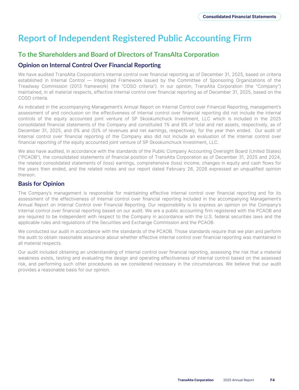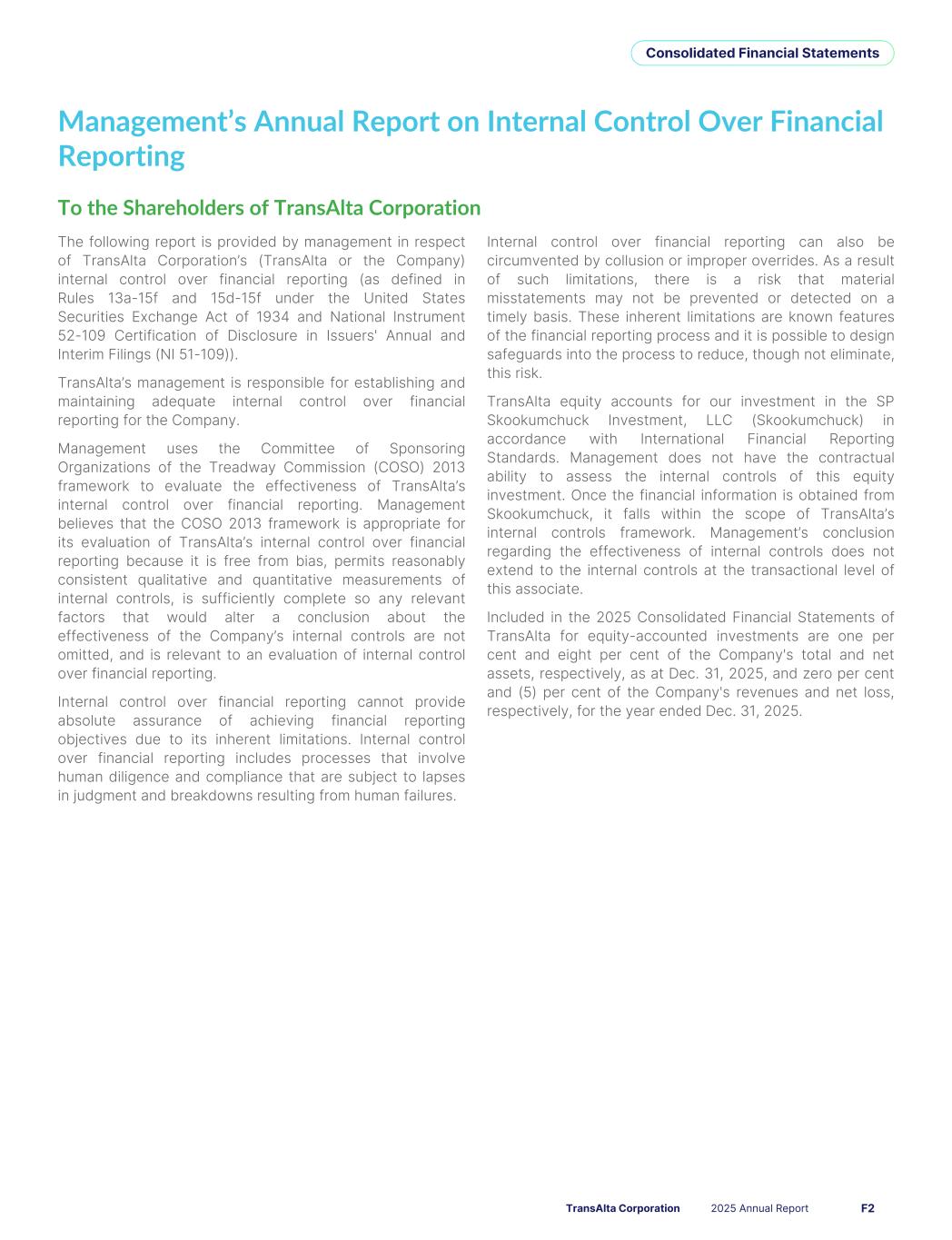Management’s Annual Report on Internal Control Over Financial Reporting To the Shareholders of TransAlta Corporation The following report is provided by management in respect of TransAlta Corporation’s (TransAlta or the Company) internal control over financial reporting (as defined in Rules  13a-15f and 15d-15f under the United States Securities Exchange Act of 1934 and National Instrument 52-109 Certification of Disclosure in Issuers' Annual and Interim Filings (NI 51-109)). TransAlta’s management is responsible for establishing and maintaining adequate internal control over financial reporting for the Company. Management uses the Committee of Sponsoring Organizations of the Treadway Commission (COSO) 2013 framework to evaluate the effectiveness of TransAlta’s internal control over financial reporting. Management believes that the COSO 2013 framework is appropriate for its evaluation of TransAlta’s internal control over financial reporting because it is free from bias, permits reasonably consistent qualitative and quantitative measurements of internal controls, is sufficiently complete so any relevant factors that would alter a conclusion about the effectiveness of the Company’s internal controls are not omitted, and is relevant to an evaluation of internal control over financial reporting. Internal control over financial reporting cannot provide absolute assurance of achieving financial reporting objectives due to its inherent limitations. Internal control over financial reporting includes processes that involve human diligence and compliance that are subject to lapses in judgment and breakdowns resulting from human failures. Internal control over financial reporting can also be circumvented by collusion or improper overrides. As a result of such limitations, there is a risk that material misstatements may not be prevented or detected on a timely basis. These inherent limitations are known features of the financial reporting process and it is possible to design safeguards into the process to reduce, though not eliminate, this risk. TransAlta equity accounts for our investment in the SP Skookumchuck Investment, LLC (Skookumchuck) in accordance with International Financial Reporting Standards. Management does not have the contractual ability to assess the internal controls of this equity investment. Once the financial information is obtained from Skookumchuck, it falls within the scope of TransAlta’s internal controls framework. Management’s conclusion regarding the effectiveness of internal controls does not extend to the internal controls at the transactional level of this associate. Included in the 2025 Consolidated Financial Statements of TransAlta for equity-accounted investments are one per cent and eight per cent of the  Company's total and net assets, respectively, as at Dec. 31, 2025, and zero per cent and (5) per cent of the Company's revenues and net loss, respectively, for the year ended Dec. 31, 2025. TransAlta Corporation 2025 Annual Report F2